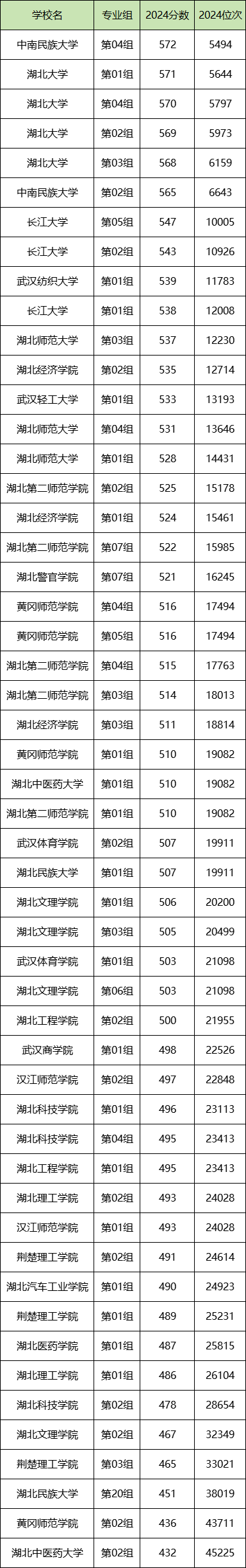 2024年湖北公办二本大学在历史类的录取分数线位于432分~572分之间(不含普通考生无法报考的特殊专业)。