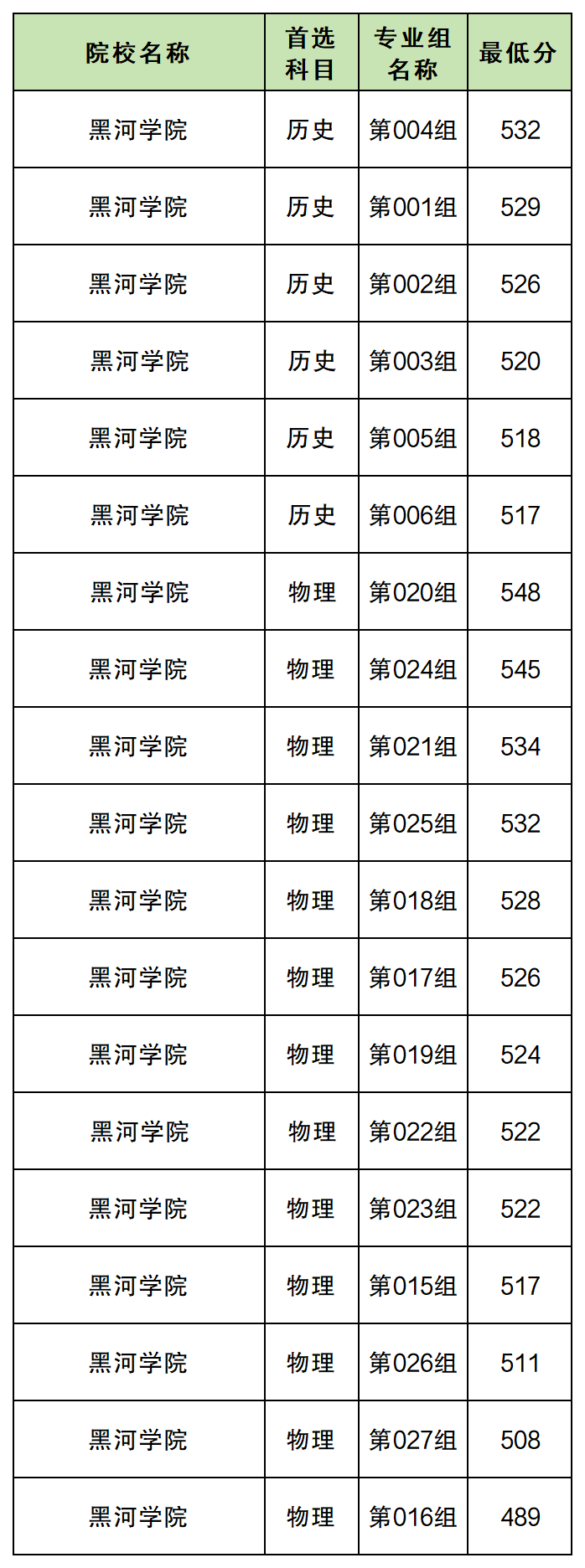 4、黑河学院2025年最低分:物理类是489分、历史类是517分。