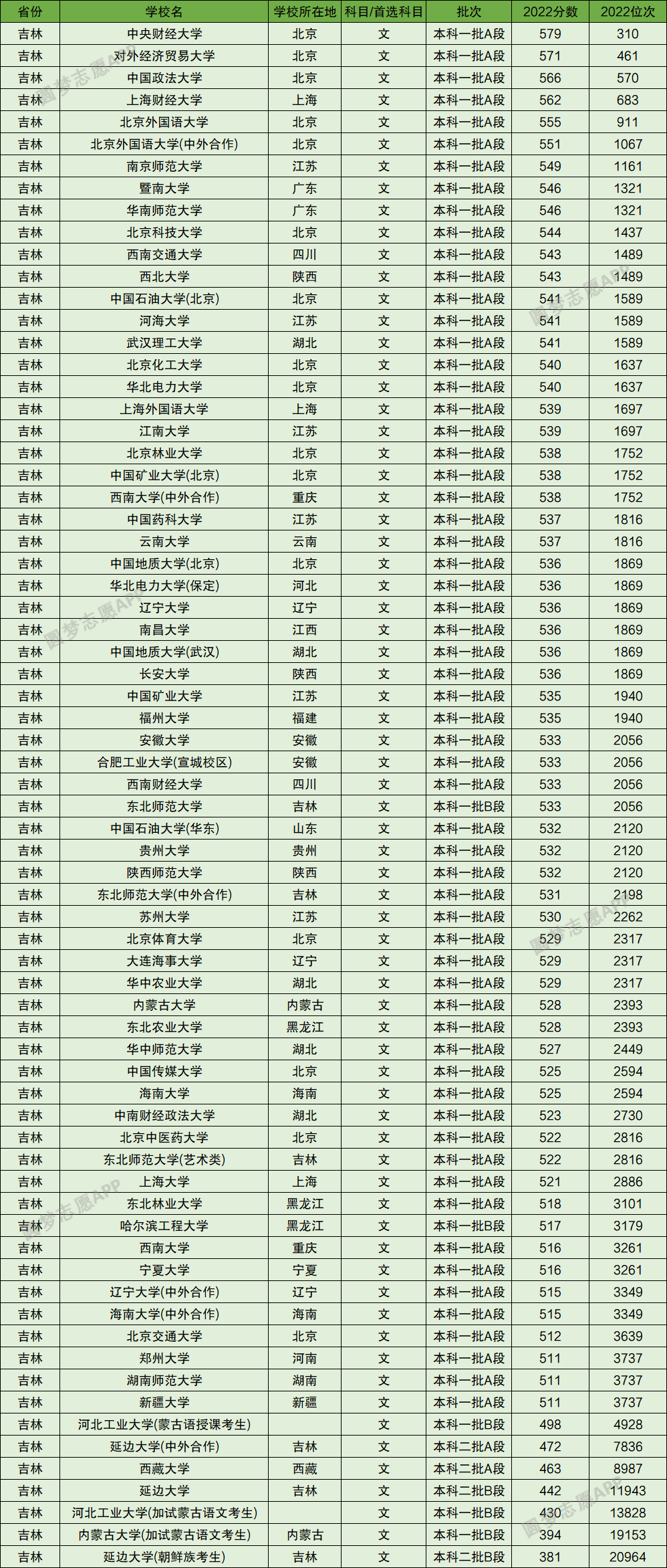 文科收分最低的是延边大学(朝鲜族考生),其2022年最低分为381分(超吉林文科二本线17分),录取位次为20964位。