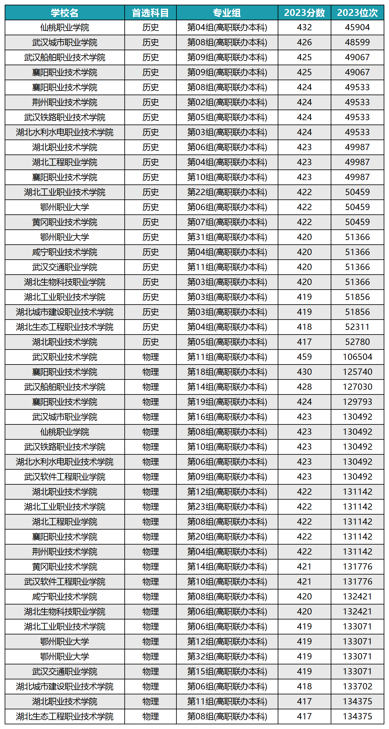 2023年湖北3+2高职联办本科招生中,物理类各所学校的分数线集中在417分到459分之间,其中武汉城市职业学院(第16组)、仙桃职业学院(第08组)、武汉铁路职业技术学院(第10组)、湖北水利水电职业技术学院(第06组)、武汉软件工程职业学院(第09组)这五所学校的分数线刚好在423分,2023年最低位次排名均为130492。