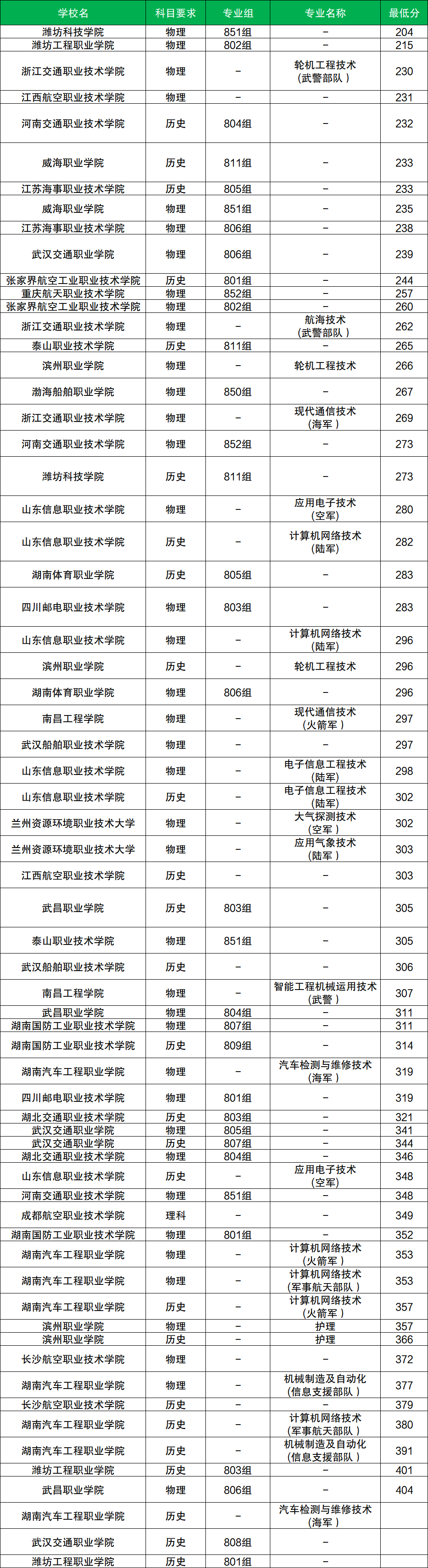 其中物理类分数至少在204分及以上、历史类分数至少在232分及以上才有机会被录取。而物理类分数最低的院校是潍坊科技学院(851组),历史类分数最低的院校是河南交通职业技术学院(804组)。