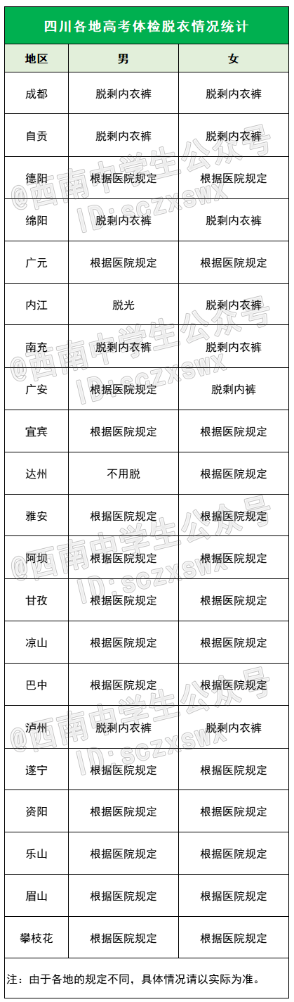 小编整理了四川各地市高考体检脱衣情况,由于各地的规定不同,具体的同学们请以实际为准。