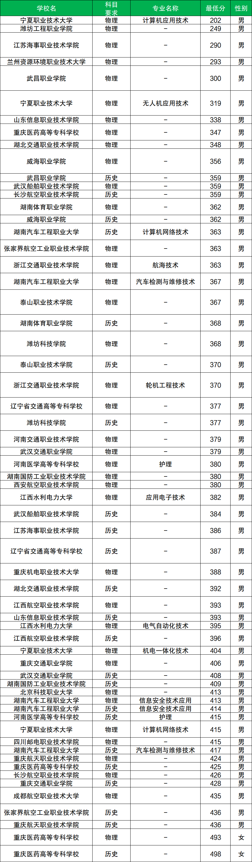 其中物理类男生分数至少在202分及以上、女生分数至少在493分及以上才有机会被录取,而物理类男生分数最低的院校是宁夏职业技术大学,物理类女生分数最低的院校是重庆医药高等专科学校。