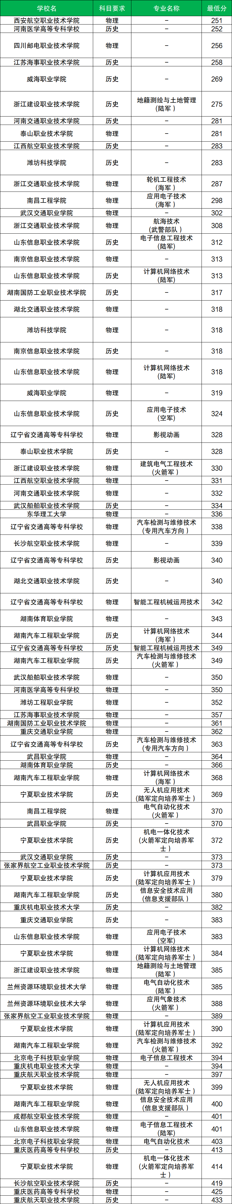其中物理类分数至少在251分及以上、历史类分数至少在252分及以上才有机会被录取。而物理类分数最低的院校是西安航空职业技术学院,历史类分数最低的院校是河南医学高等专科学校。