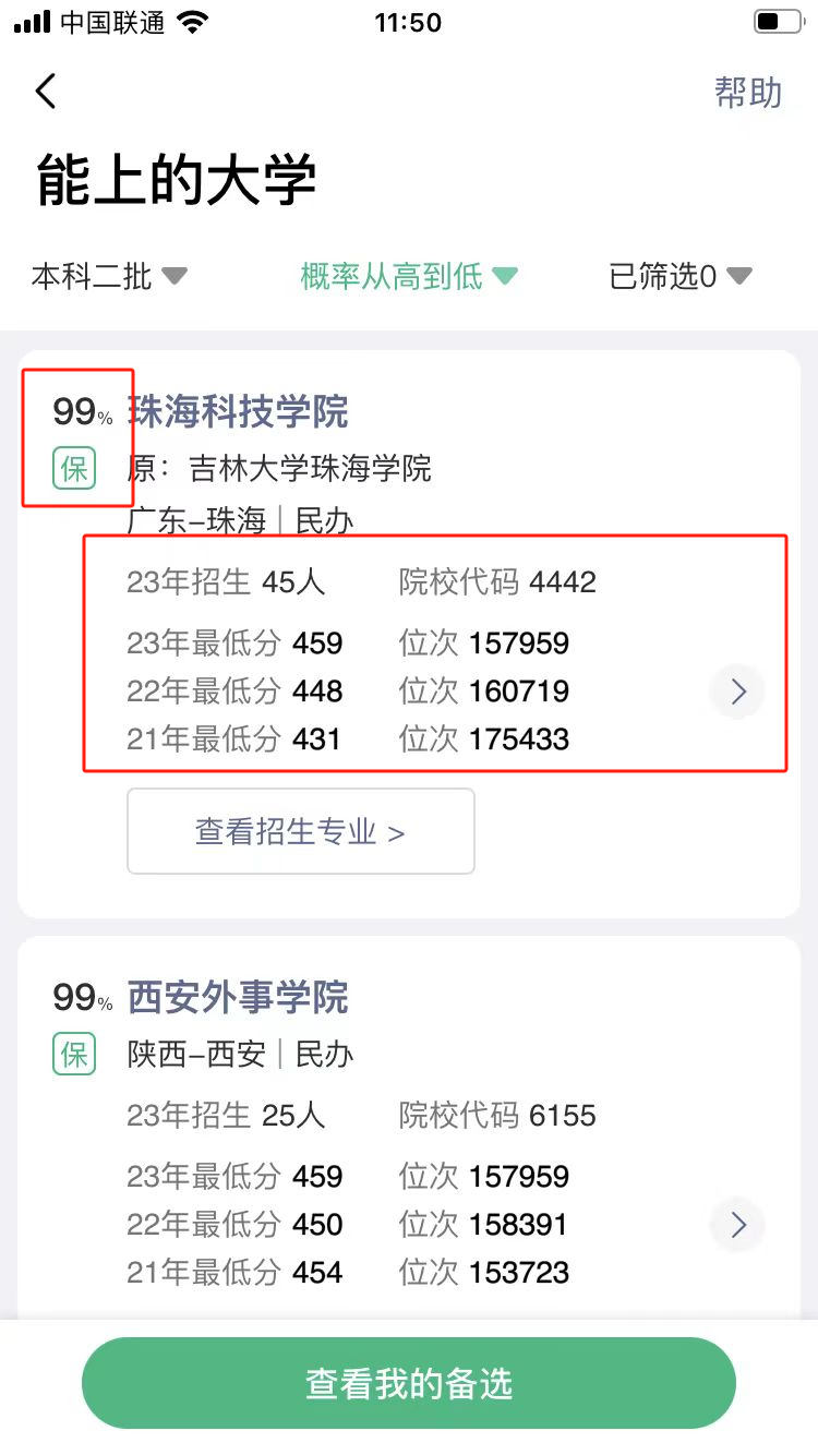 第二步,完成第一步的操作后,如上图所示,点击“马上看”,查看自己的分数匹配的大学名单,并根据个人需求筛选出适合自己的大学院校名单。