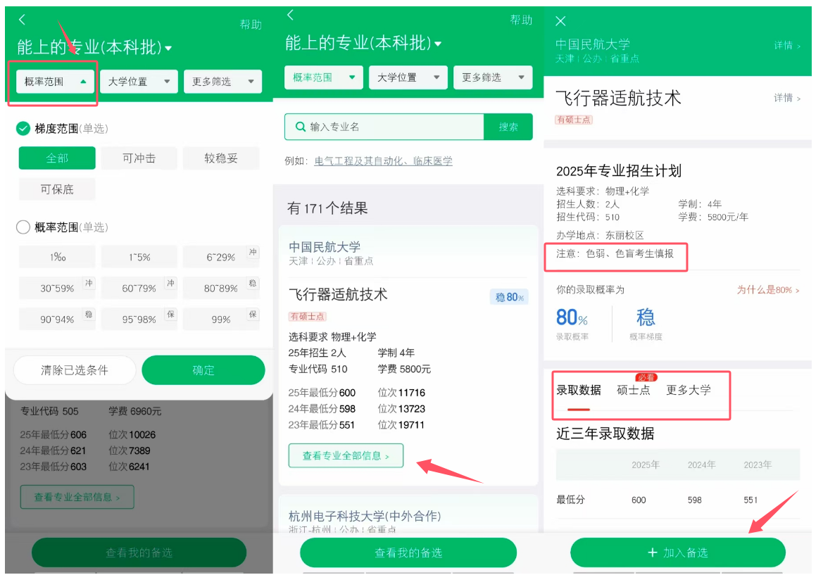 第三步,将预测出的大学及专业结果,添加到备选中,方便大家随时查找。