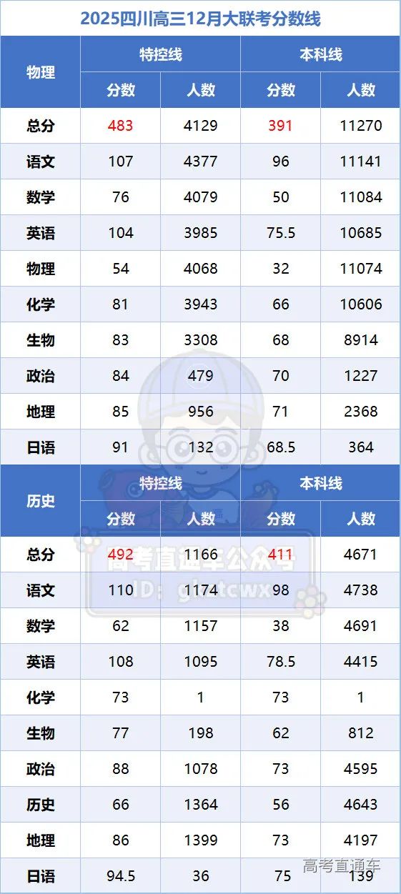 特控线:物理组483分、历史组492分;