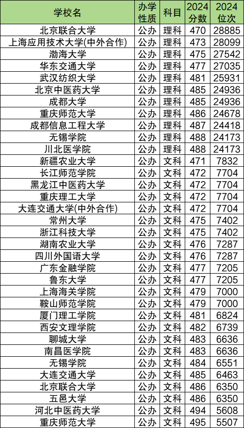 在470分-500分范围内的二本大学,最低分都是470分,也就是说实际能报考的二本大学分数范围为470分-500分。