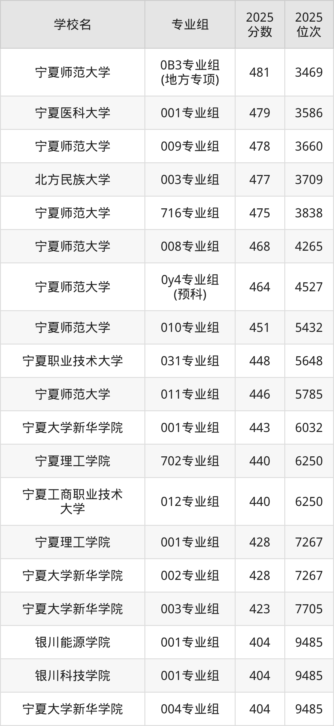 其中,分数线排名第一的二本大学是宁夏师范大学0B3专业组(地方专项),除此之外,收分较高的院校还有:宁夏医科大学001专业组479分、宁夏师范大学009专业组478分、北方民族大学003专业组477分、宁夏师范大学716专业组475分。