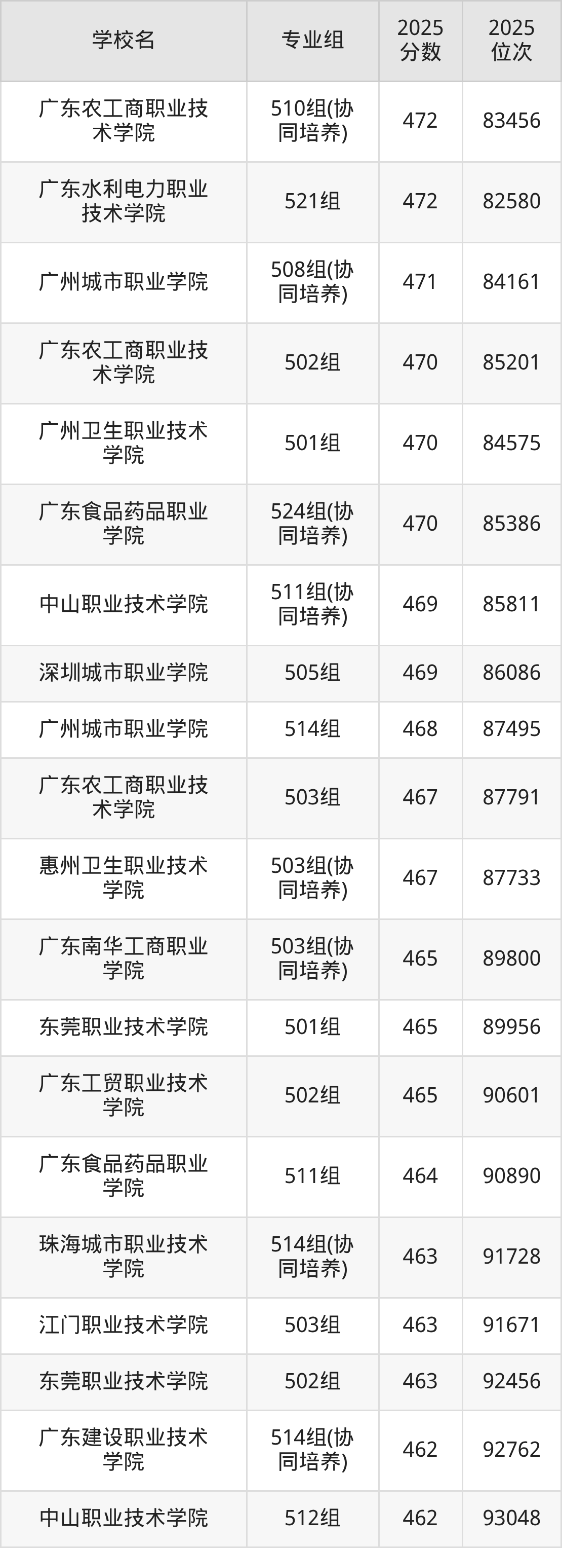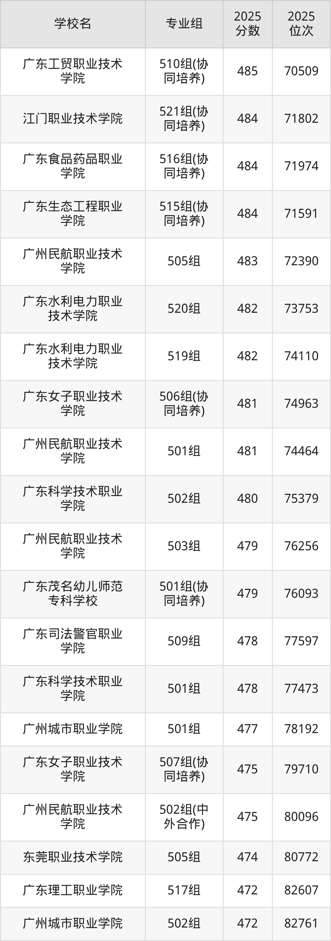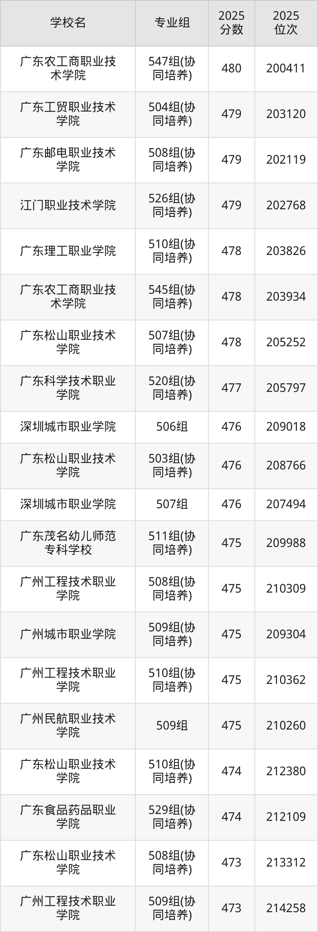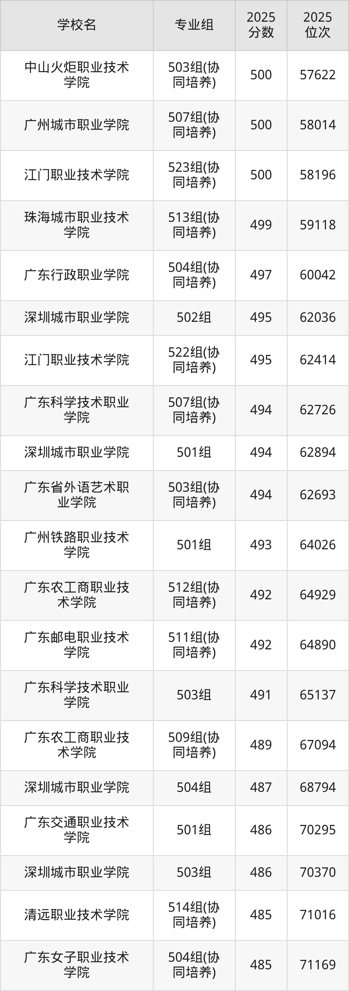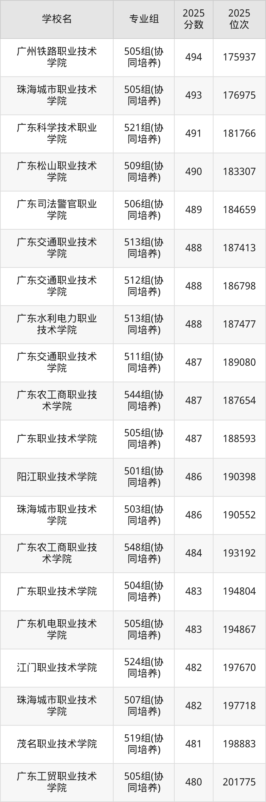 其中,分数线排名第一的公办大专院校是广州铁路职业技术学院505组(协同培养),除此之外,收分较高的院校还有:珠海城市职业技术学院505组(协同培养)493分、广东科学技术职业学院521组(协同培养)491分、广东松山职业技术学院509组(协同培养)490分、广东司法警官职业学院506组(协同培养)489分。