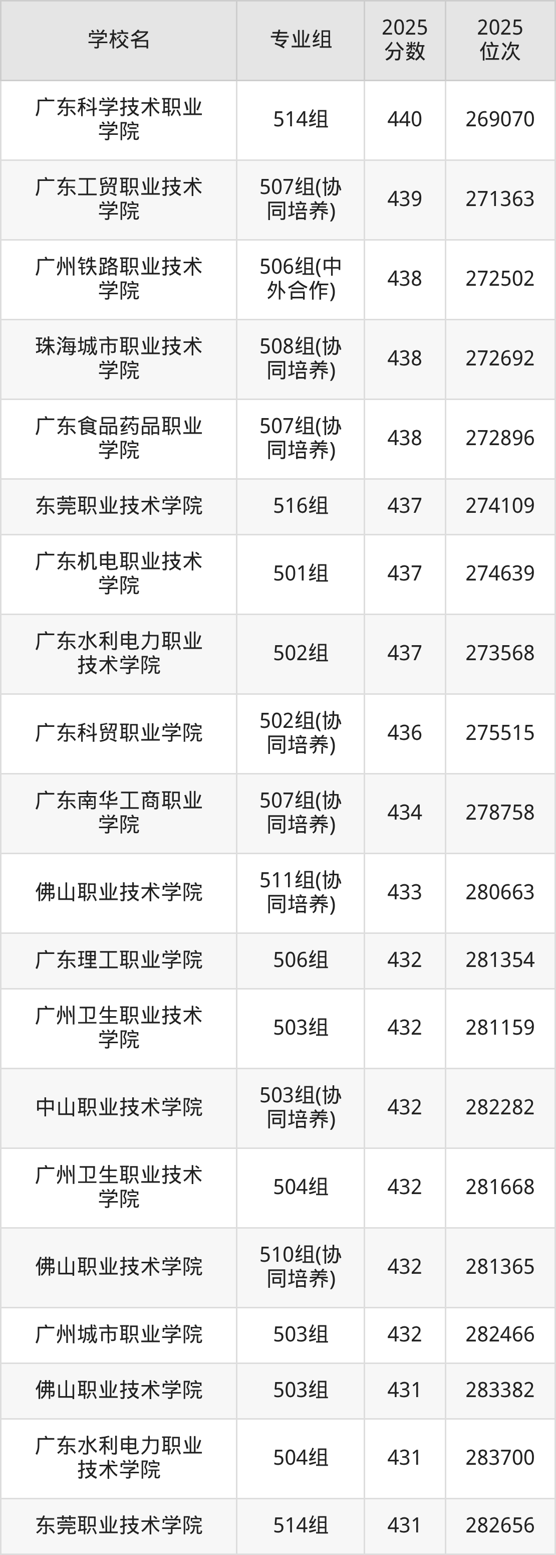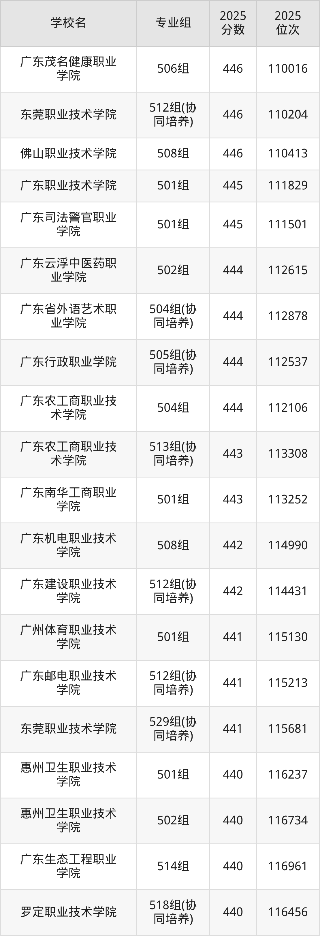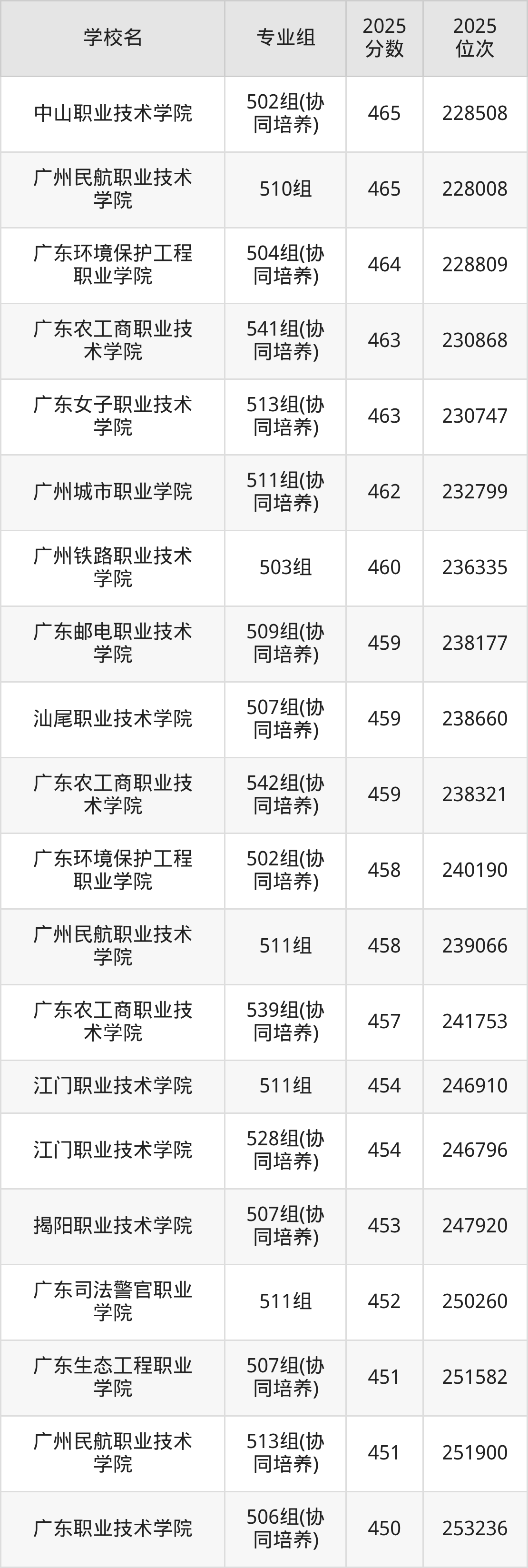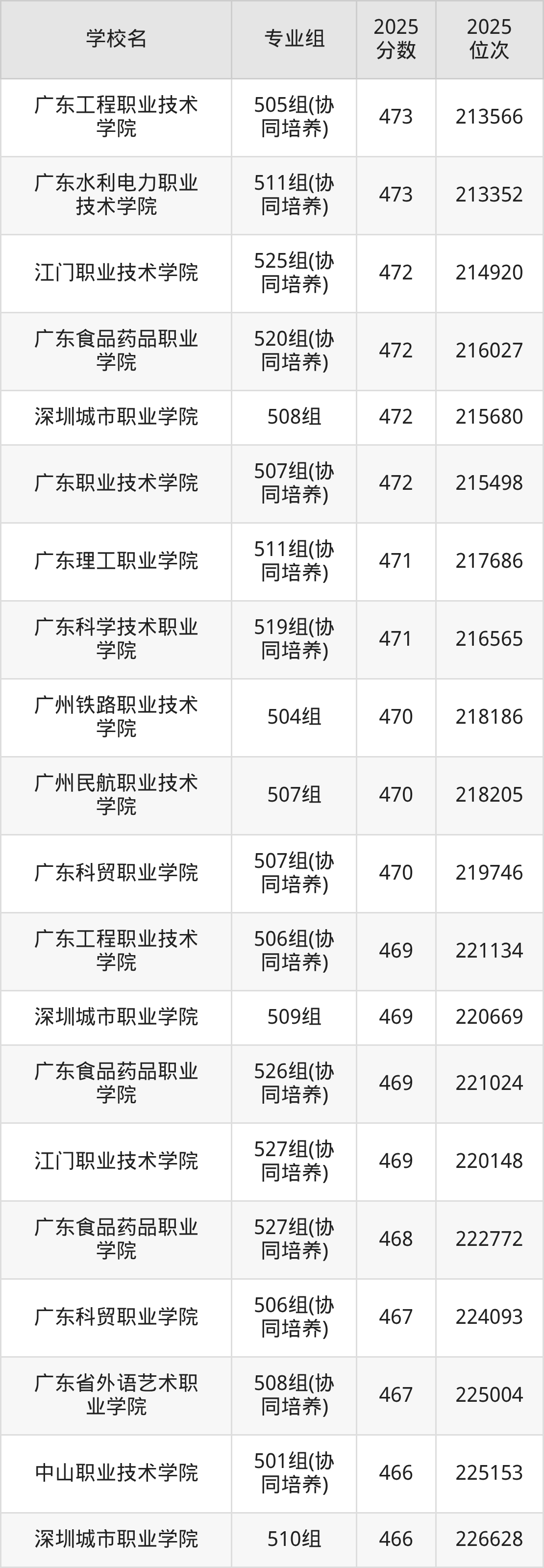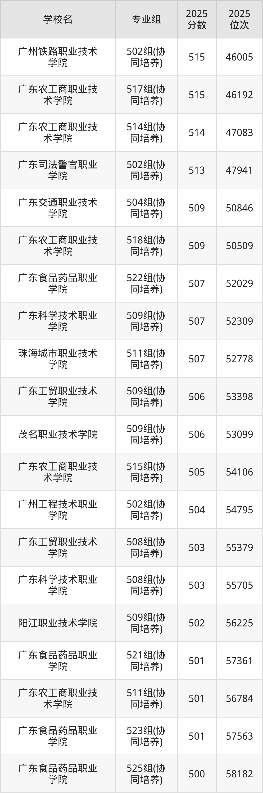其中,分数线排名第一的公办大专院校是广州铁路职业技术学院505组(协同培养),除此之外,收分较高的院校还有:珠海城市职业技术学院505组(协同培养)493分、广东科学技术职业学院521组(协同培养)491分、广东松山职业技术学院509组(协同培养)490分、广东司法警官职业学院506组(协同培养)489分。