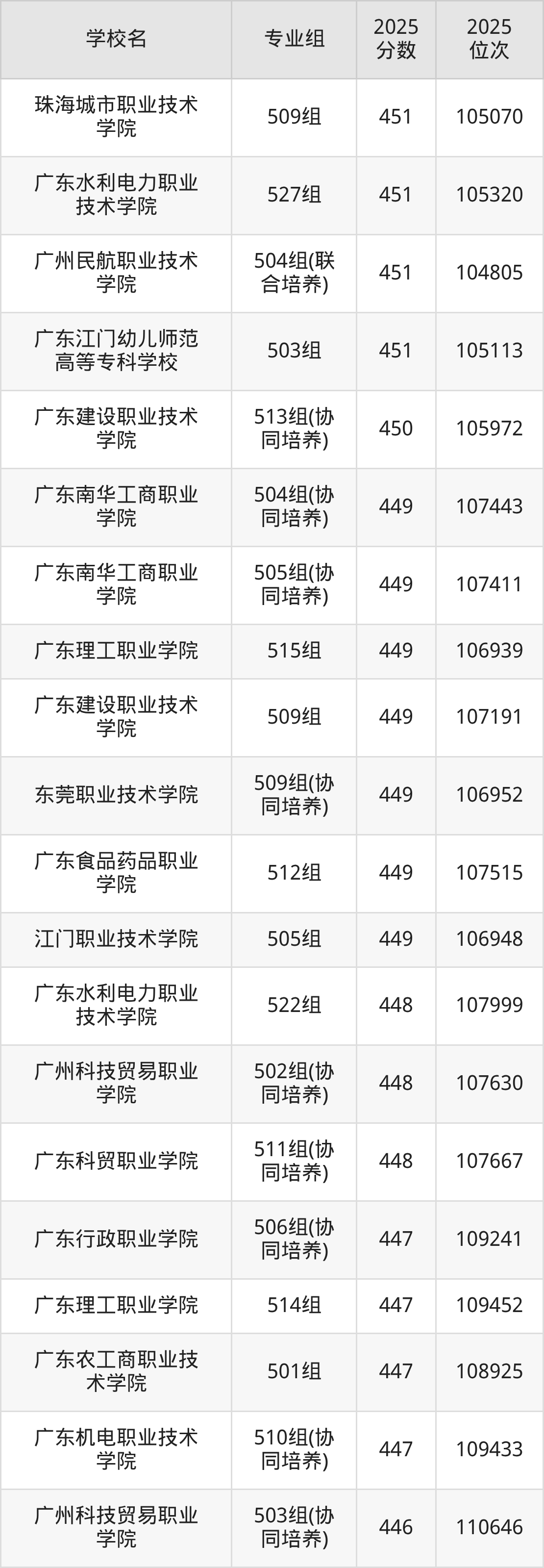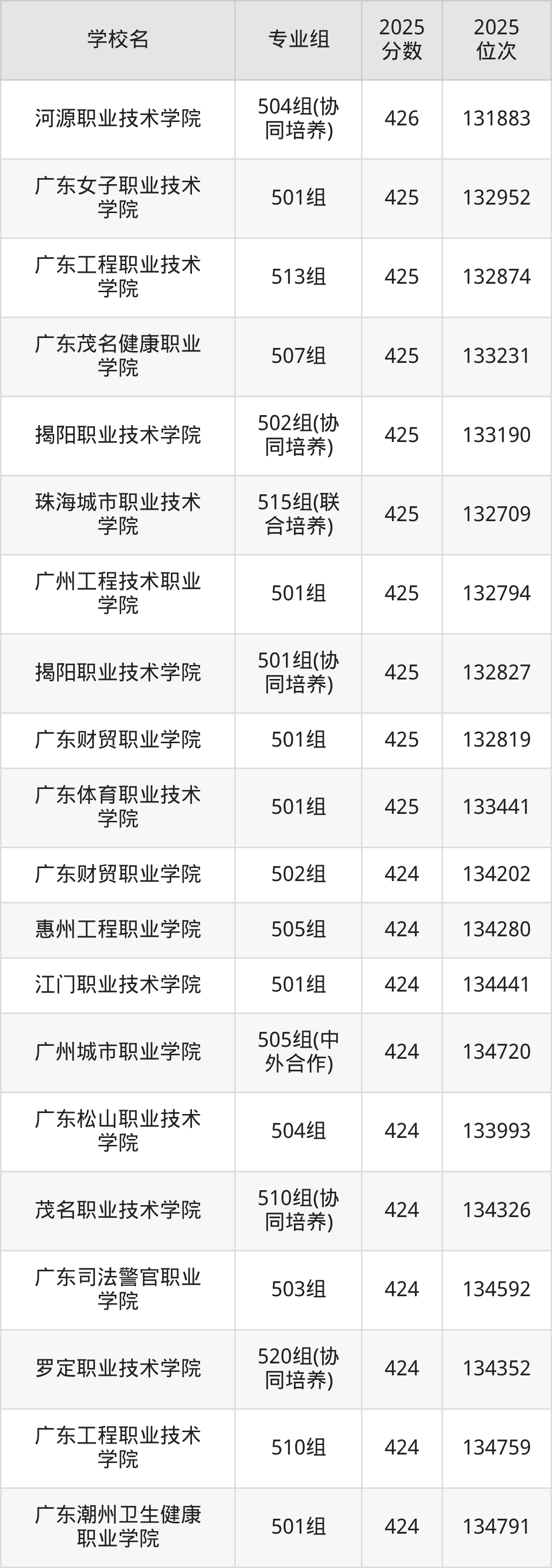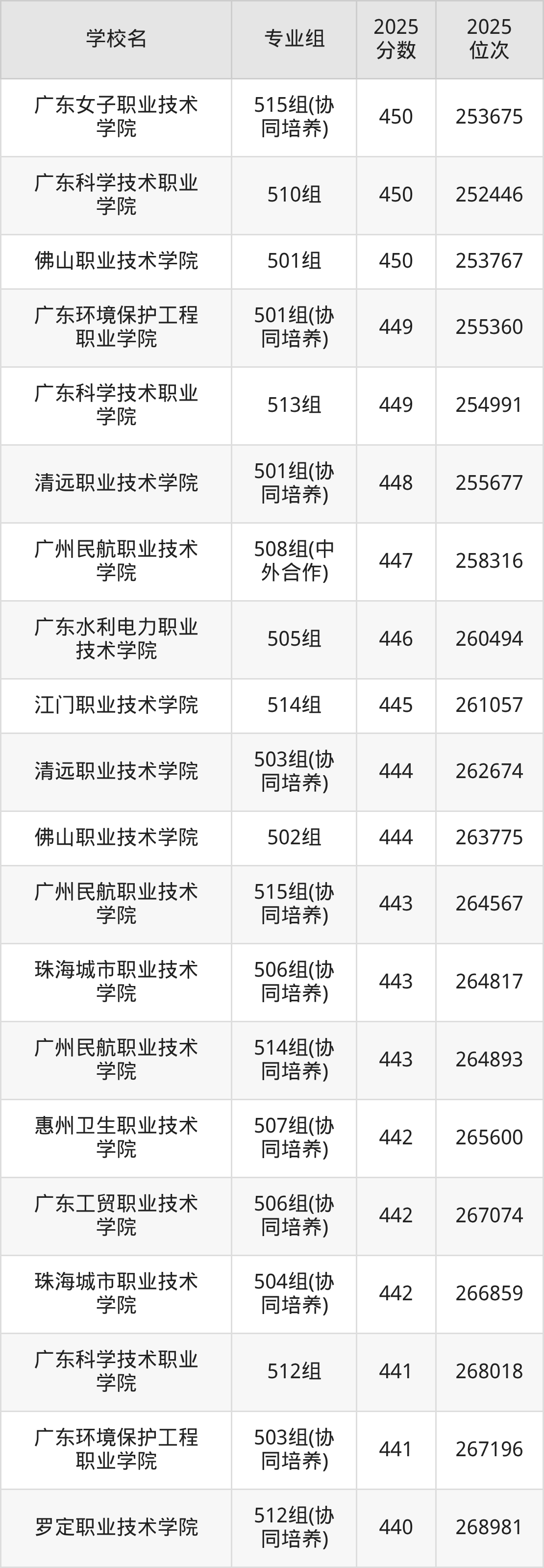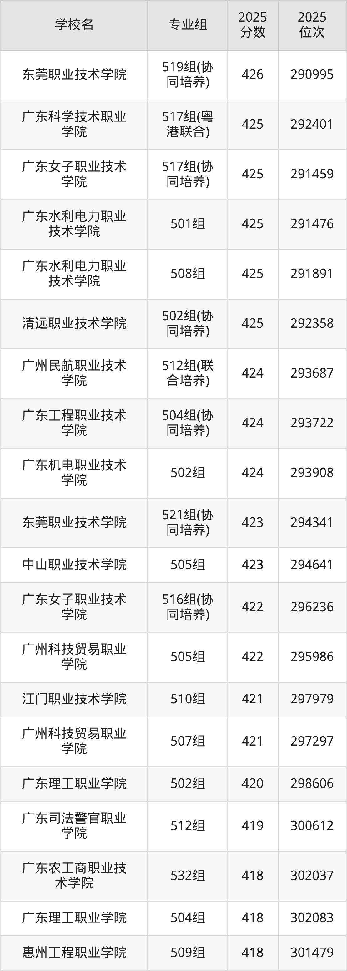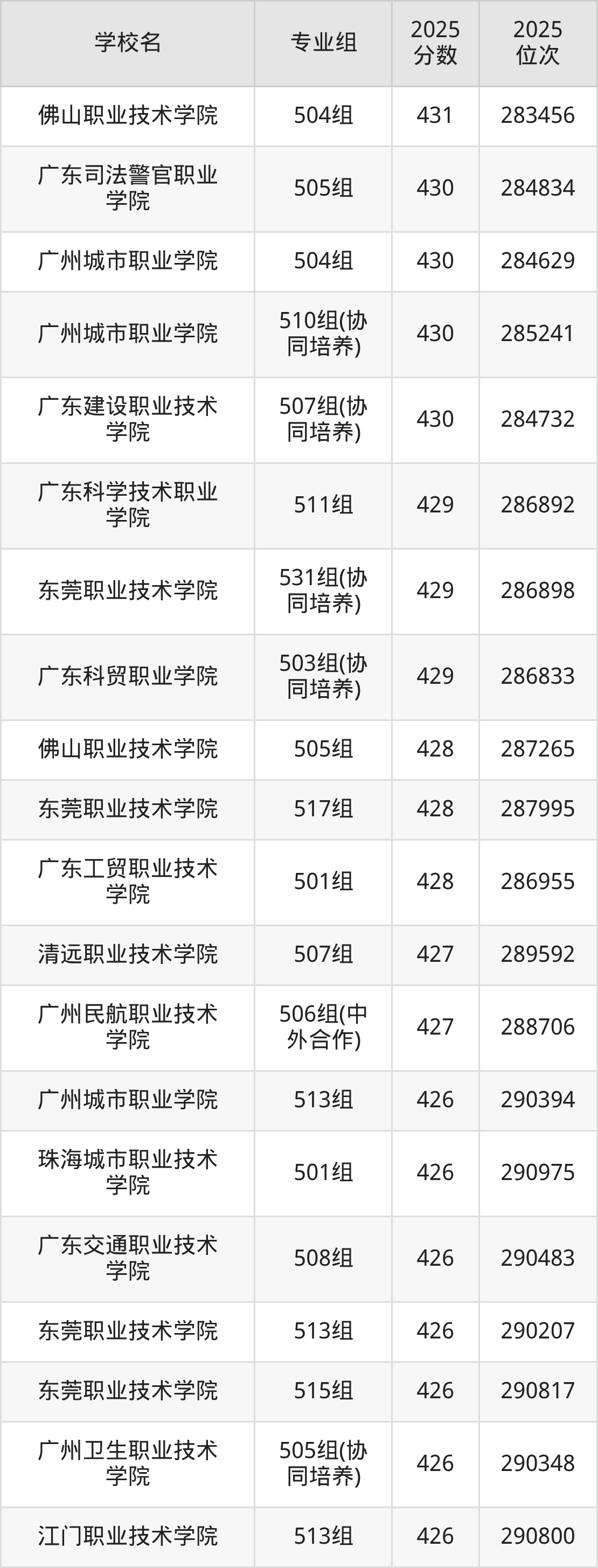其中,分数线排名第一的公办大专院校是广州铁路职业技术学院505组(协同培养),除此之外,收分较高的院校还有:珠海城市职业技术学院505组(协同培养)493分、广东科学技术职业学院521组(协同培养)491分、广东松山职业技术学院509组(协同培养)490分、广东司法警官职业学院506组(协同培养)489分。