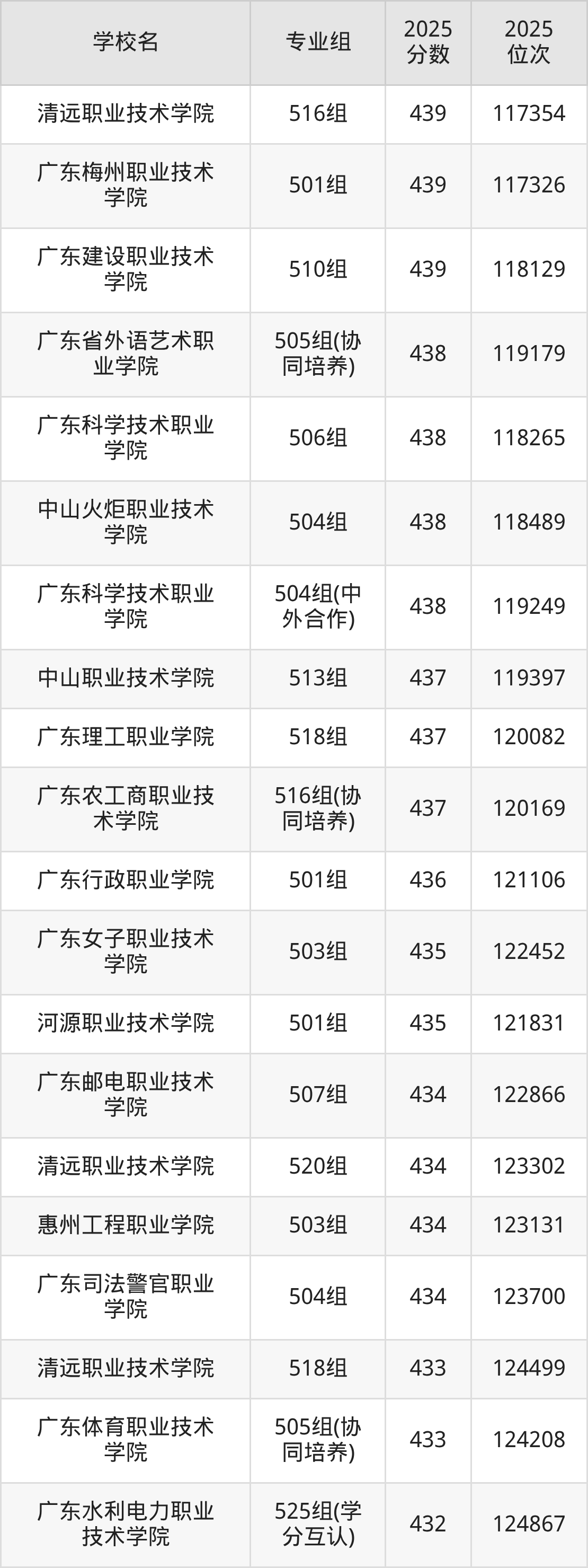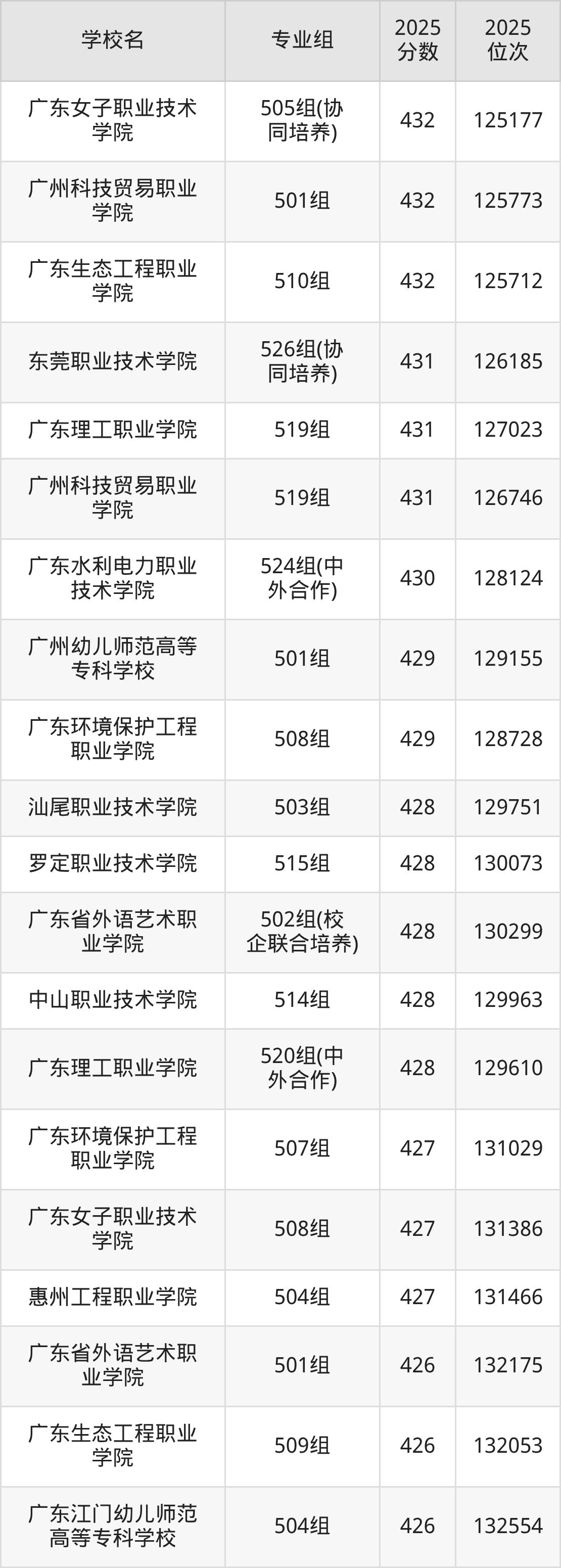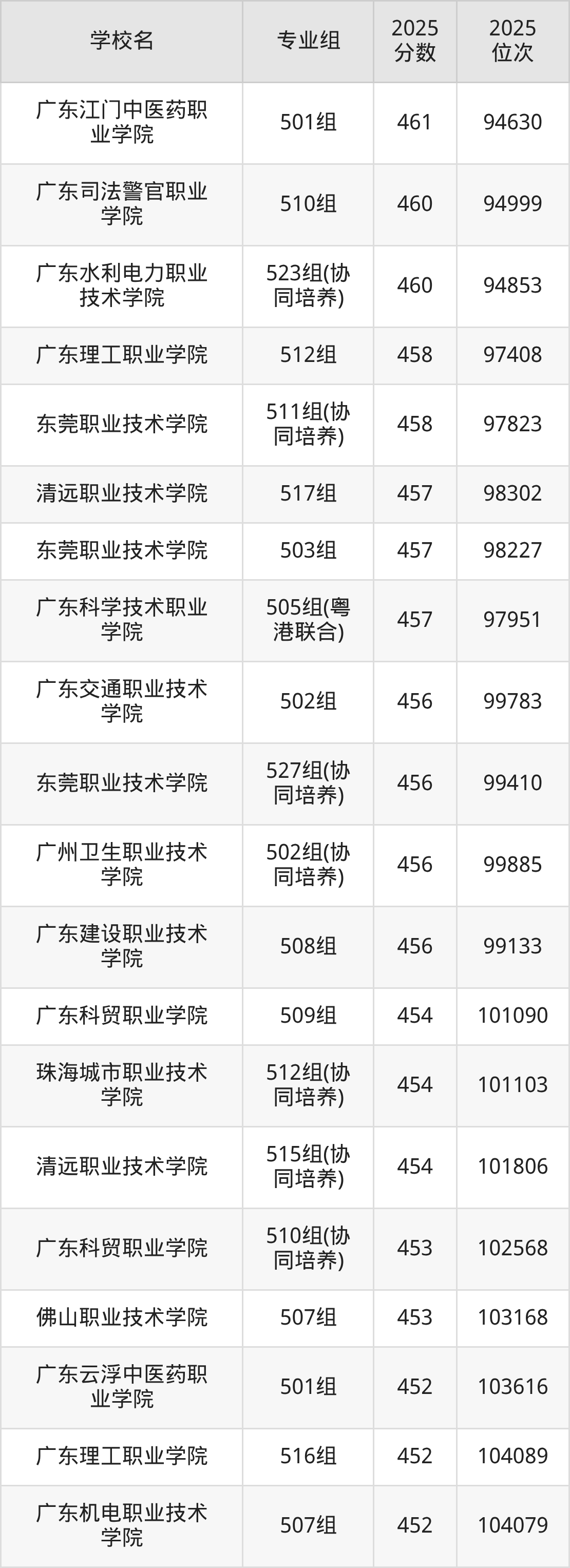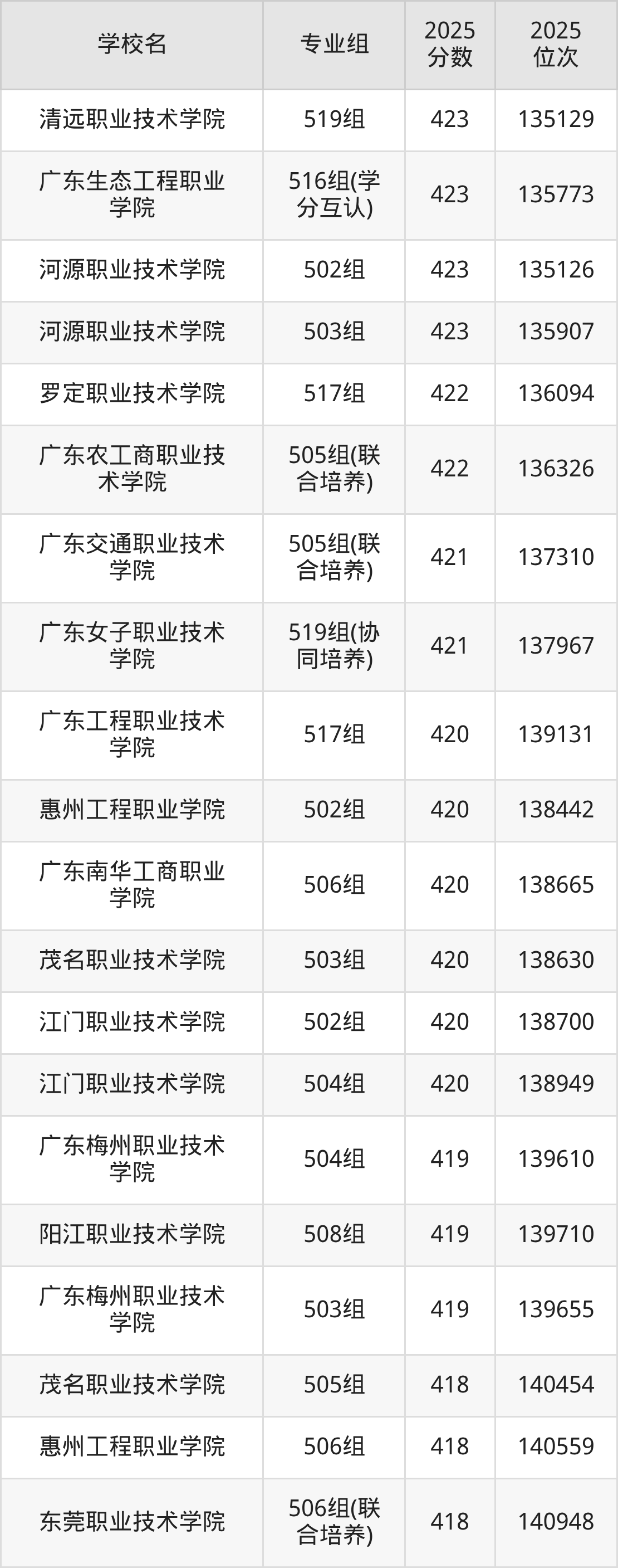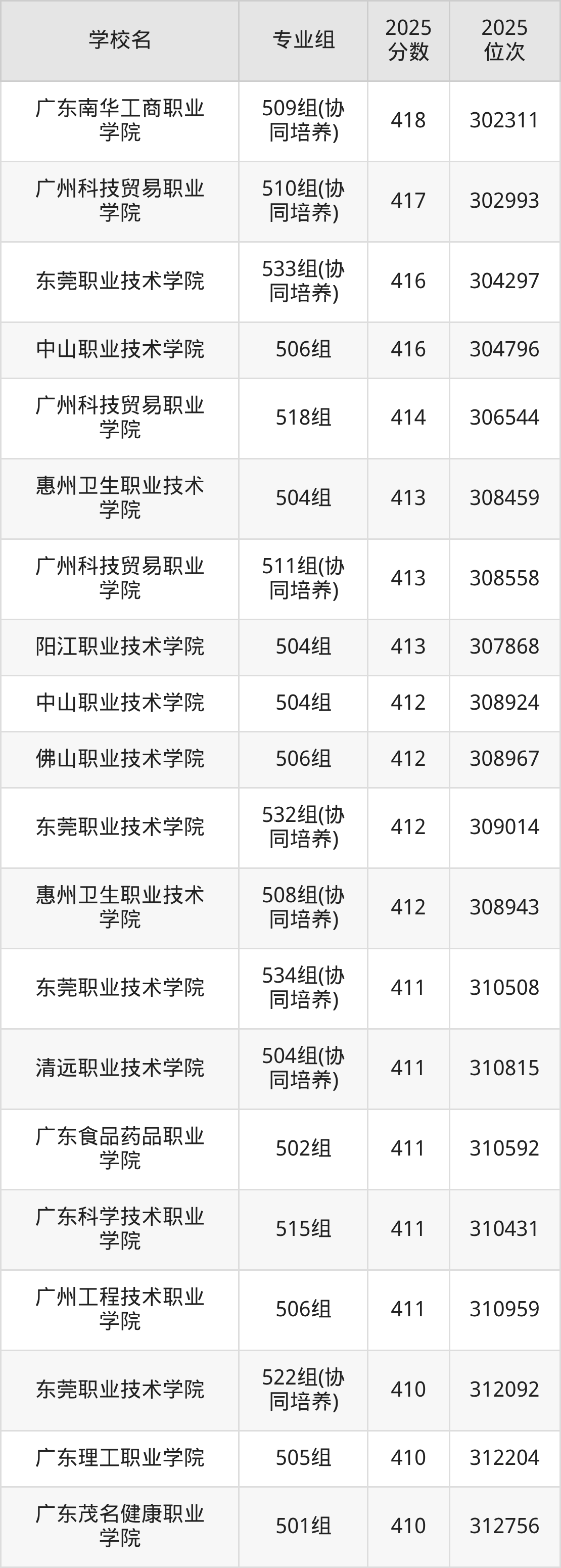 其中,分数线排名第一的公办大专院校是广州铁路职业技术学院505组(协同培养),除此之外,收分较高的院校还有:珠海城市职业技术学院505组(协同培养)493分、广东科学技术职业学院521组(协同培养)491分、广东松山职业技术学院509组(协同培养)490分、广东司法警官职业学院506组(协同培养)489分。