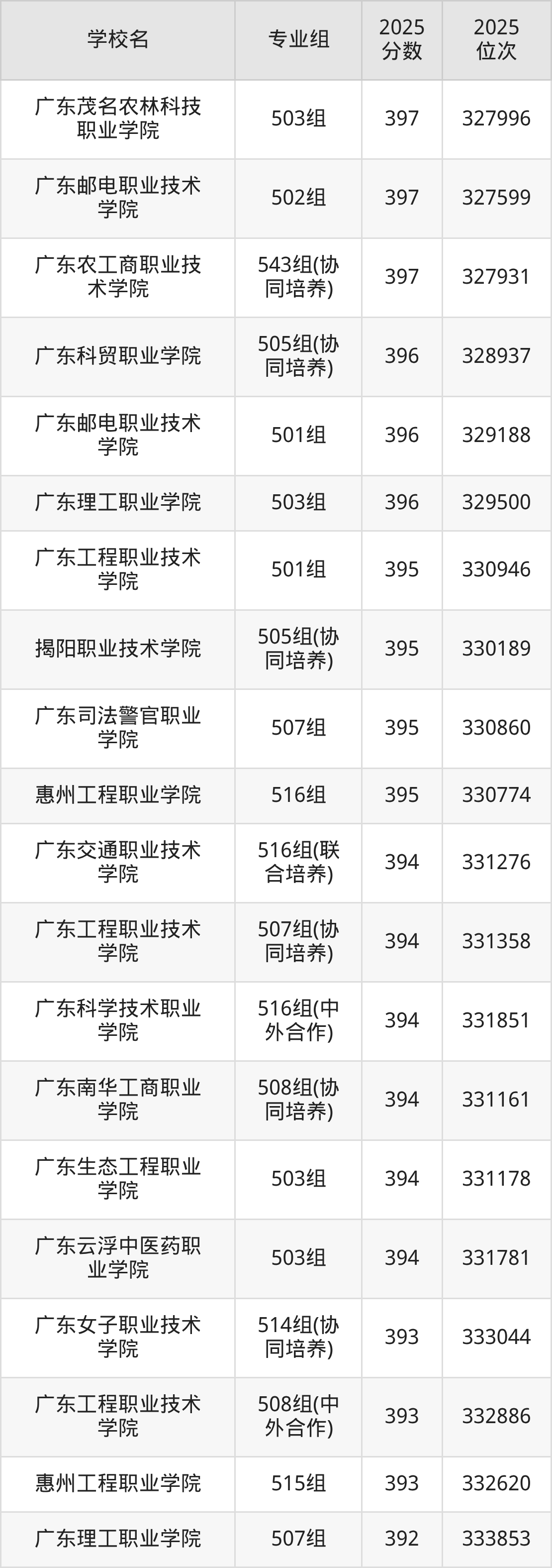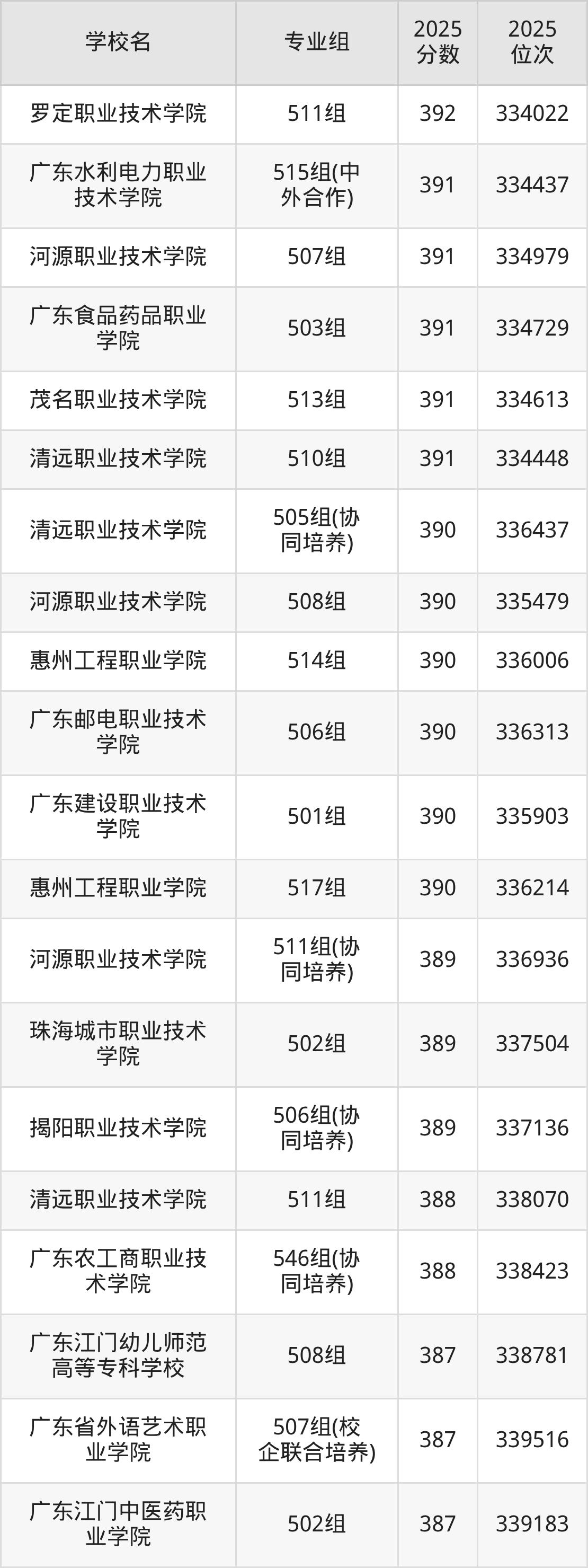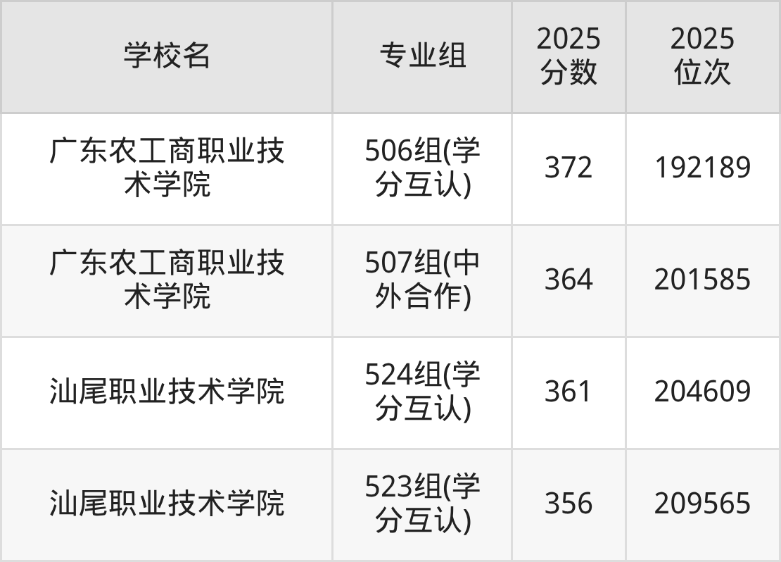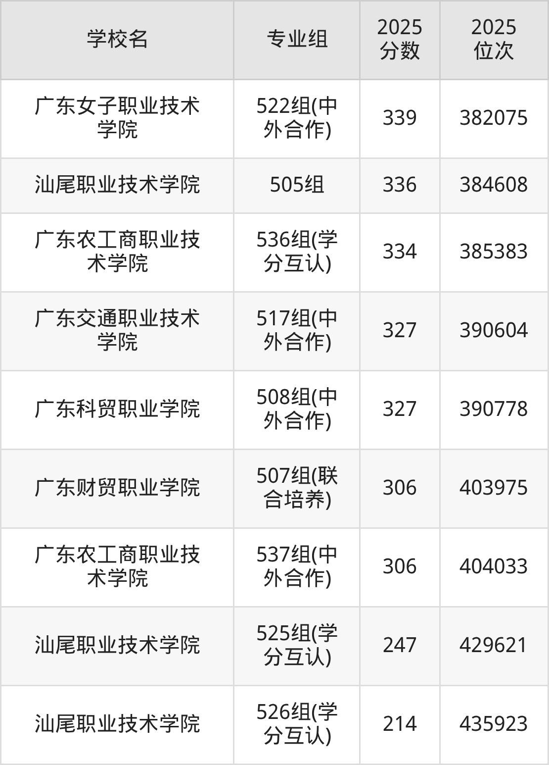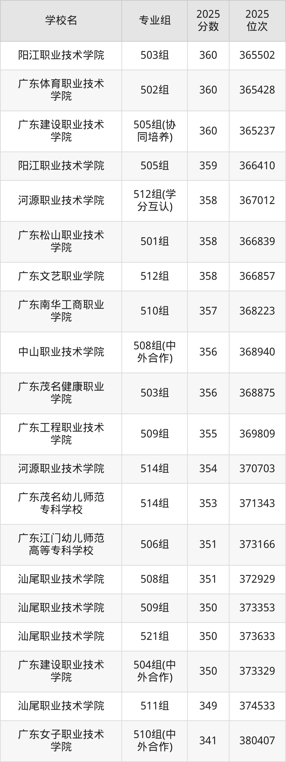 分数线排名最后的公办大专院校是汕尾职业技术学院526组(学分互认)(214分),除此之外,收分较低的院校还有:汕尾职业技术学院525组(学分互认)247分、广东农工商职业技术学院537组(中外合作)306分、广东财贸职业学院507组(联合培养)306分、广东科贸职业学院508组(中外合作)327分。