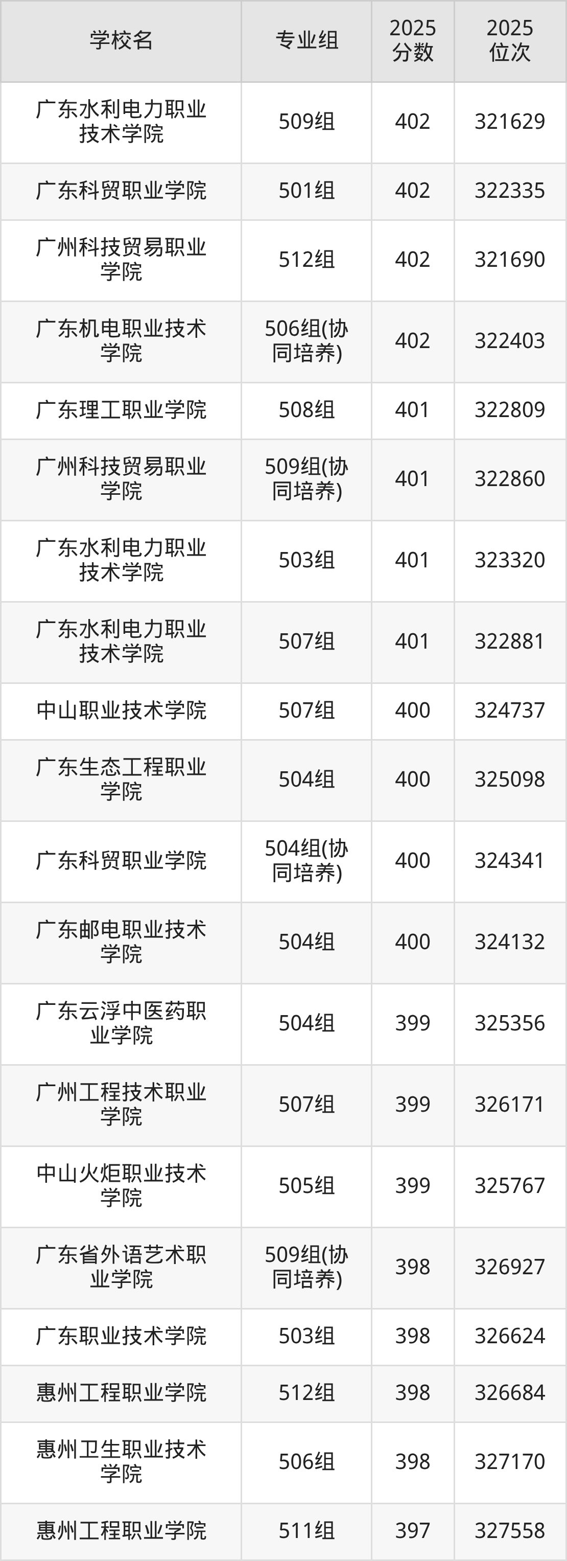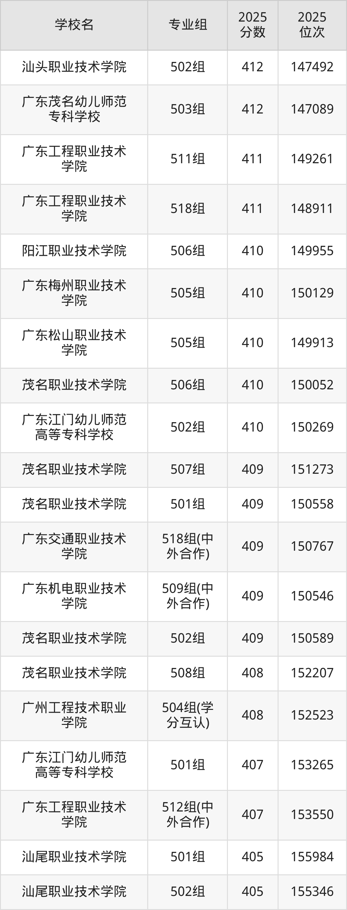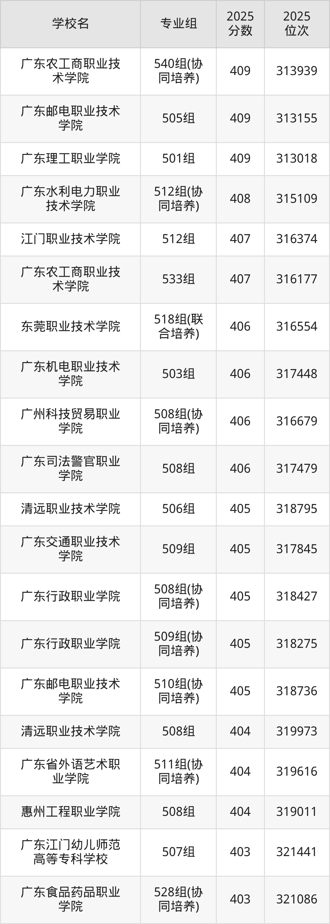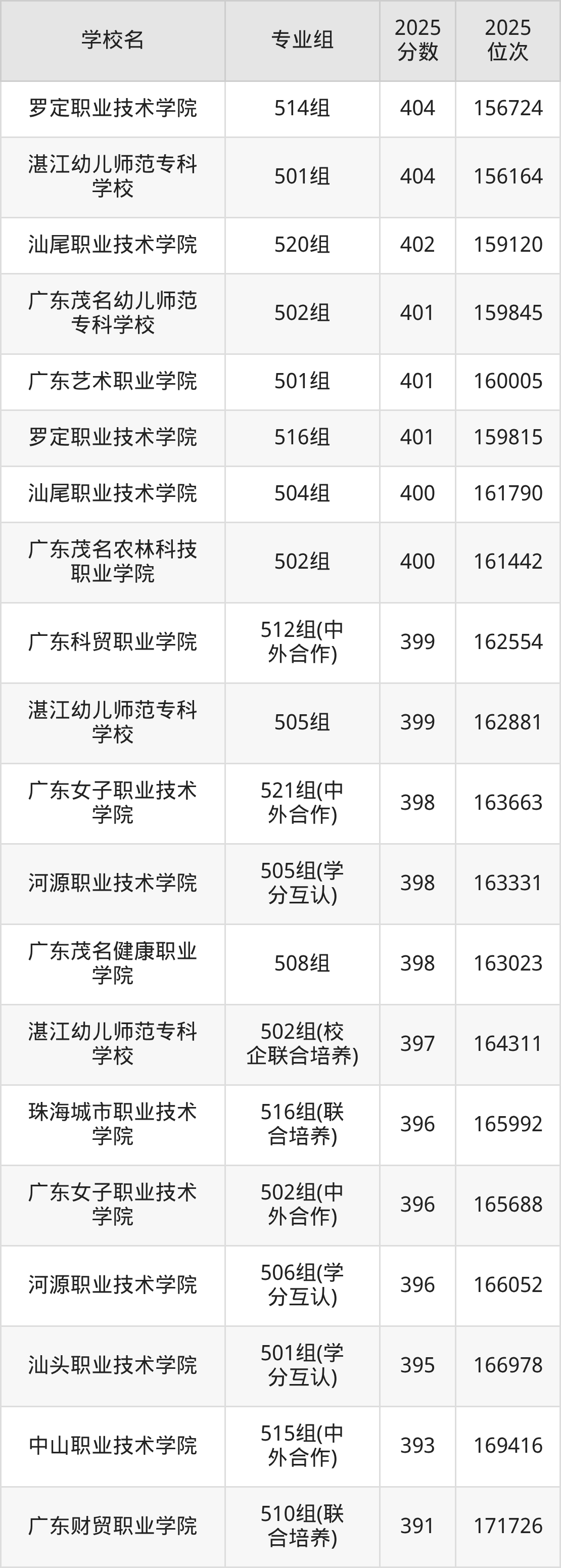 分数线排名最后的公办大专院校是汕尾职业技术学院526组(学分互认)(214分),除此之外,收分较低的院校还有:汕尾职业技术学院525组(学分互认)247分、广东农工商职业技术学院537组(中外合作)306分、广东财贸职业学院507组(联合培养)306分、广东科贸职业学院508组(中外合作)327分。