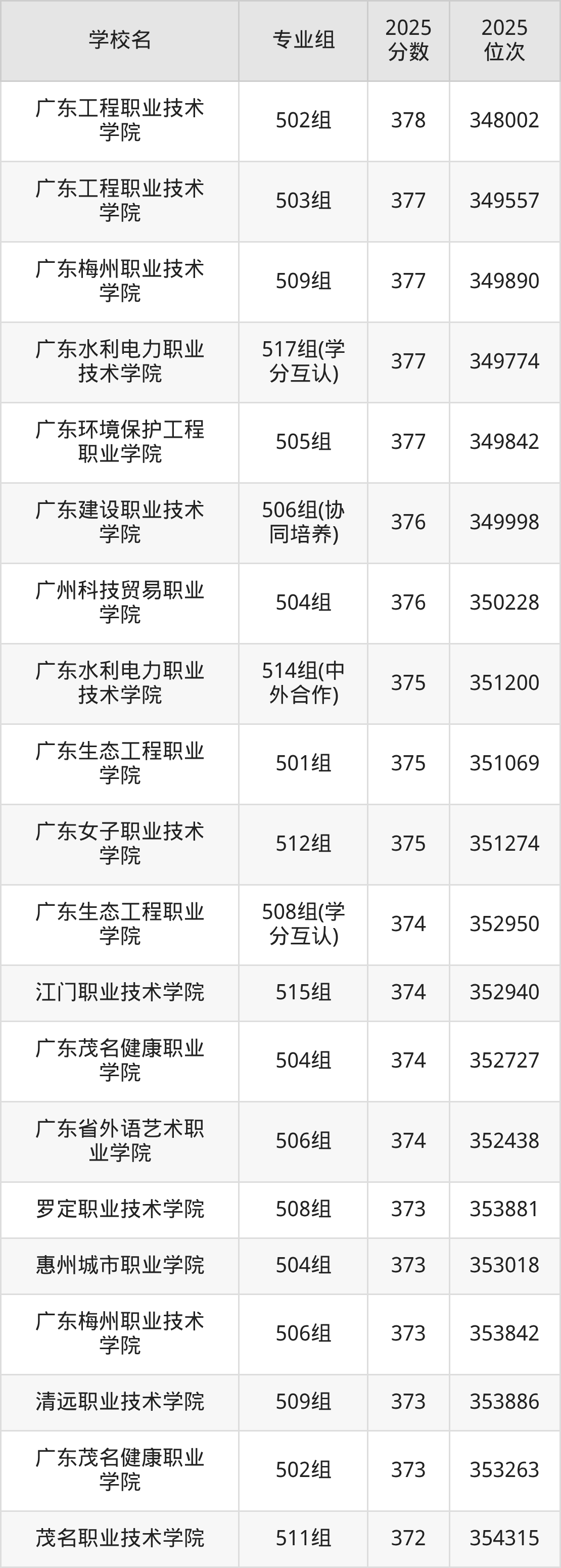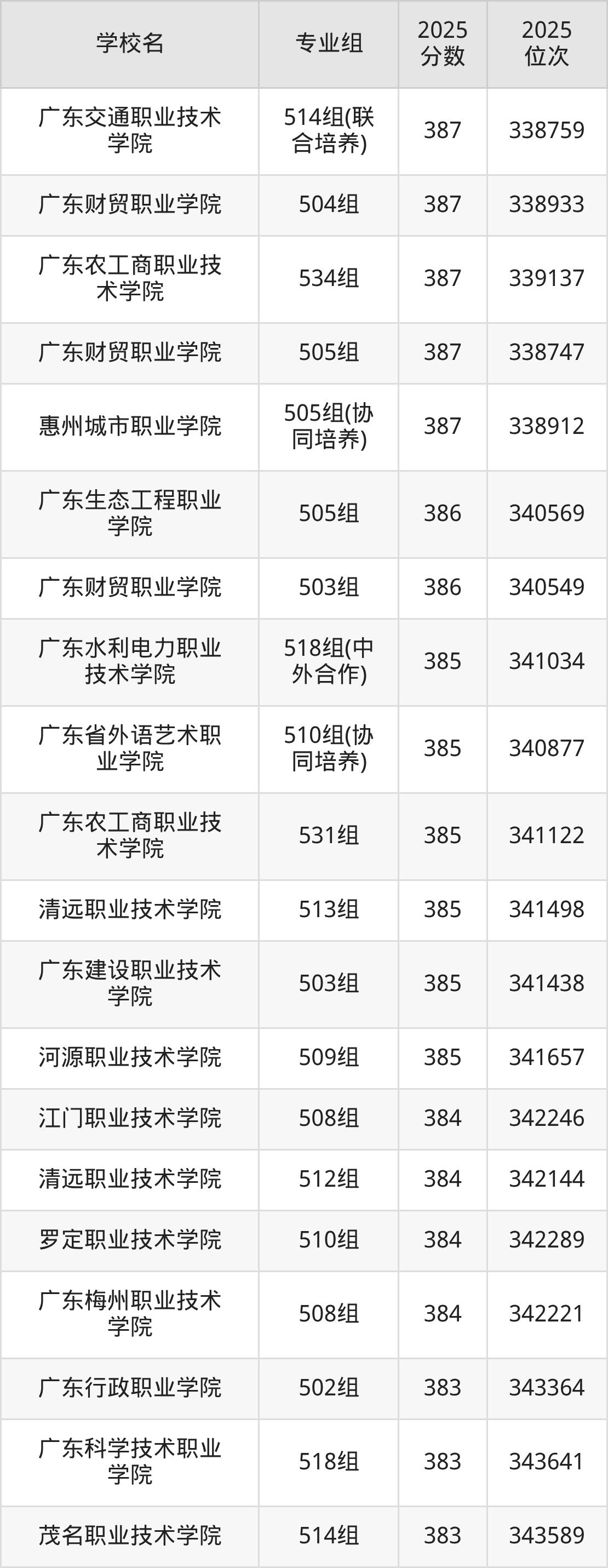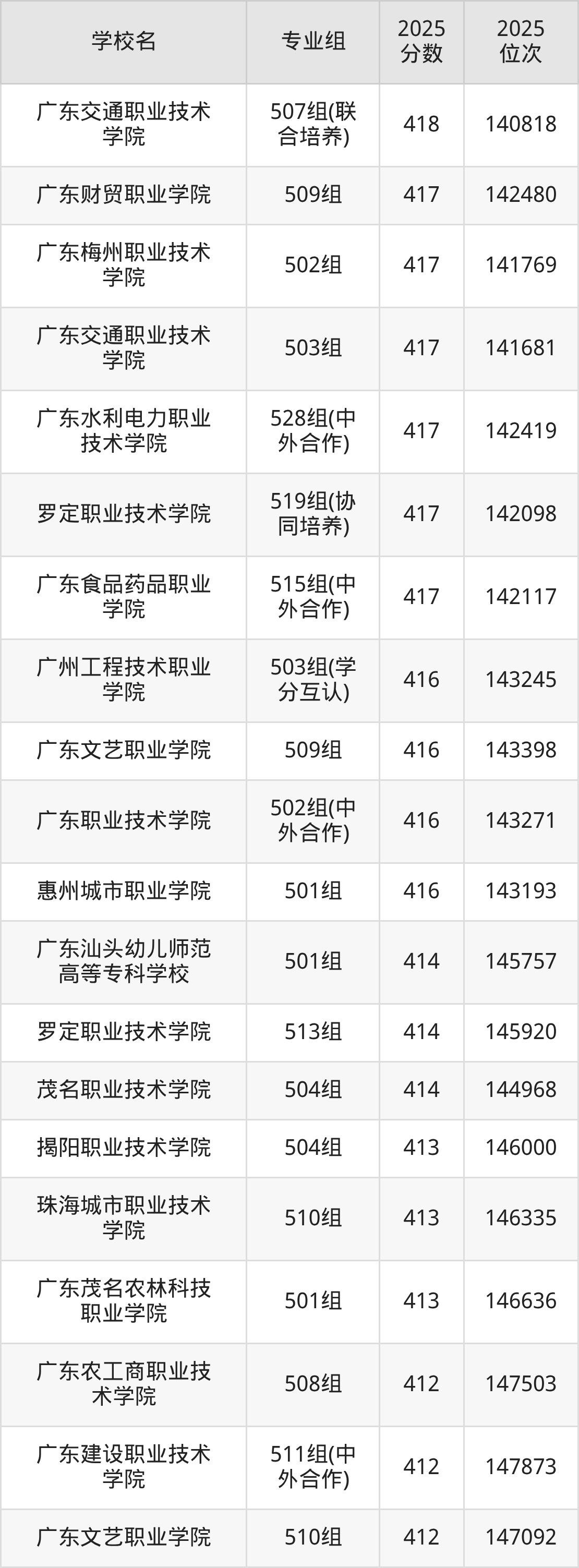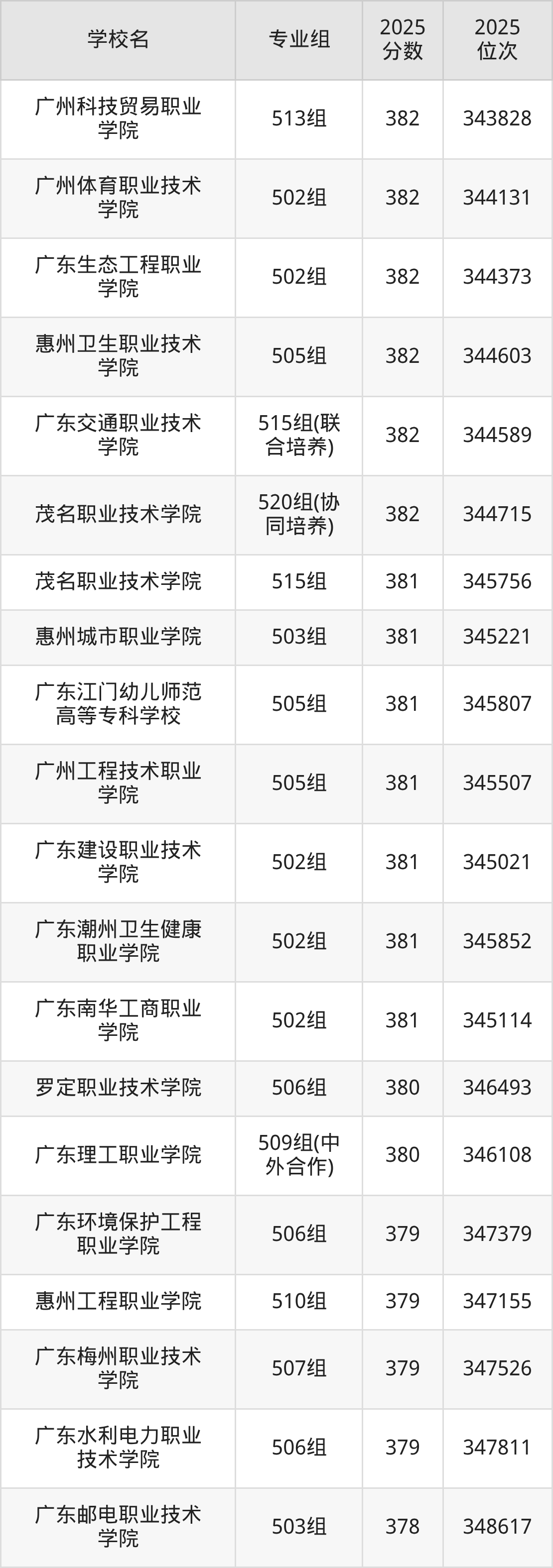 分数线排名最后的公办大专院校是汕尾职业技术学院526组(学分互认)(214分),除此之外,收分较低的院校还有:汕尾职业技术学院525组(学分互认)247分、广东农工商职业技术学院537组(中外合作)306分、广东财贸职业学院507组(联合培养)306分、广东科贸职业学院508组(中外合作)327分。