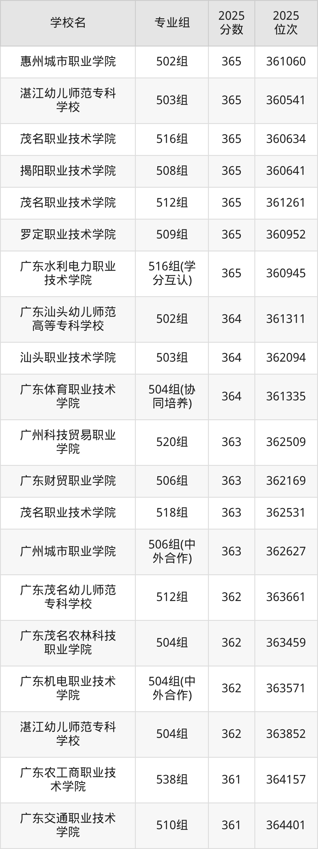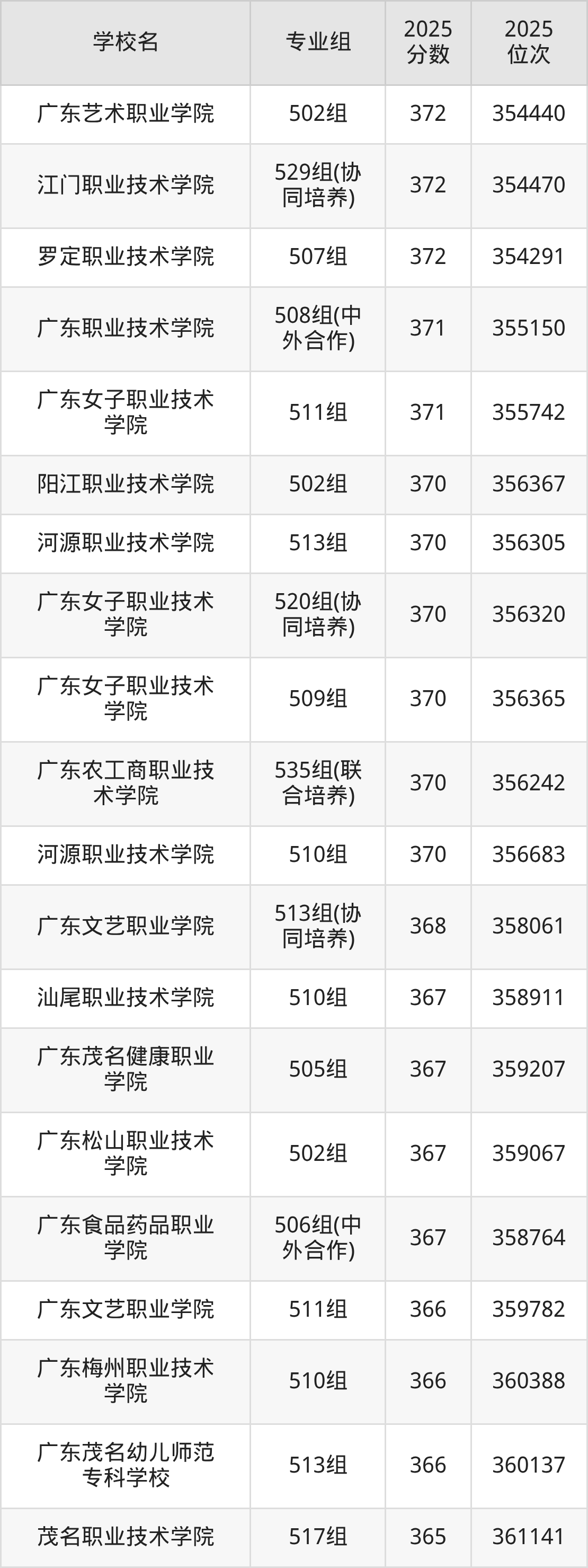 分数线排名最后的公办大专院校是汕尾职业技术学院523组(学分互认)(356分),除此之外,收分较低的院校还有:汕尾职业技术学院524组(学分互认)361分、广东农工商职业技术学院507组(中外合作)364分、广东农工商职业技术学院506组(学分互认)372分、广东财贸职业学院510组(联合培养)391分。