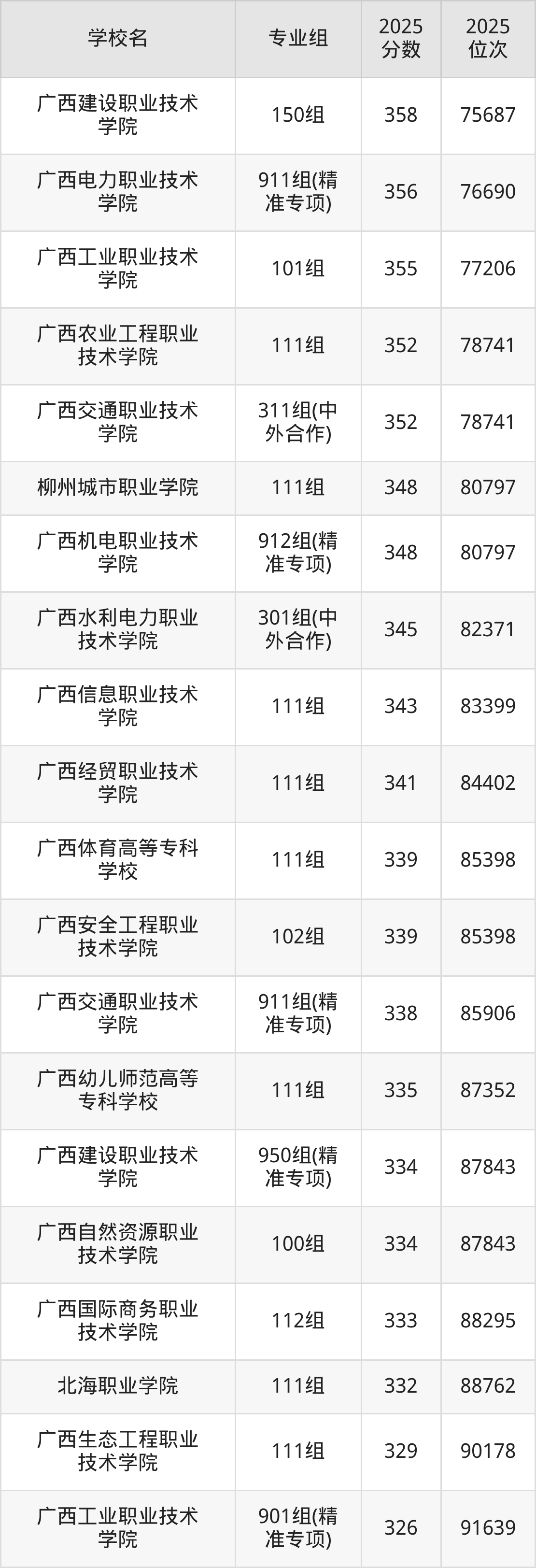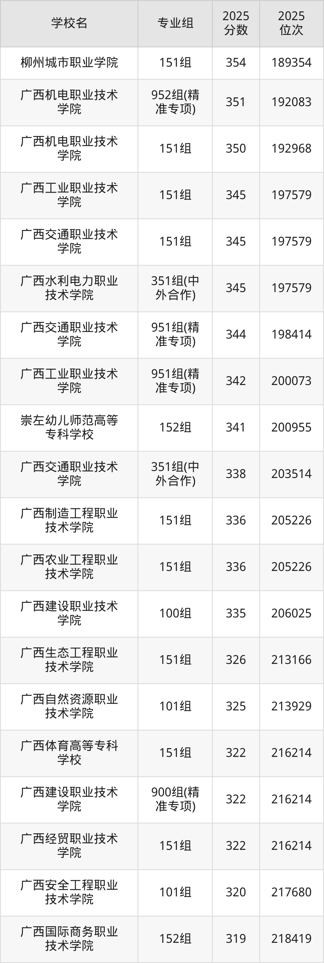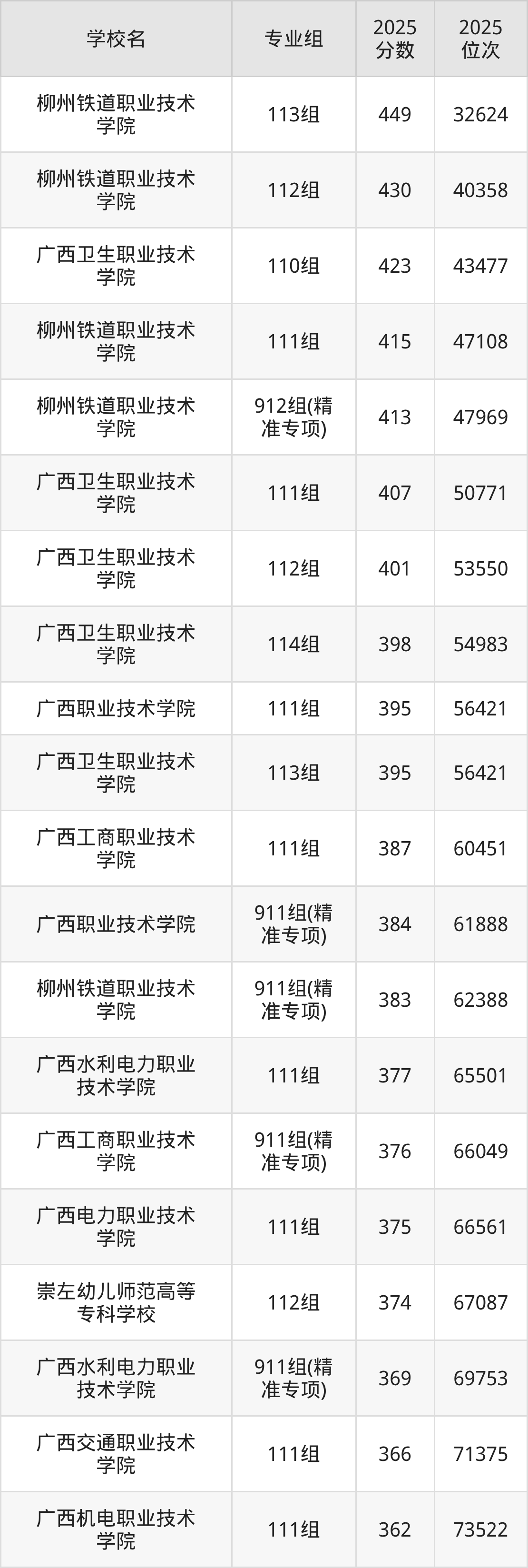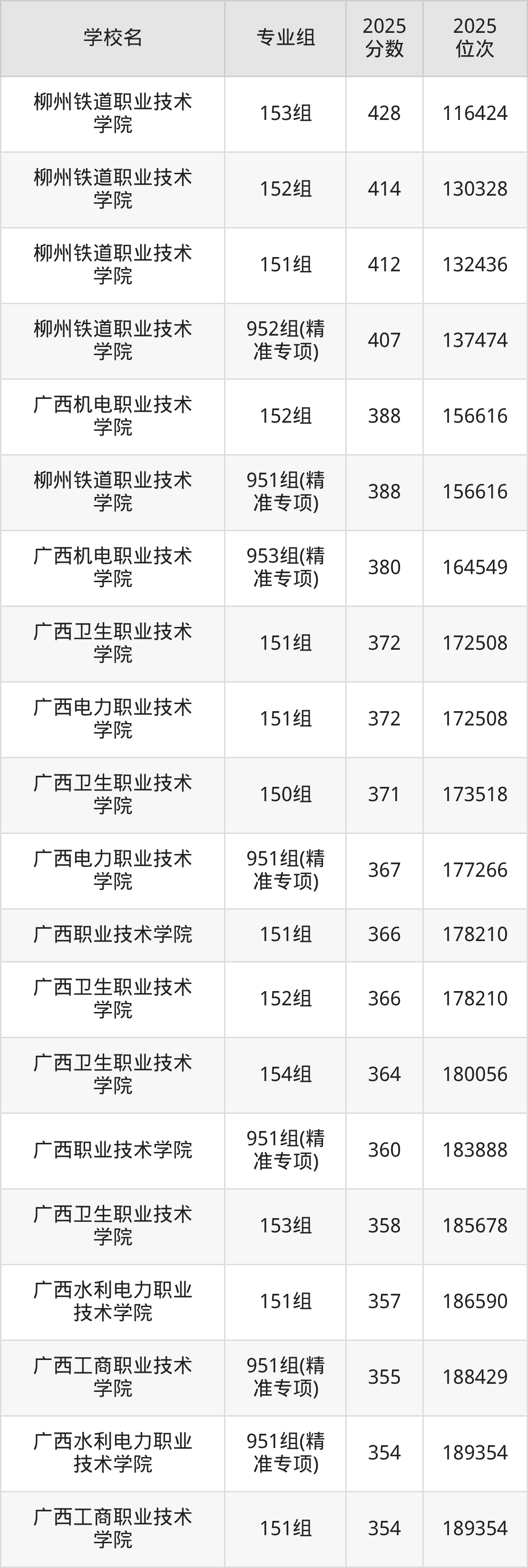 其中,分数线排名第一的专科院校是柳州铁道职业技术学院153组,除此之外,收分较高的院校还有:柳州铁道职业技术学院152组414分、柳州铁道职业技术学院151组412分、柳州铁道职业技术学院952组(精准专项)407分、广西机电职业技术学院152组388分。