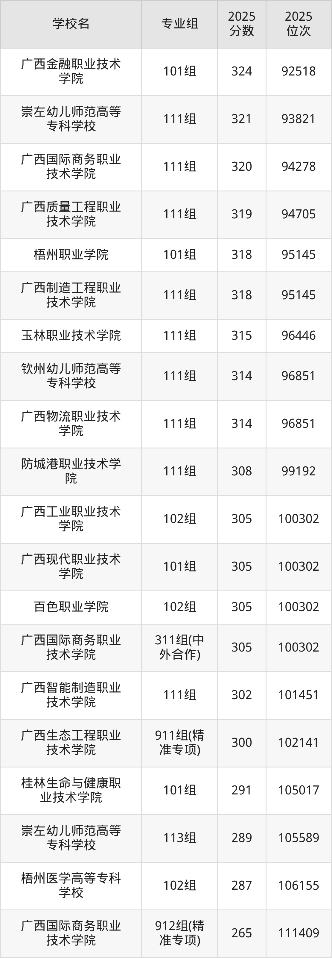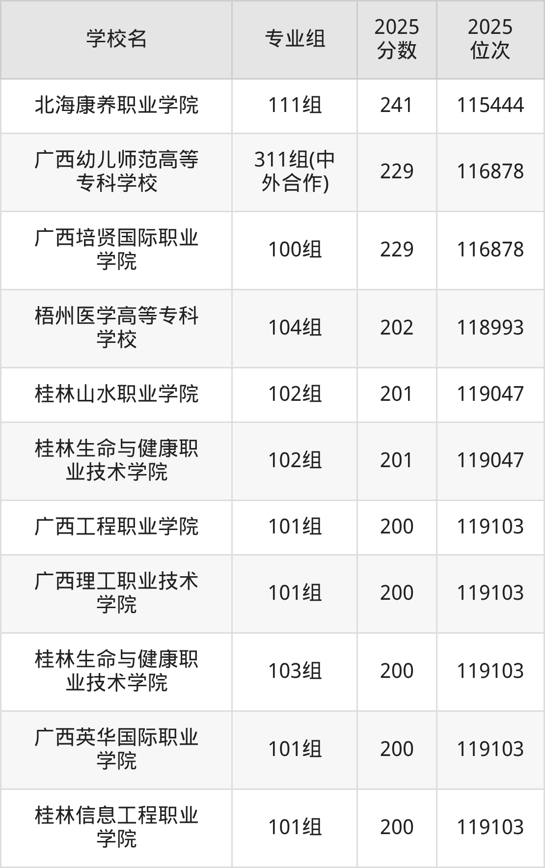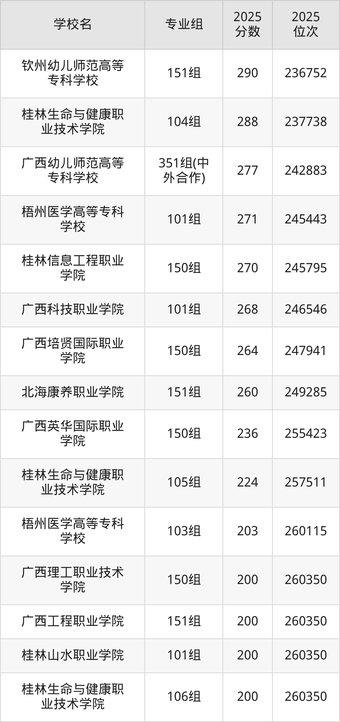 分数线排名最后的专科院校是广西工程职业学院101组(200分)、广西理工职业技术学院101组(200分)等,除此之外,收分较低的院校还有:桂林生命与健康职业技术学院102组201分、桂林山水职业学院102组201分、梧州医学高等专科学校104组202分、广西培贤国际职业学院100组229分。