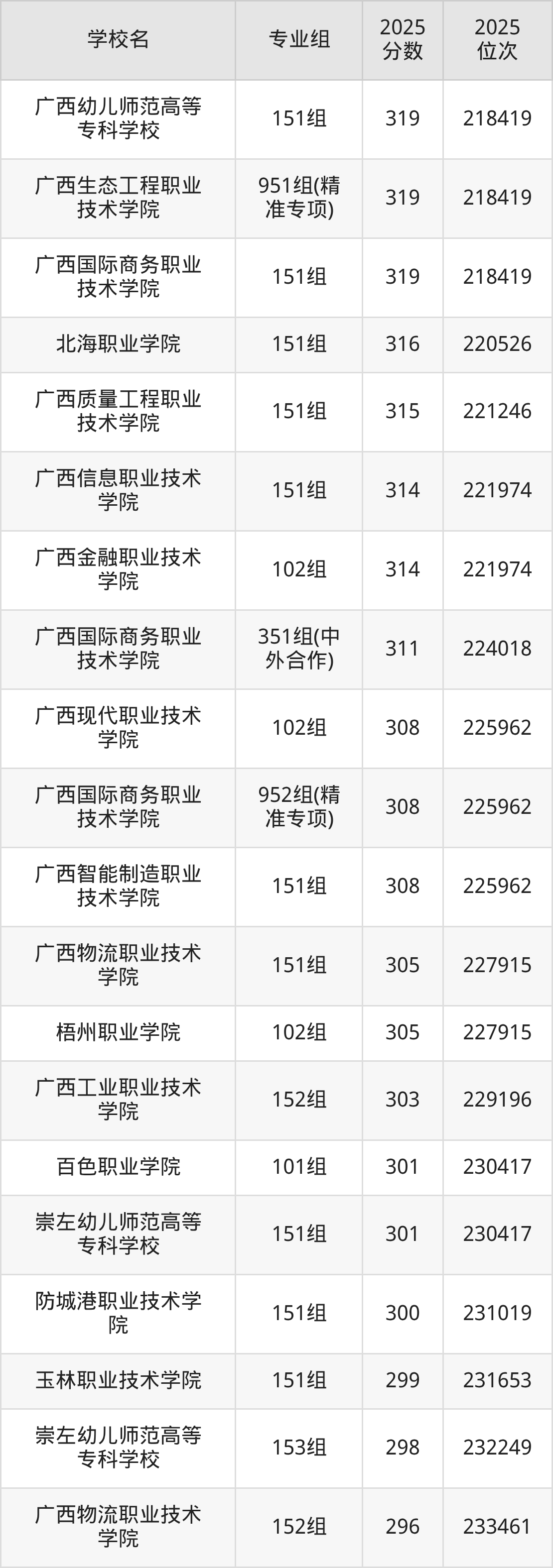 分数线排名最后的专科院校是广西理工职业技术学院150组(200分)、广西工程职业学院151组(200分)等,除此之外,收分较低的院校还有:梧州医学高等专科学校103组203分、桂林生命与健康职业技术学院105组224分、广西英华国际职业学院150组236分、北海康养职业学院151组260分。