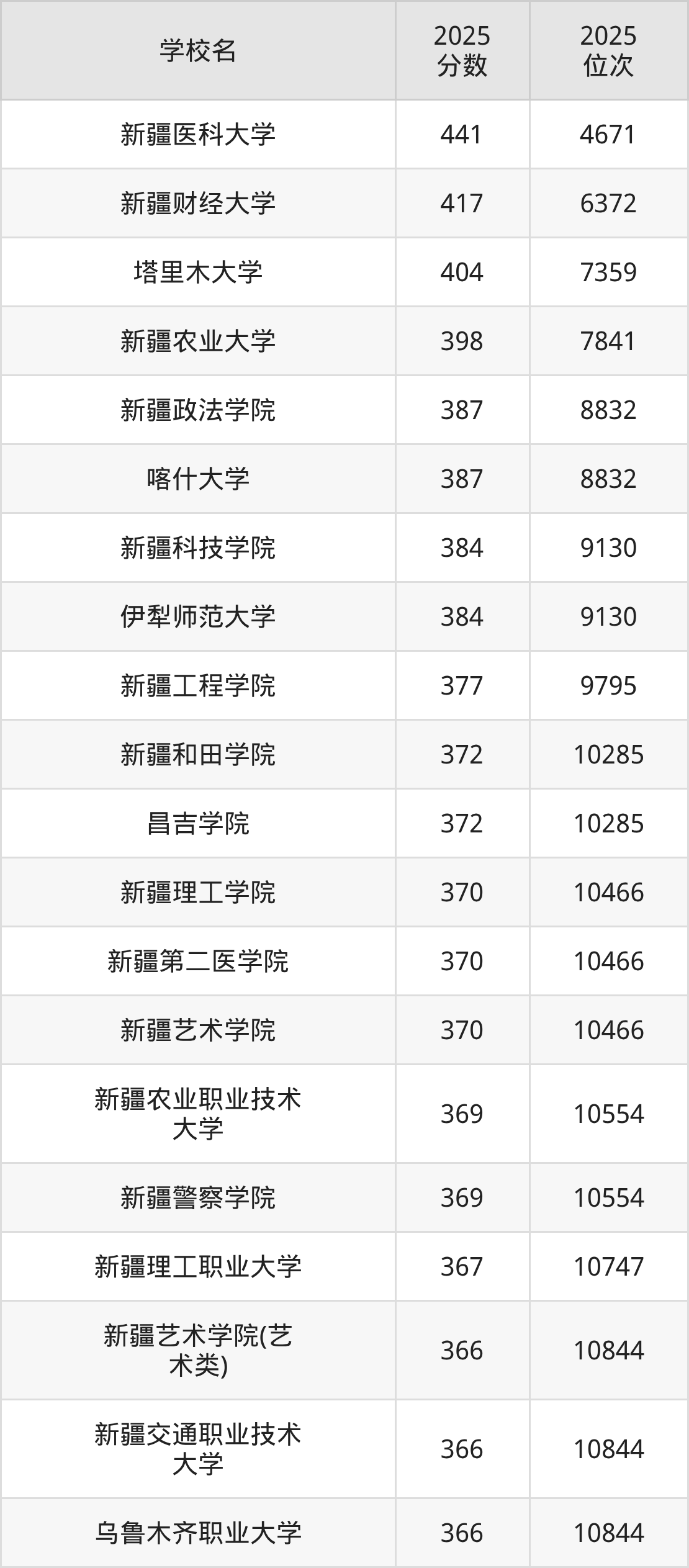 新疆公办二本大学在文科的录取分数线位于350分~441分之间。
