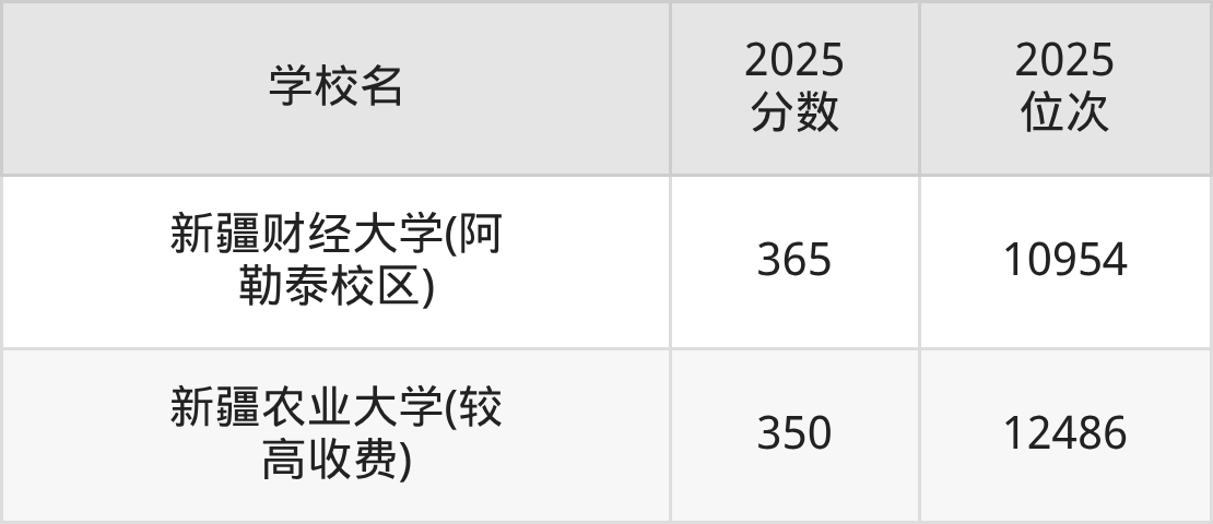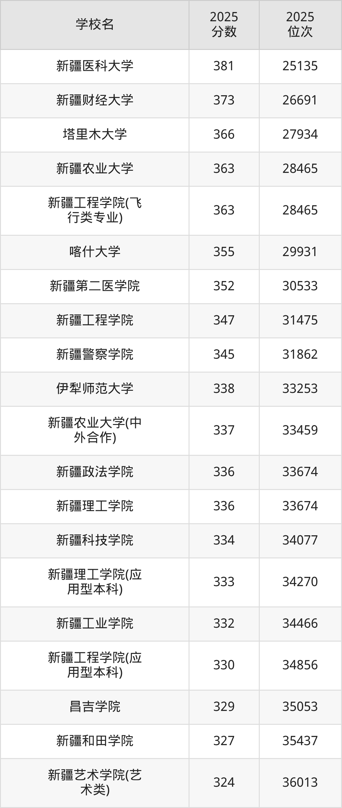 其中,分数线排名第一的公办二本大学是新疆医科大学,除此之外,收分较高的院校还有:新疆财经大学373分、塔里木大学366分、新疆农业大学363分、新疆工程学院(飞行类专业)363分。