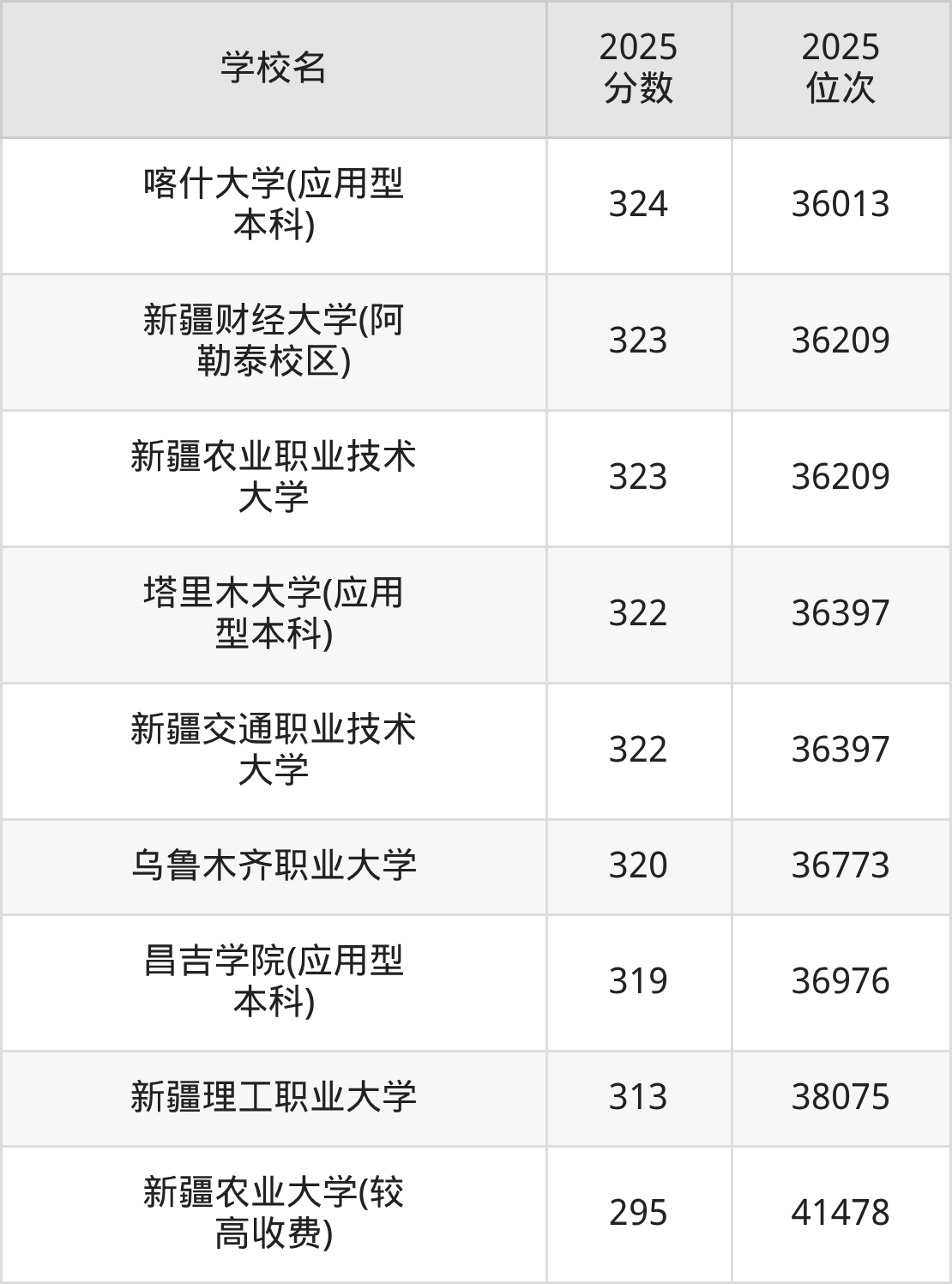 新疆公办二本大学在理科的录取分数线位于295分~381分之间。