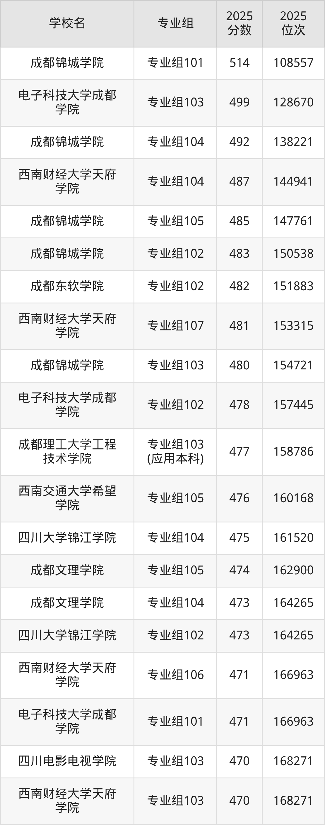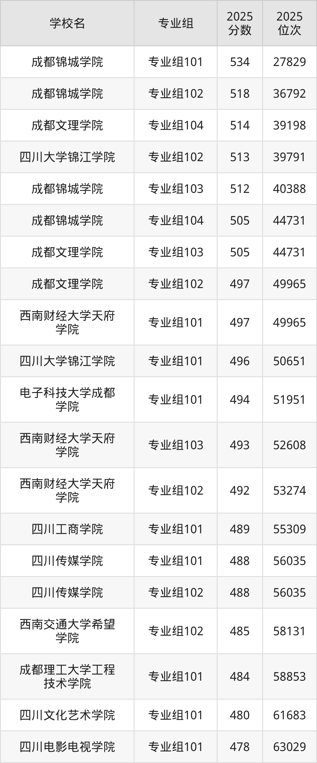 其中,分数线排名第一的民办本科大学是成都锦城学院专业组101,除此之外,收分较高的院校还有:电子科技大学成都学院专业组103499分、成都锦城学院专业组104492分、西南财经大学天府学院专业组104487分、成都锦城学院专业组105485分。