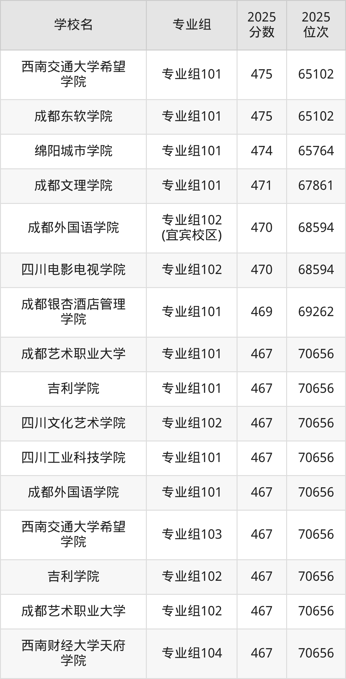 分数线排名最后的民办本科大学是成都艺术职业大学专业组101(467分)、吉利学院专业组101(467分)等,除此之外,收分较低的院校还有:成都银杏酒店管理学院专业组101469分、四川电影电视学院专业组102470分、成都外国语学院专业组102(宜宾校区)470分、成都文理学院专业组101471分。