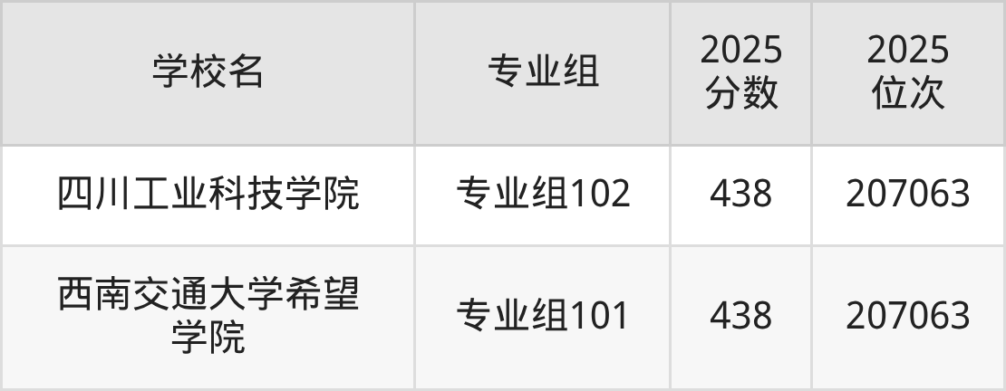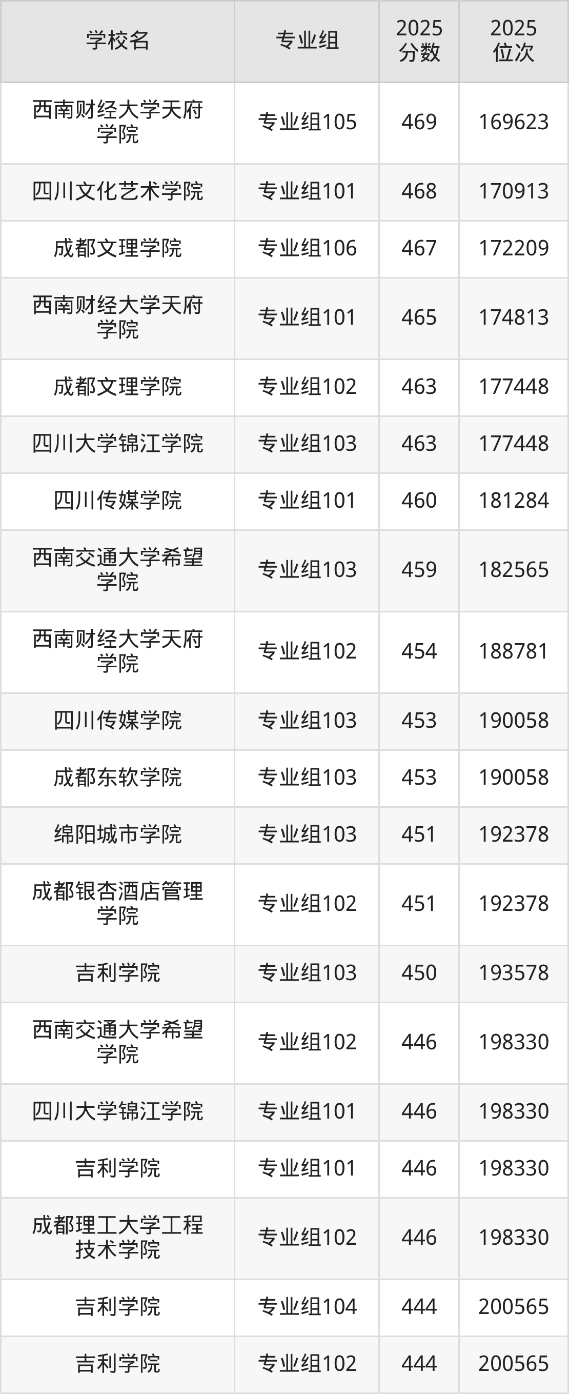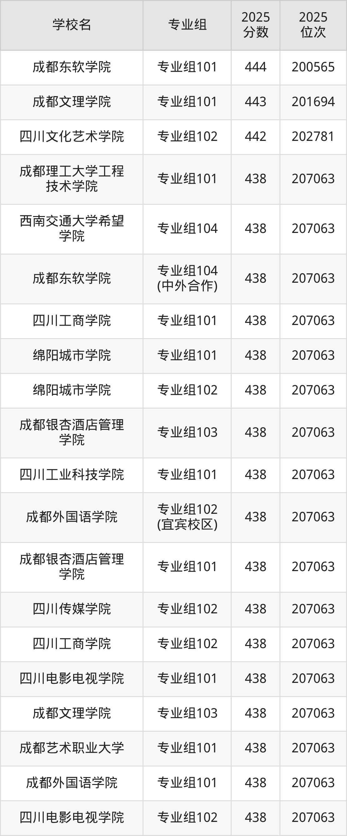 分数线排名最后的民办本科大学是成都理工大学工程技术学院专业组101(438分)、西南交通大学希望学院专业组104(438分)等,除此之外,收分较低的院校还有:四川文化艺术学院专业组102442分、成都文理学院专业组101443分、成都东软学院专业组101444分、吉利学院专业组102444分。
