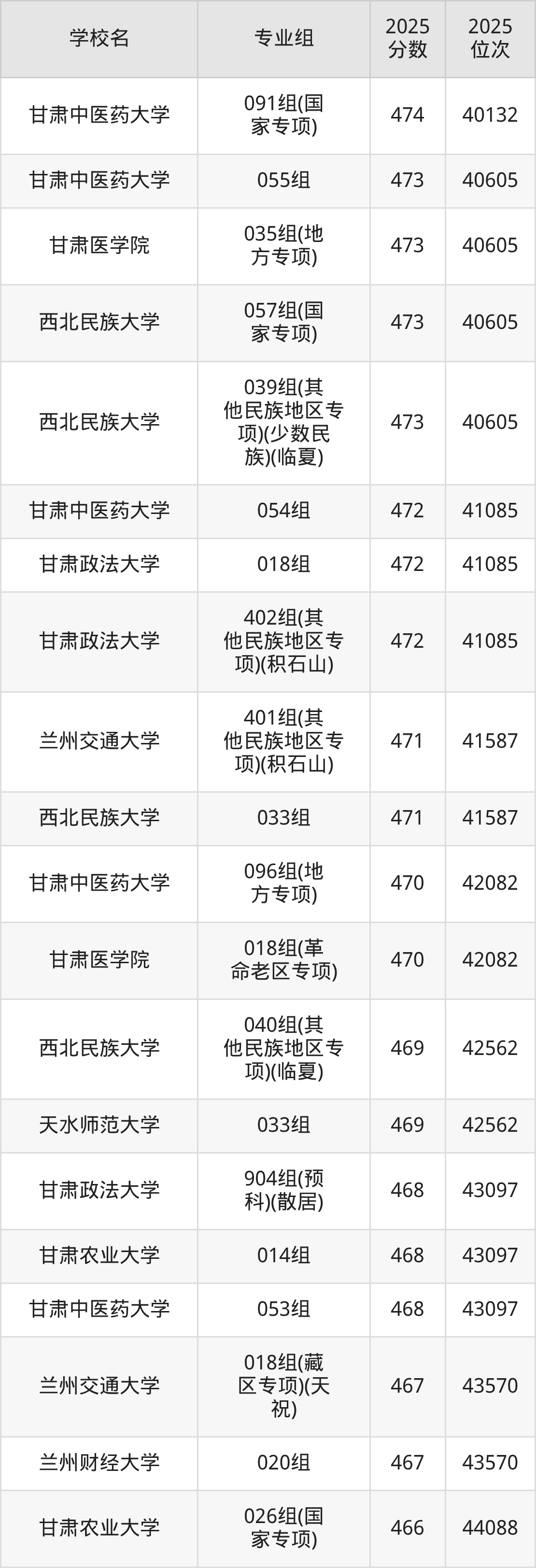其中,分数线排名第一的二本大学是甘肃中医药大学091组(国家专项),除此之外,收分较高的院校还有:甘肃中医药大学055组473分、甘肃医学院035组(地方专项)473分、西北民族大学057组(国家专项)473分、西北民族大学039组(其他民族地区专项)(少数民族)(临夏)473分。