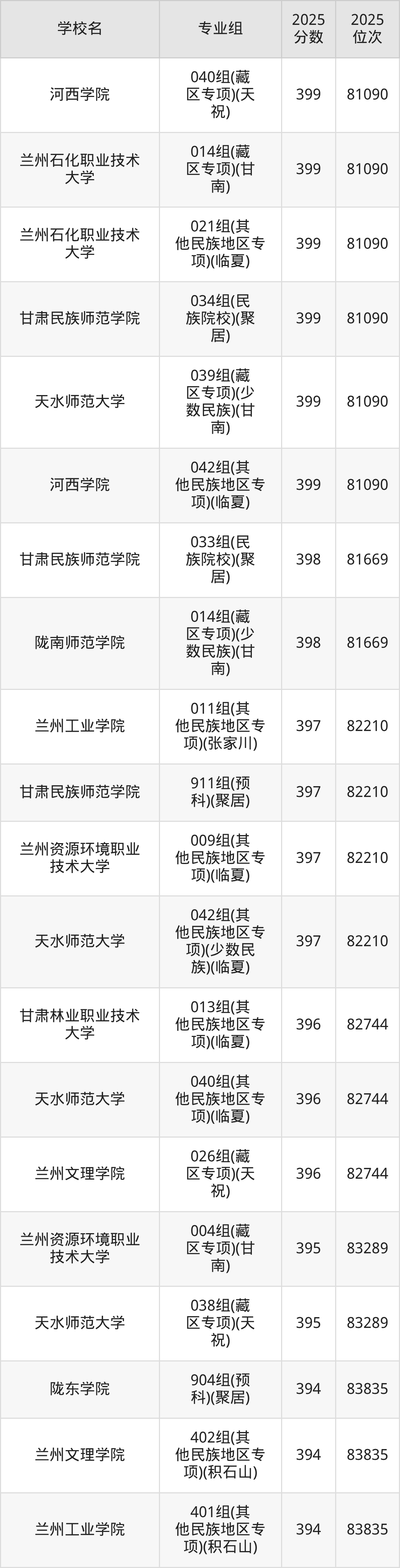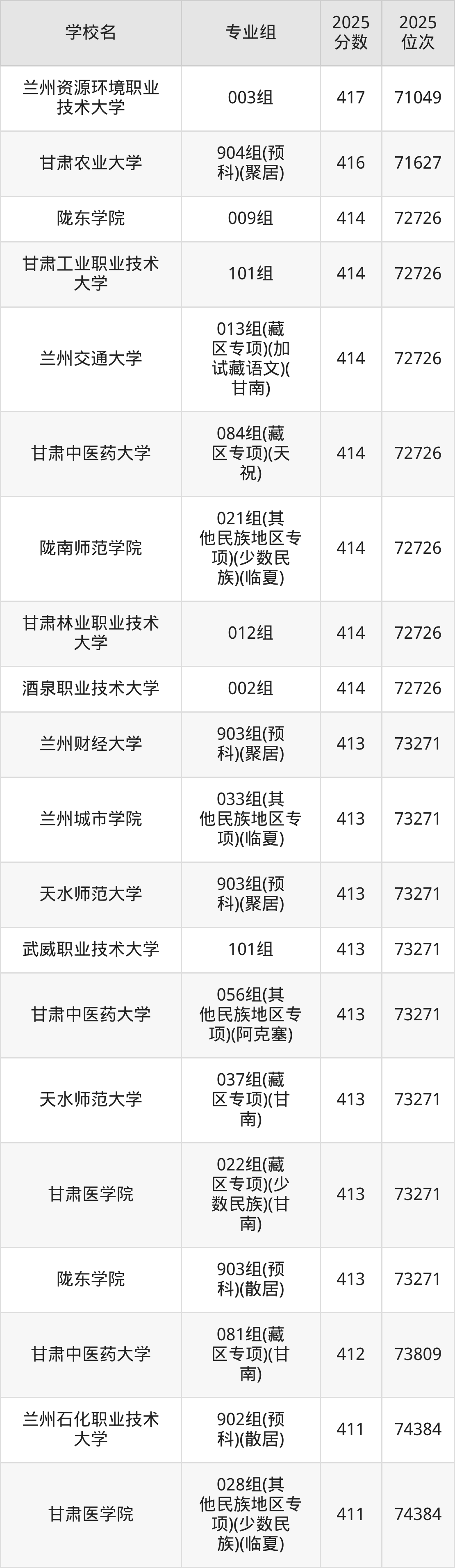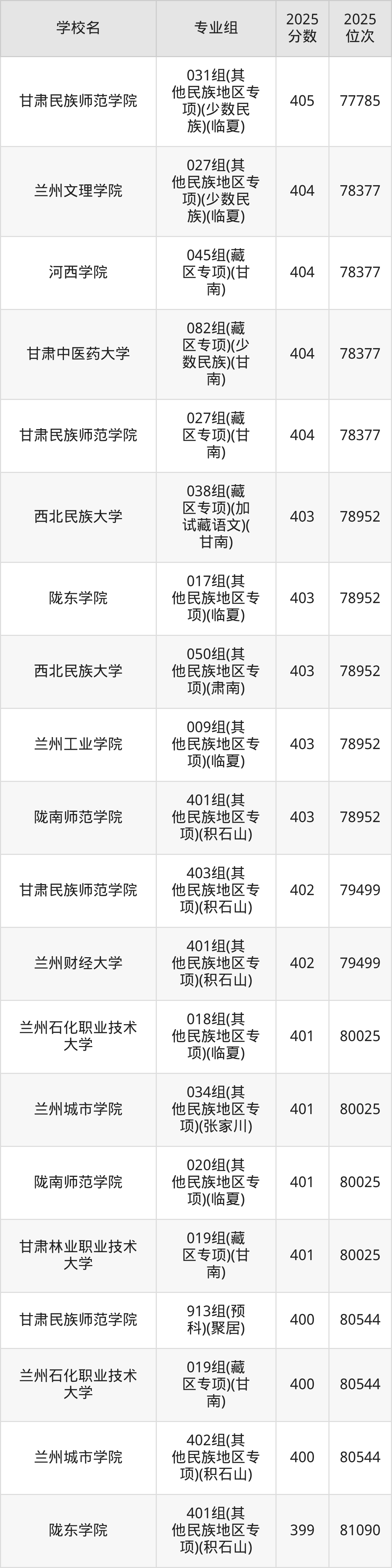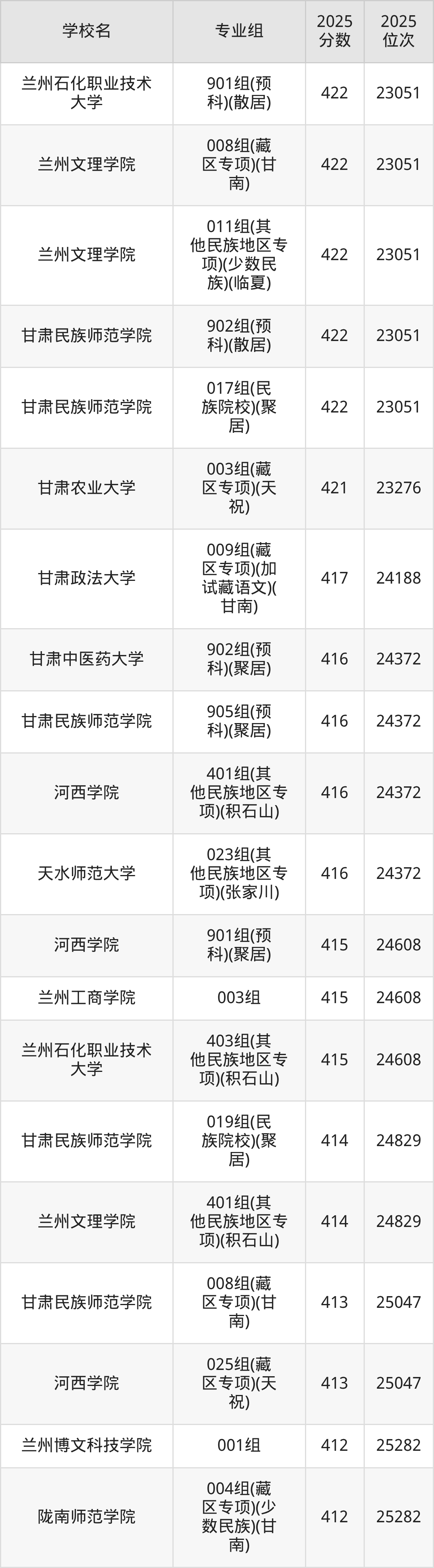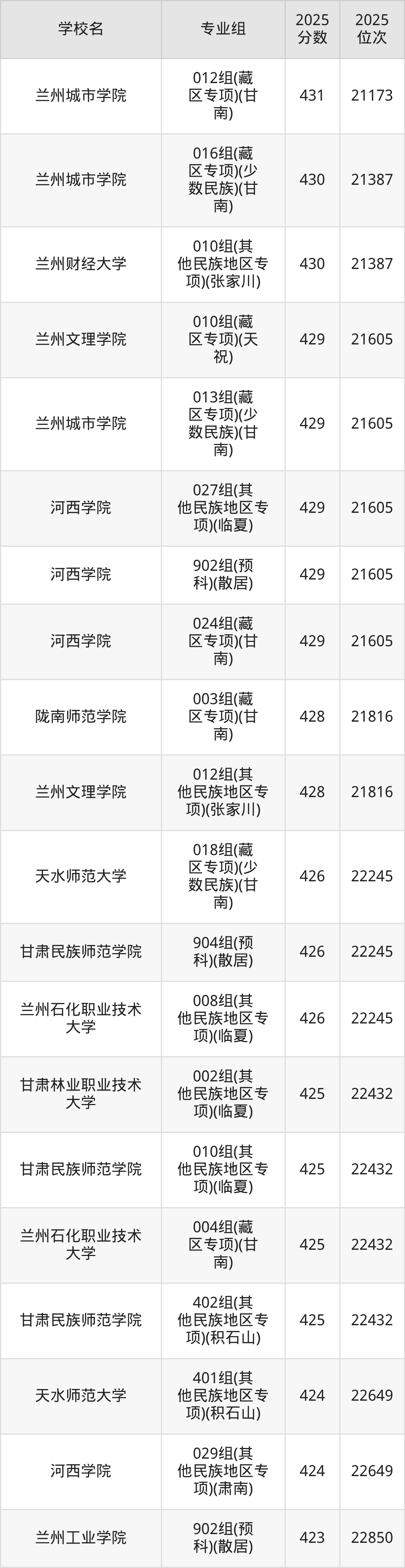 分数线排名最后的二本大学是兰州博文科技学院001组(412分)、陇南师范学院004组(藏区专项)(少数民族)(甘南)(412分)等,除此之外,收分较低的院校还有:河西学院025组(藏区专项)(天祝)413分、甘肃民族师范学院008组(藏区专项)(甘南)413分、兰州文理学院401组(其他民族地区专项)(积石山)414分、甘肃民族师范学院019组(民族院校)(聚居)414分。