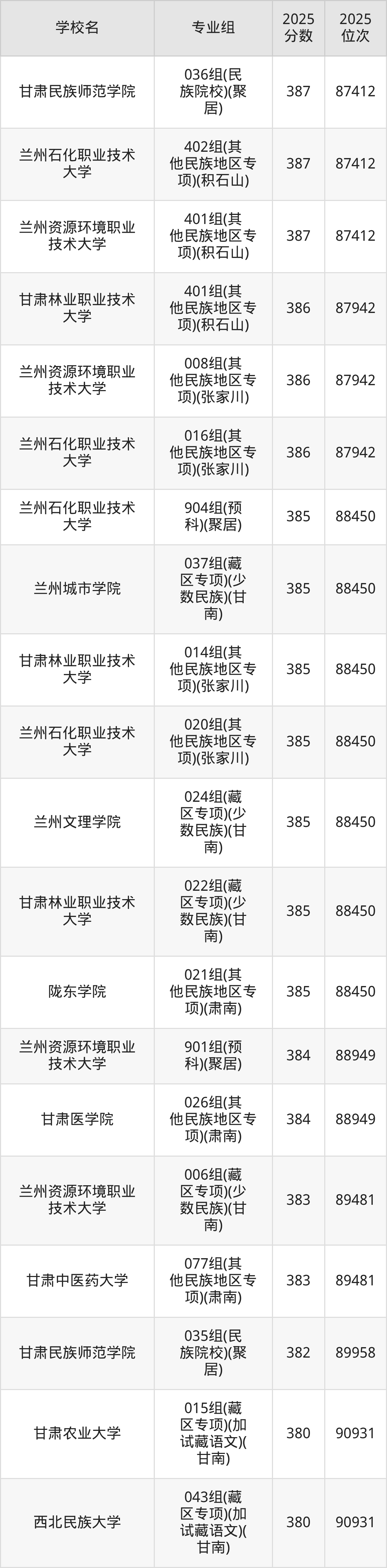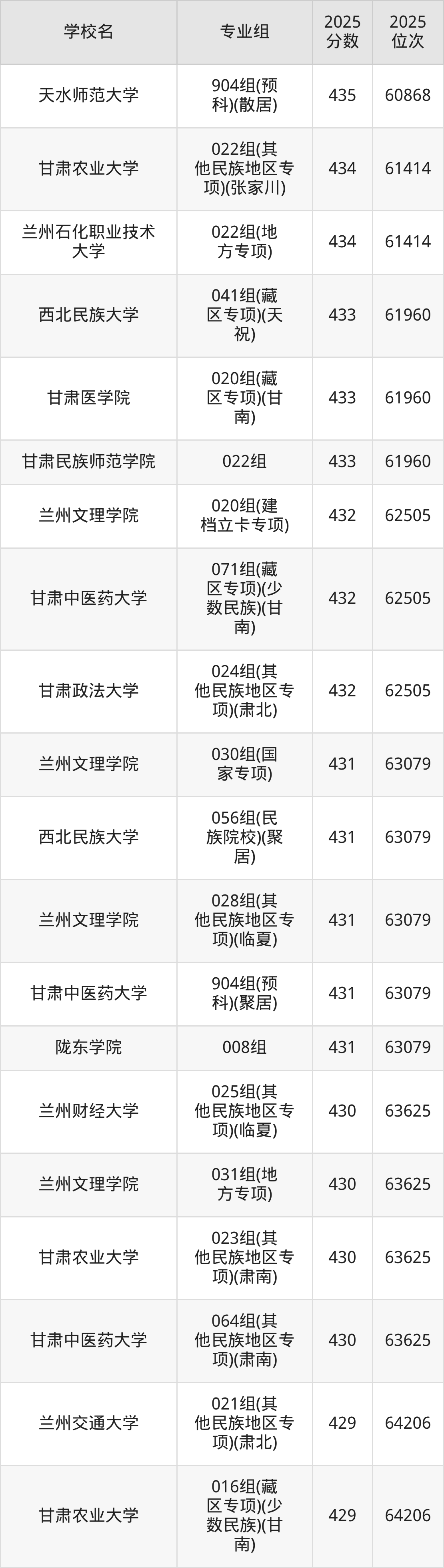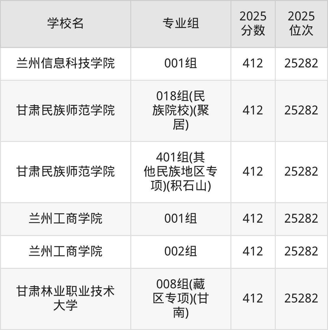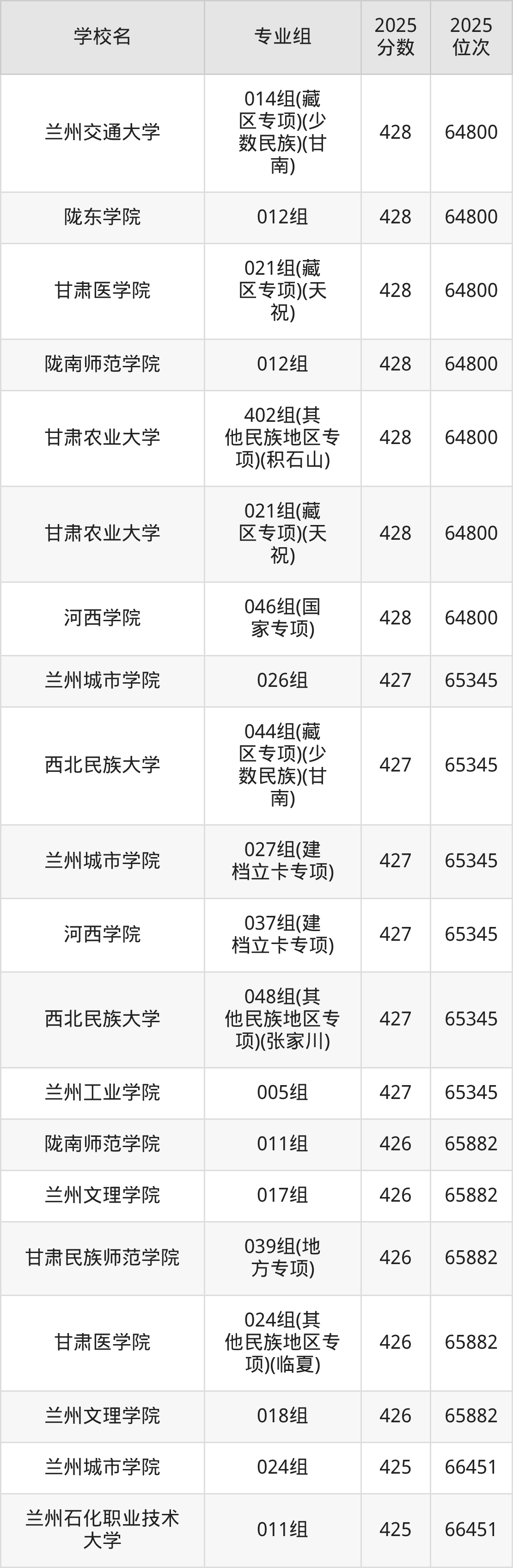 分数线排名最后的二本大学是兰州博文科技学院001组(412分)、陇南师范学院004组(藏区专项)(少数民族)(甘南)(412分)等,除此之外,收分较低的院校还有:河西学院025组(藏区专项)(天祝)413分、甘肃民族师范学院008组(藏区专项)(甘南)413分、兰州文理学院401组(其他民族地区专项)(积石山)414分、甘肃民族师范学院019组(民族院校)(聚居)414分。