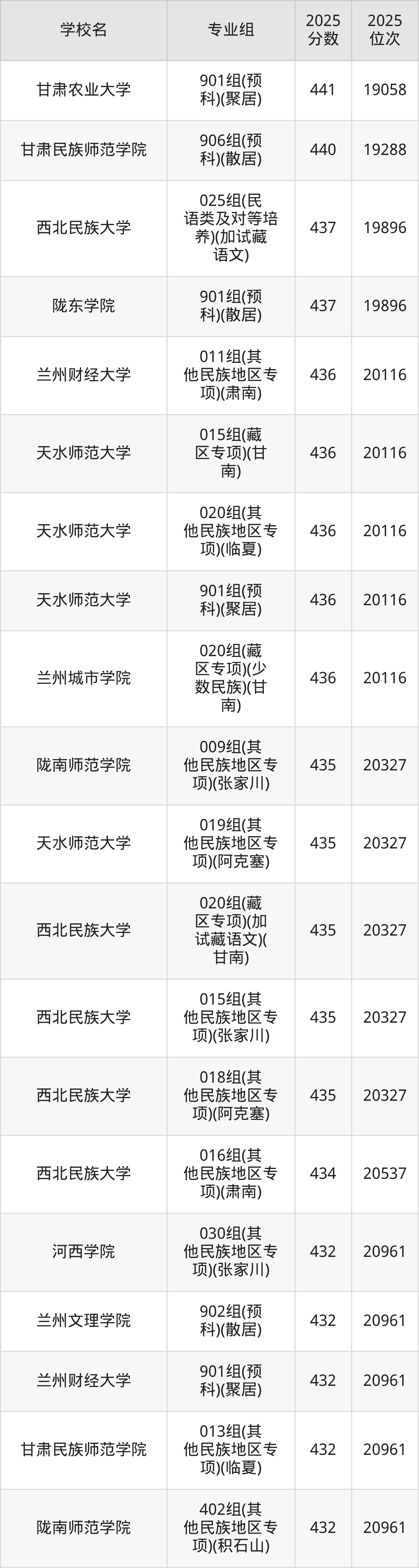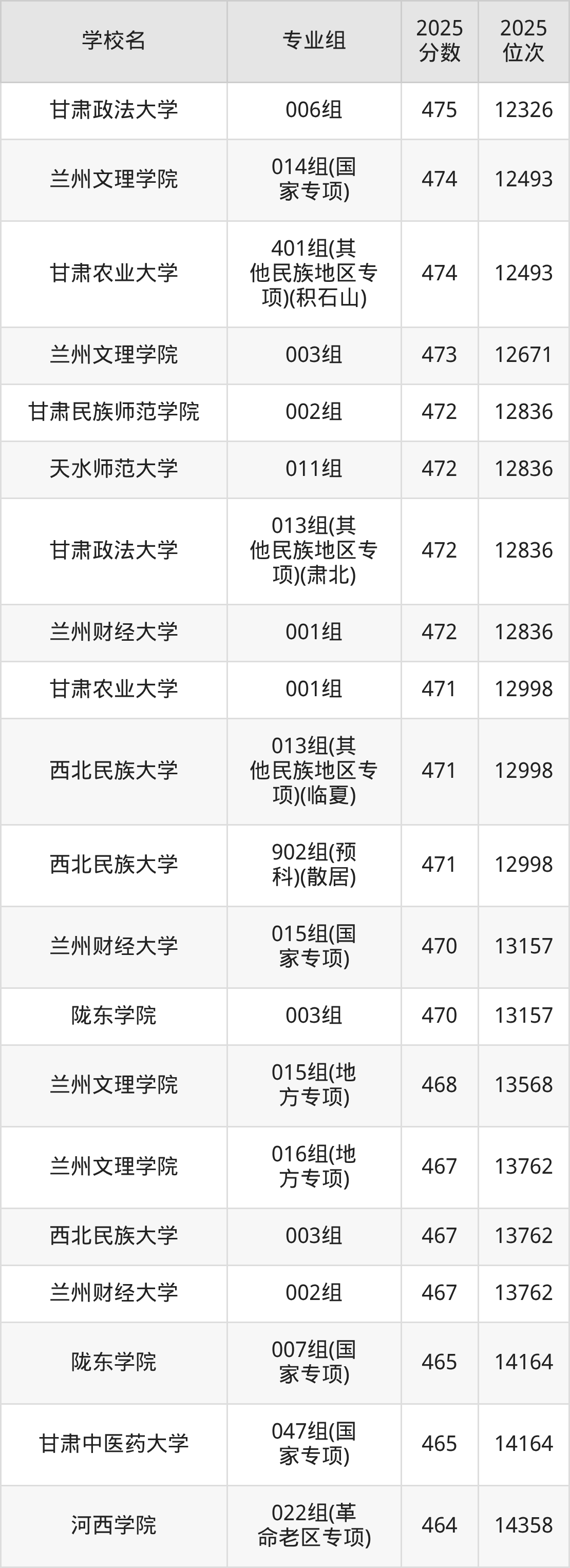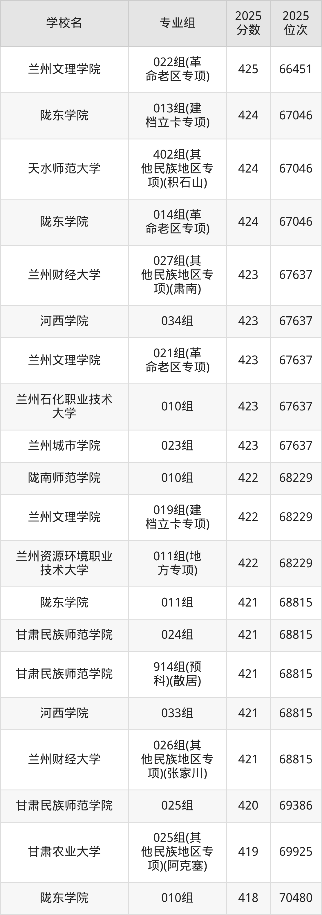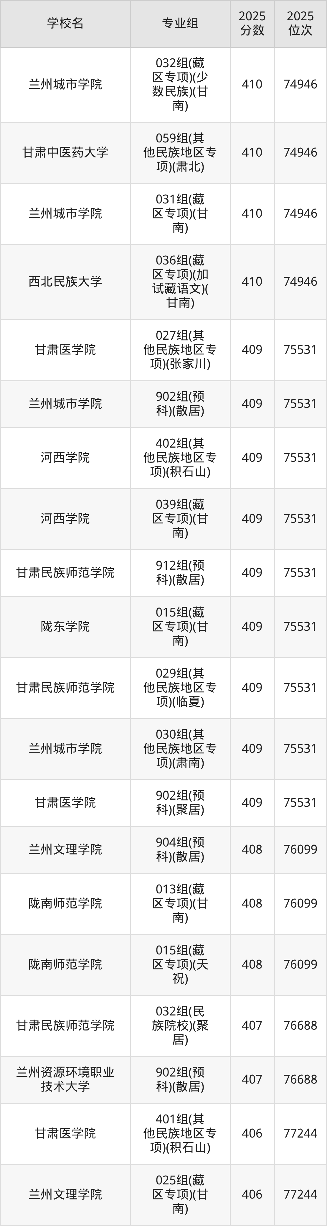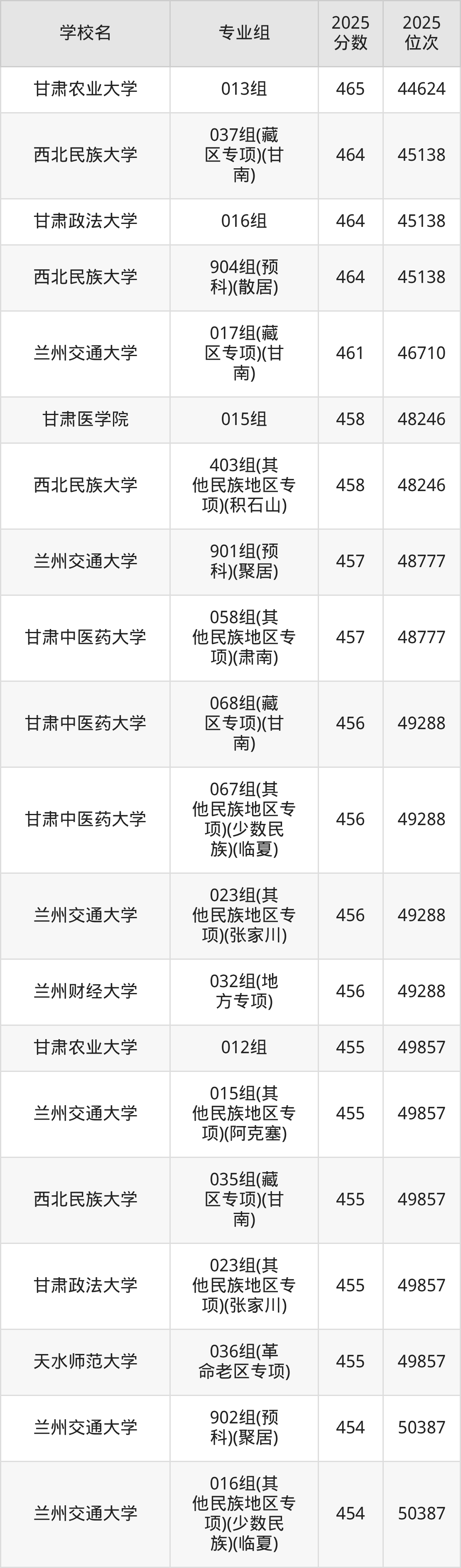 分数线排名最后的二本大学是兰州博文科技学院001组(412分)、陇南师范学院004组(藏区专项)(少数民族)(甘南)(412分)等,除此之外,收分较低的院校还有:河西学院025组(藏区专项)(天祝)413分、甘肃民族师范学院008组(藏区专项)(甘南)413分、兰州文理学院401组(其他民族地区专项)(积石山)414分、甘肃民族师范学院019组(民族院校)(聚居)414分。