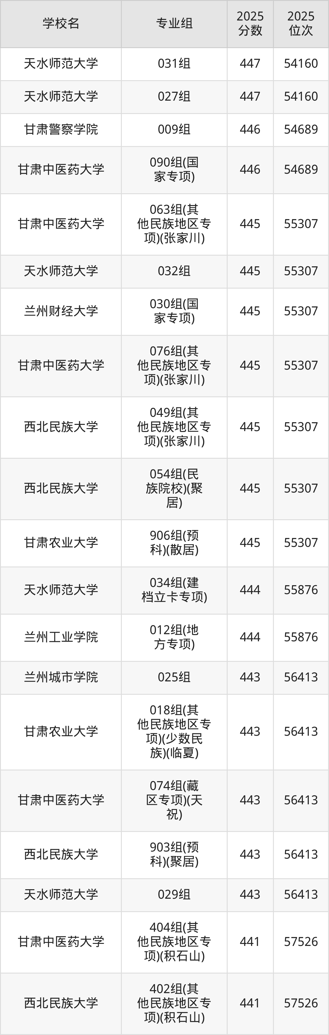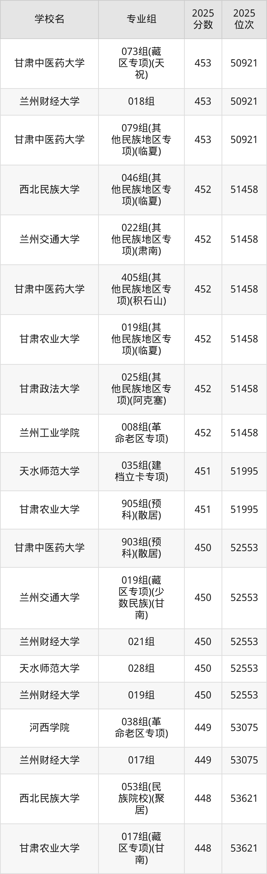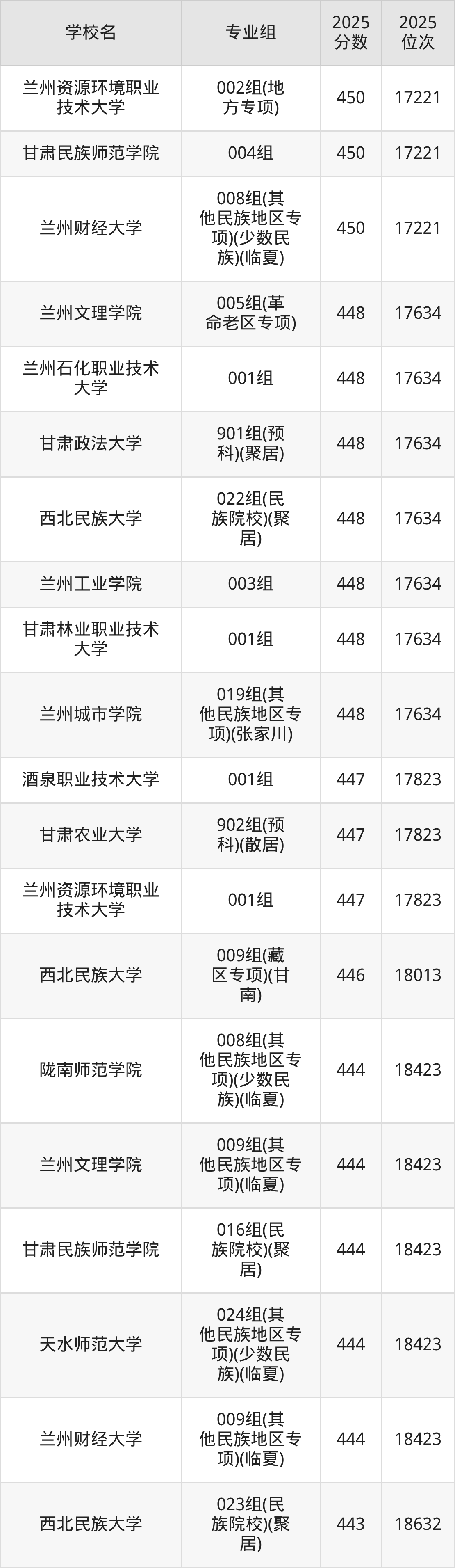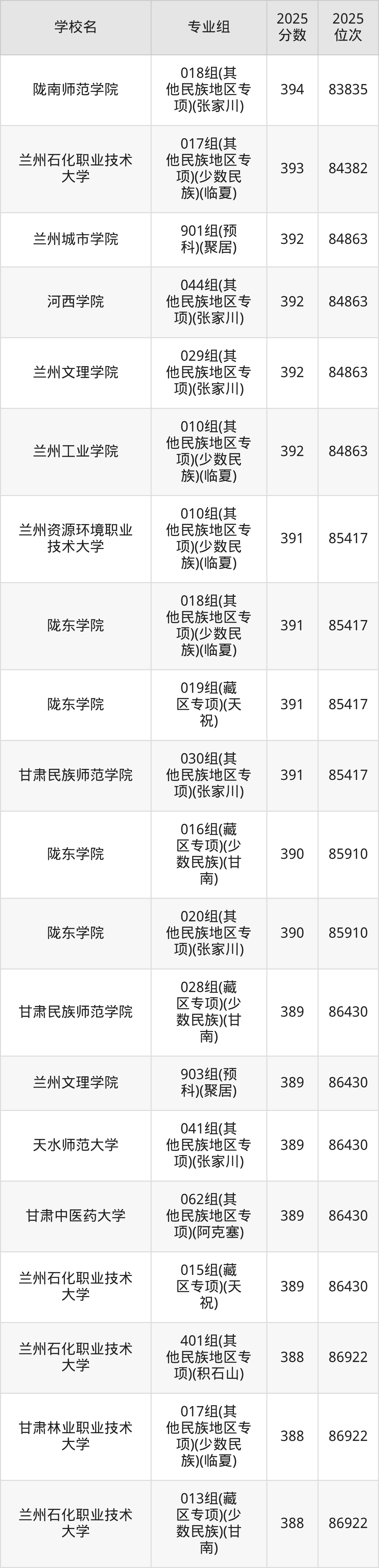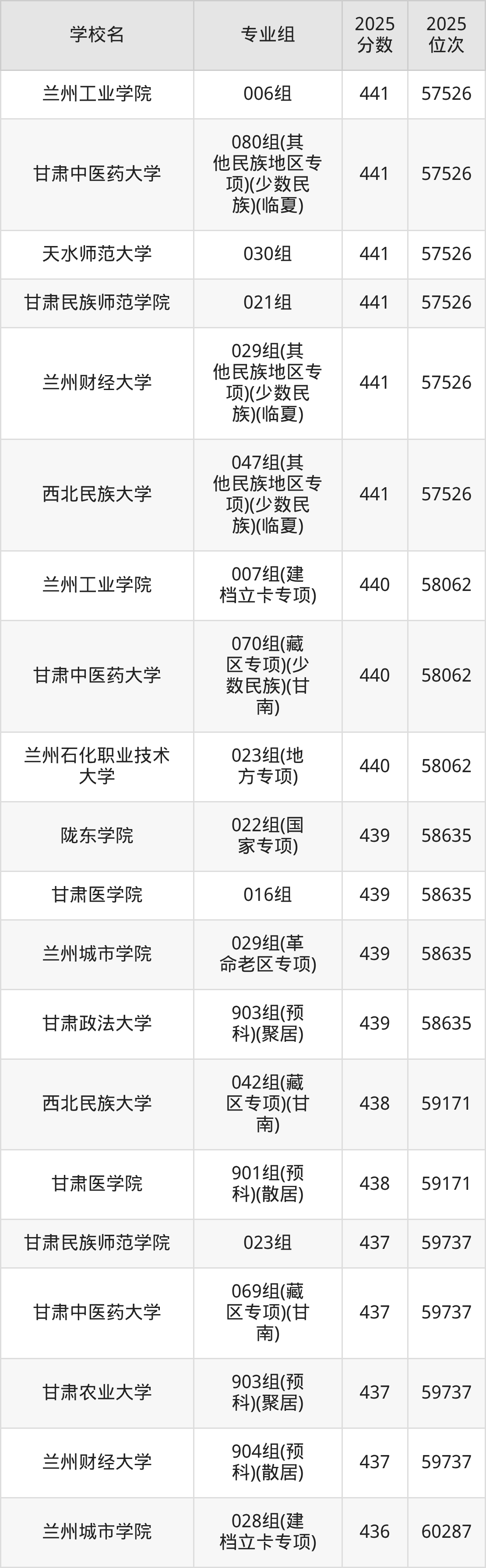 分数线排名最后的二本大学是兰州博文科技学院001组(412分)、陇南师范学院004组(藏区专项)(少数民族)(甘南)(412分)等,除此之外,收分较低的院校还有:河西学院025组(藏区专项)(天祝)413分、甘肃民族师范学院008组(藏区专项)(甘南)413分、兰州文理学院401组(其他民族地区专项)(积石山)414分、甘肃民族师范学院019组(民族院校)(聚居)414分。