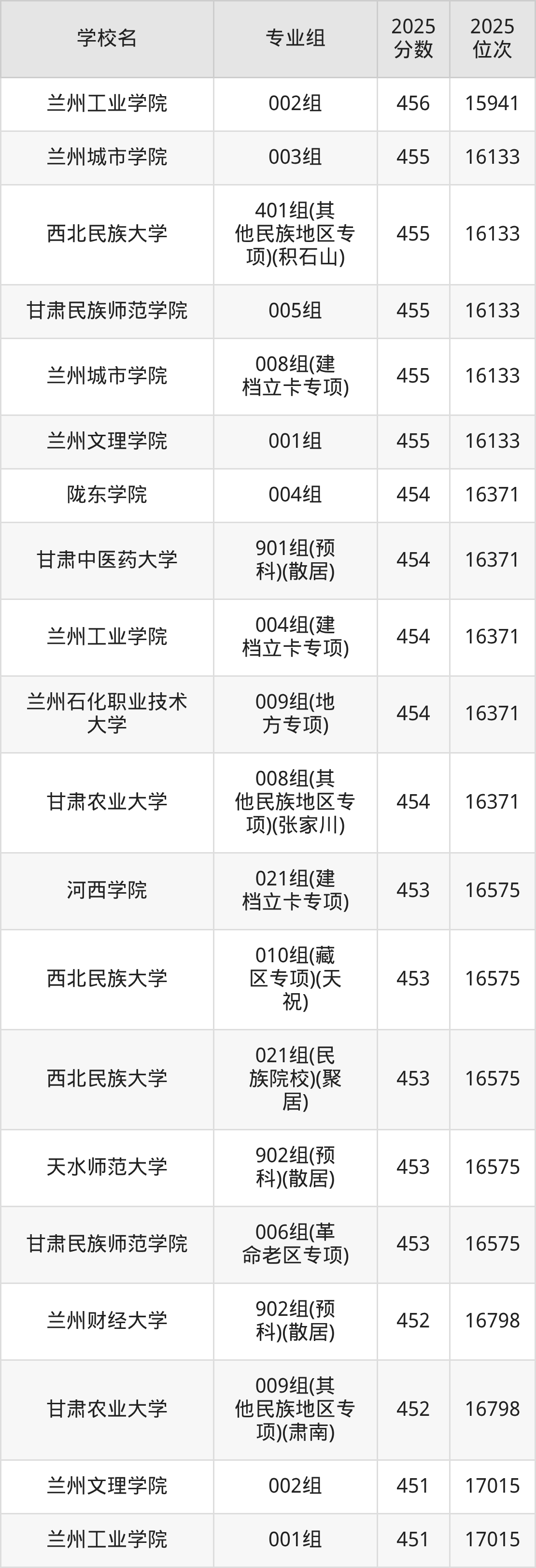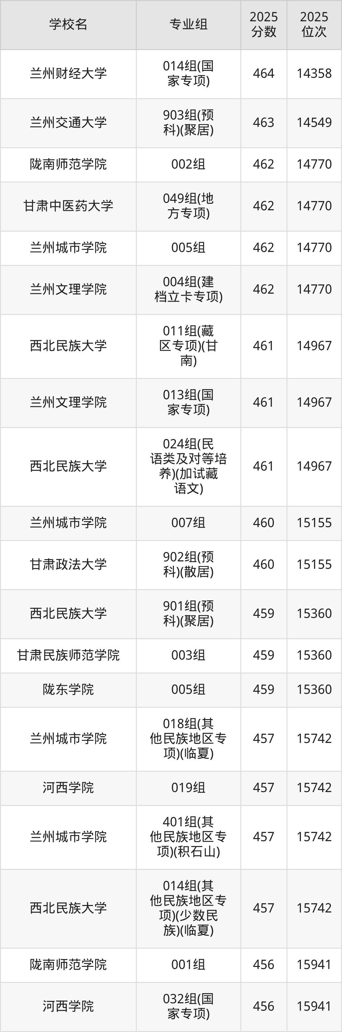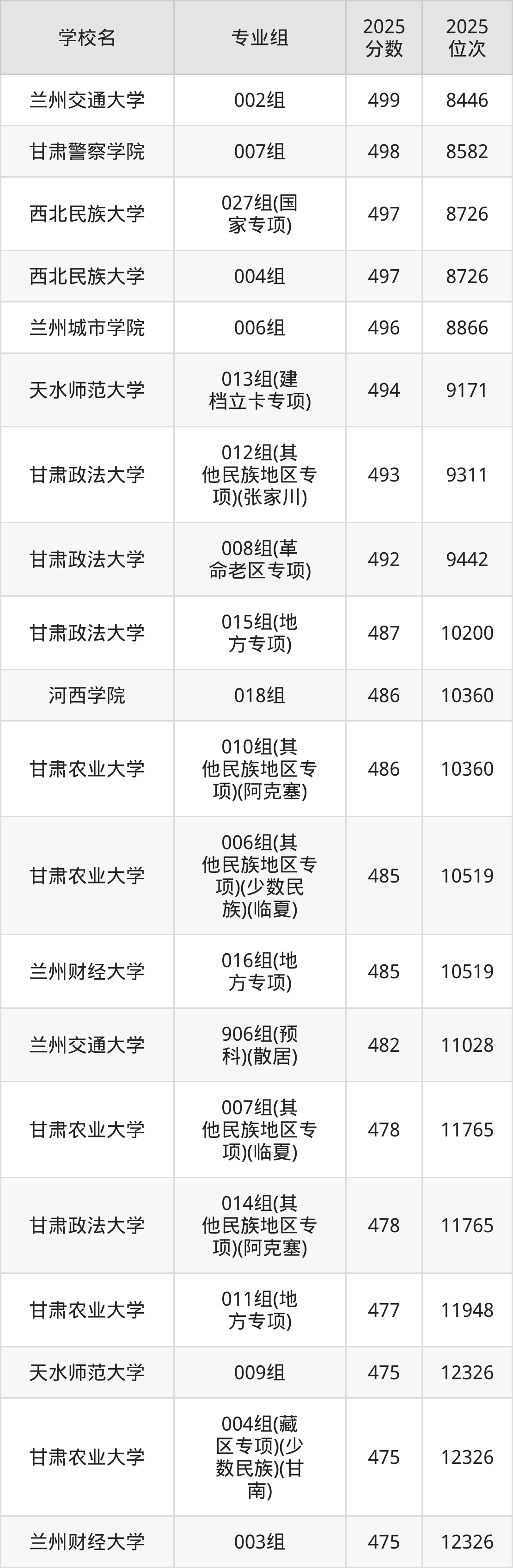 其中,分数线排名第一的二本大学是兰州交通大学002组,除此之外,收分较高的院校还有:甘肃警察学院007组498分、西北民族大学027组(国家专项)497分、西北民族大学004组497分、兰州城市学院006组496分。