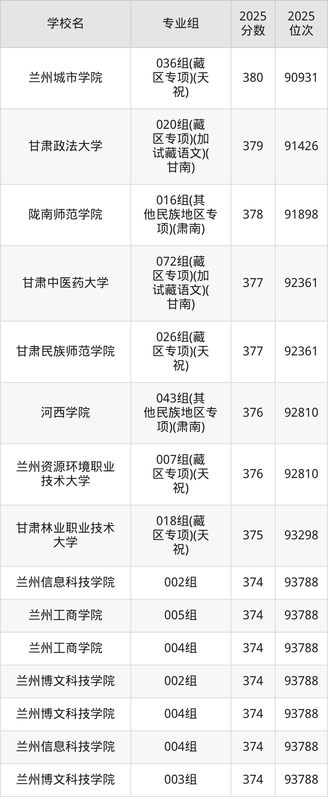 分数线排名最后的二本大学是兰州信息科技学院002组(374分)、兰州工商学院005组(374分)等,除此之外,收分较低的院校还有:甘肃林业职业技术大学018组(藏区专项)(天祝)375分、兰州资源环境职业技术大学007组(藏区专项)(天祝)376分、河西学院043组(其他民族地区专项)(肃南)376分、甘肃民族师范学院026组(藏区专项)(天祝)377分。
