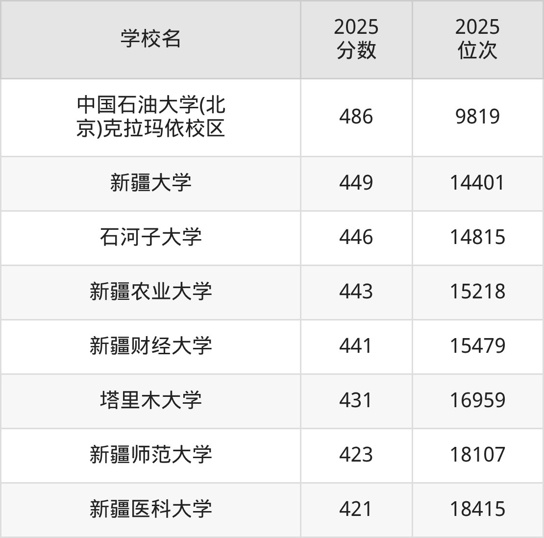 其中,分数线排名第一的一本大学是中国石油大学(北京)克拉玛依校区,除此之外,收分较高的院校还有:新疆大学449分、石河子大学446分、新疆农业大学443分、新疆财经大学441分。