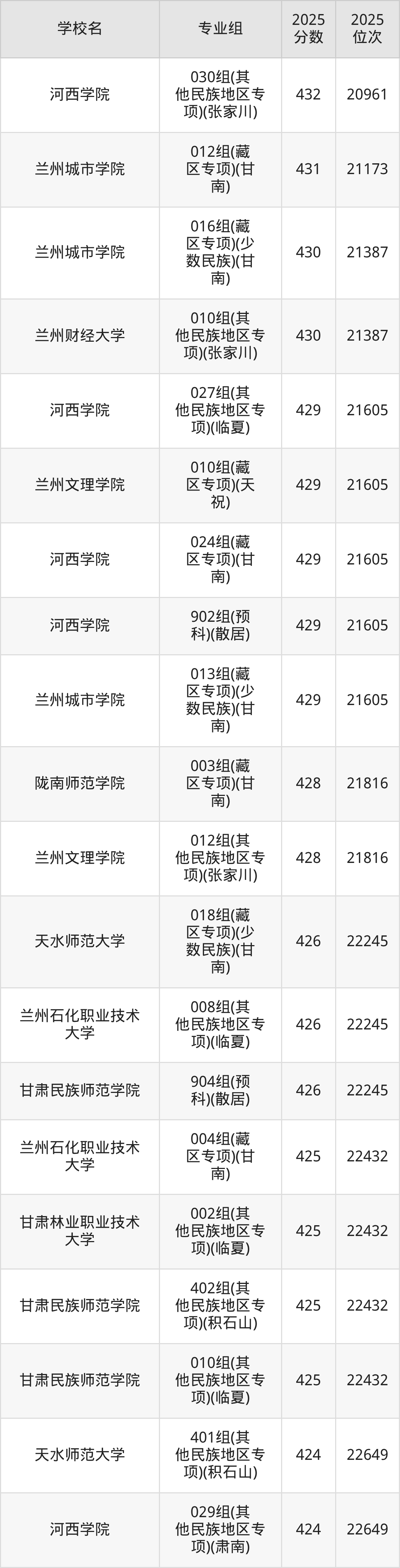 分数线排名最后的本科大学是兰州财经大学024组(藏区专项)(加试藏语文)(天祝)(297分),除此之外,收分较低的院校还有:甘肃中医药大学087组(民语类及对等培养)(加试藏语文)299分、甘肃民族师范学院038组(民语类及对等培养)(加试藏语文)301分、甘肃政法大学021组(藏区专项)(加试藏语文)(天祝)313分、甘肃民族师范学院931组(预科)(聚居)315分。