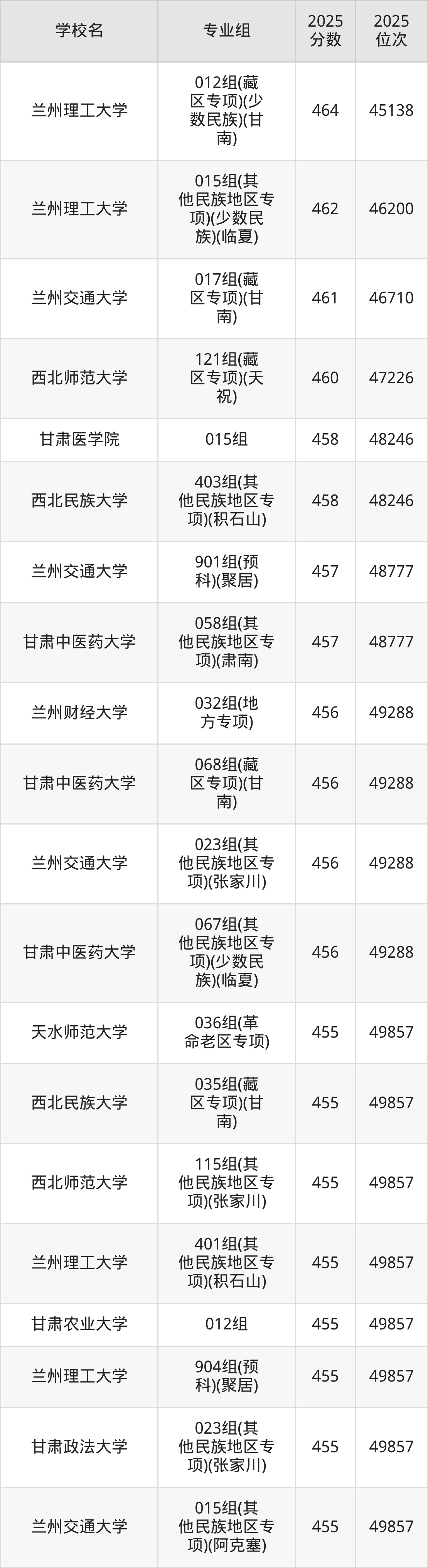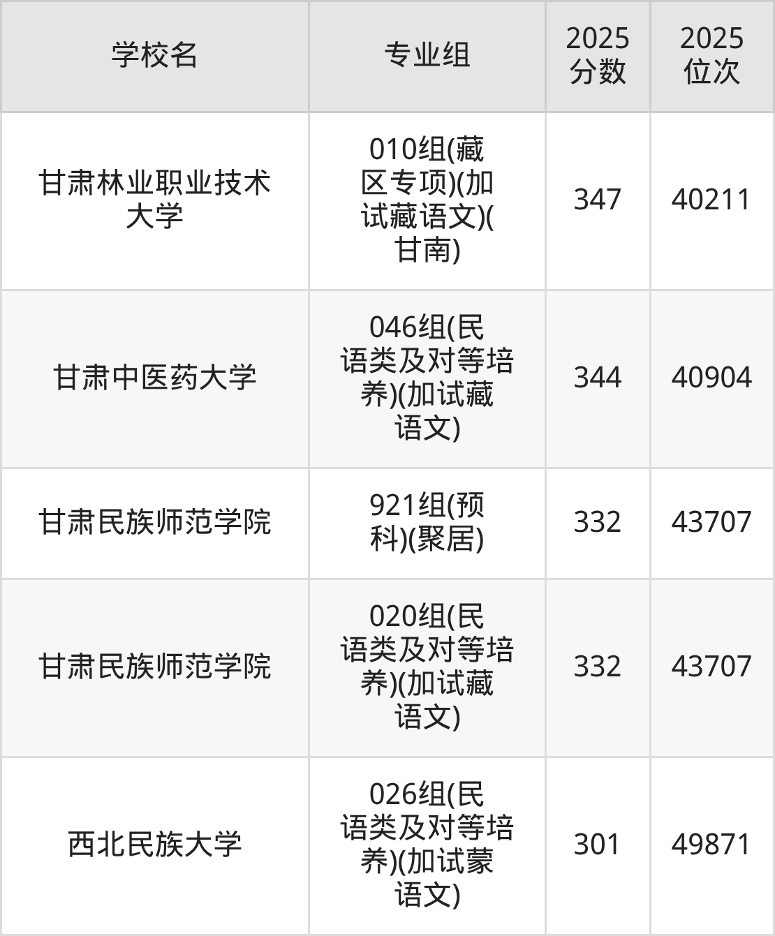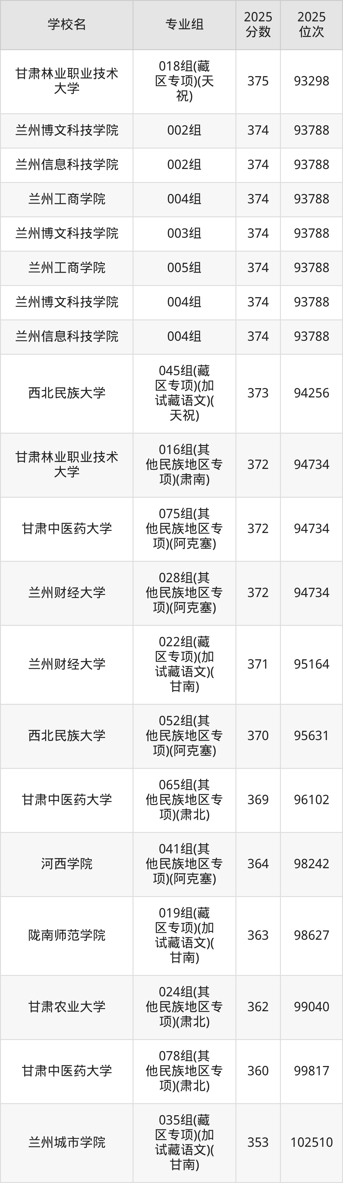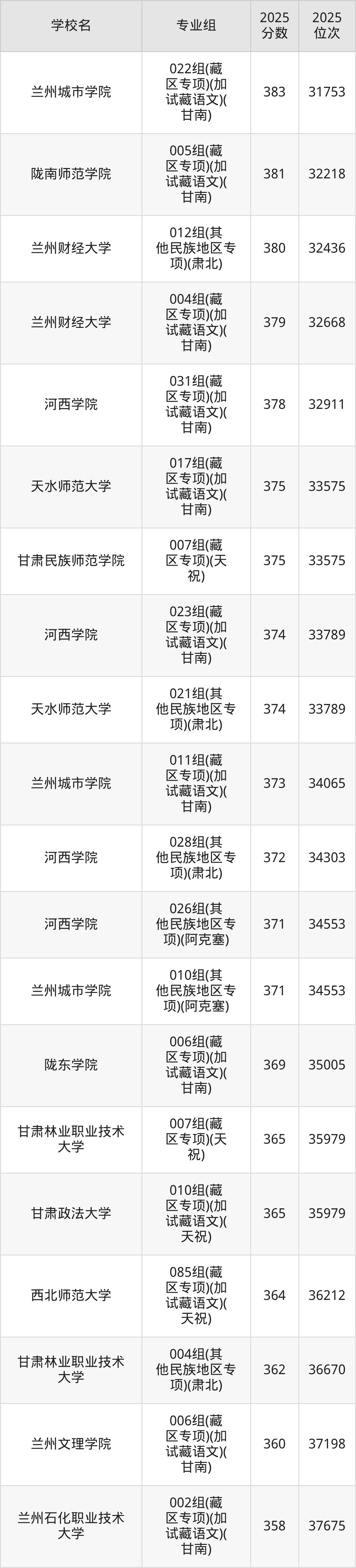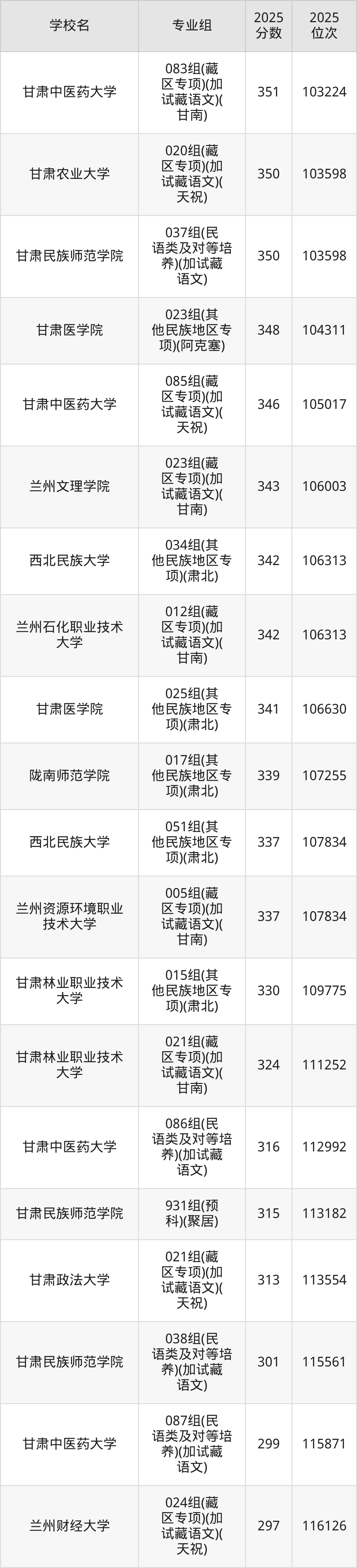 分数线排名最后的本科大学是西北民族大学026组(民语类及对等培养)(加试蒙语文)(301分),除此之外,收分较低的院校还有:甘肃民族师范学院020组(民语类及对等培养)(加试藏语文)332分、甘肃民族师范学院921组(预科)(聚居)332分、甘肃中医药大学046组(民语类及对等培养)(加试藏语文)344分、甘肃林业职业技术大学010组(藏区专项)(加试藏语文)(甘南)347分。