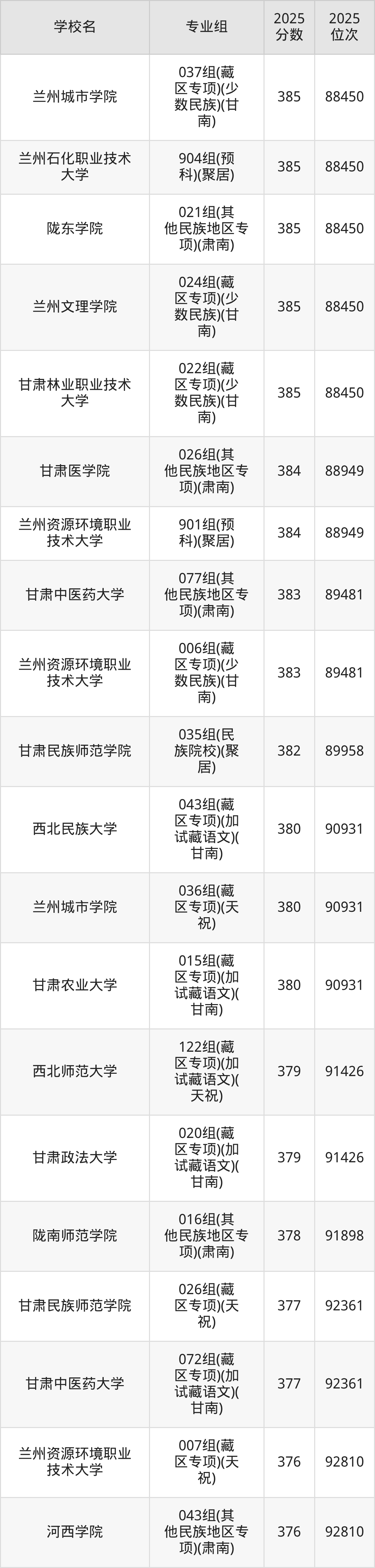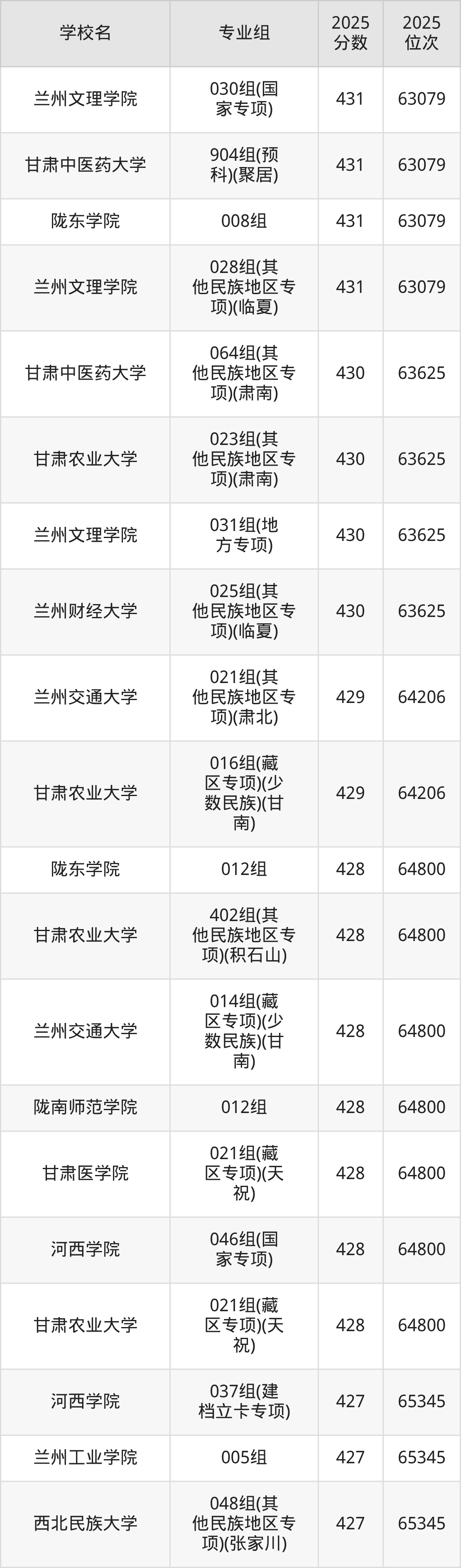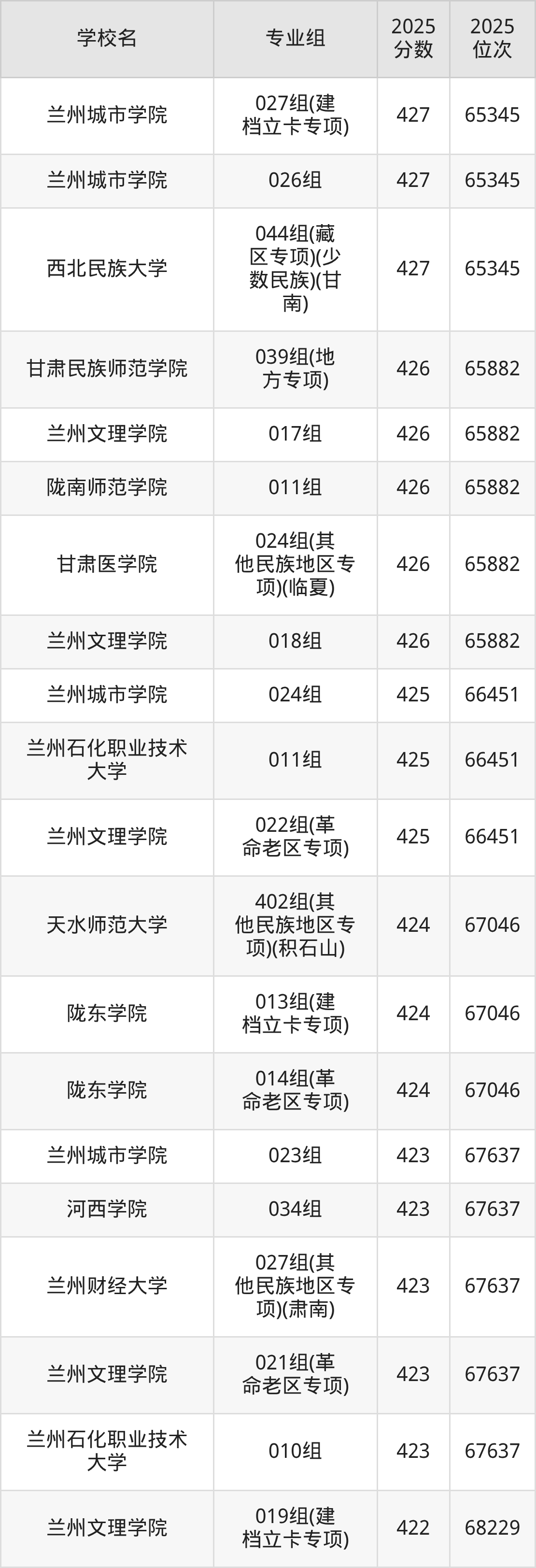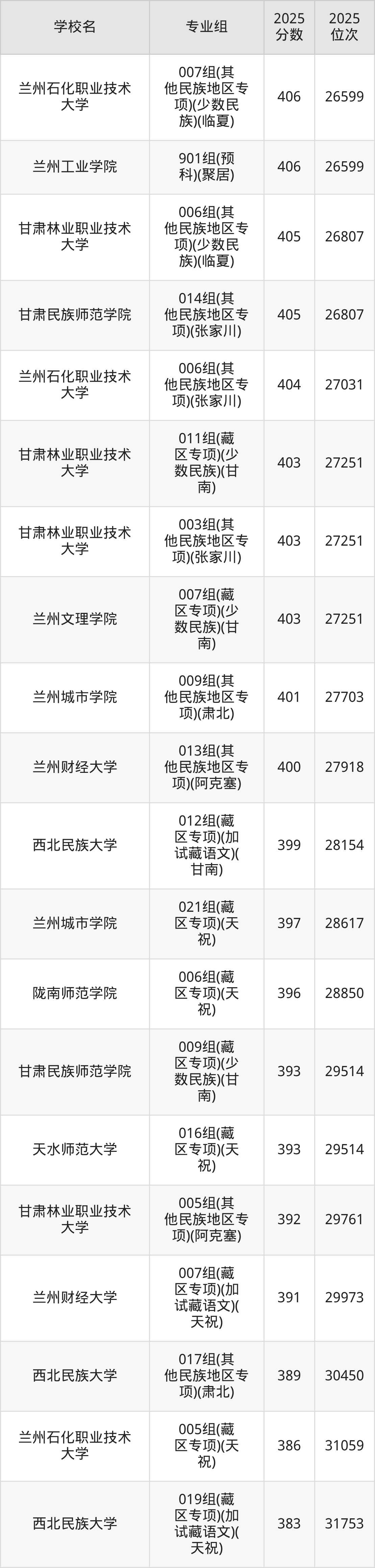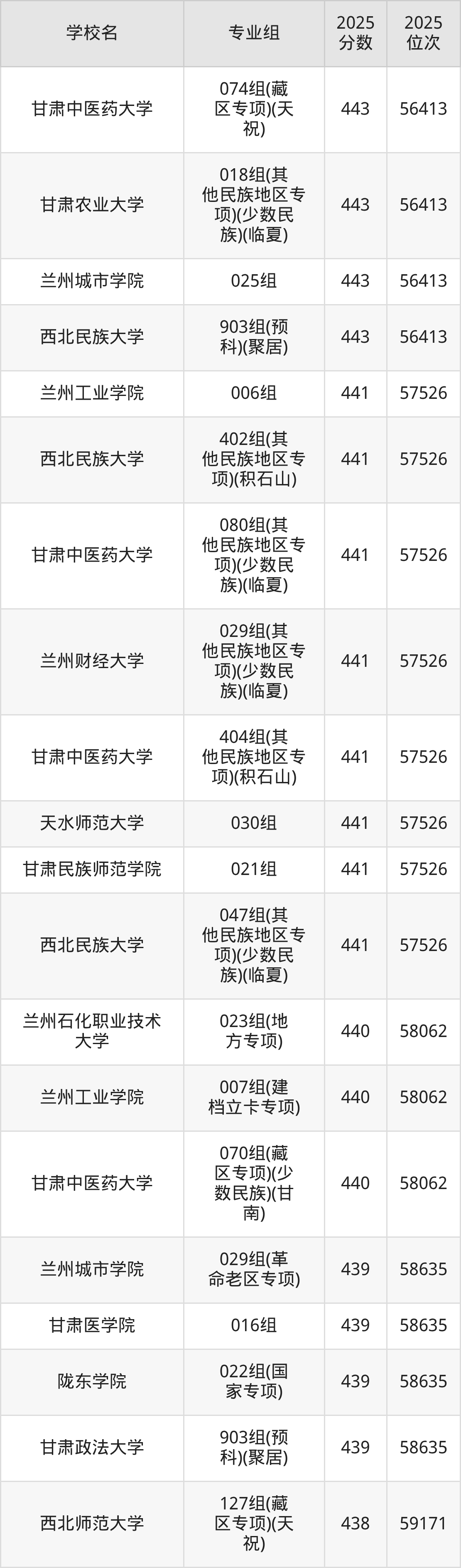 分数线排名最后的本科大学是西北民族大学026组(民语类及对等培养)(加试蒙语文)(301分),除此之外,收分较低的院校还有:甘肃民族师范学院020组(民语类及对等培养)(加试藏语文)332分、甘肃民族师范学院921组(预科)(聚居)332分、甘肃中医药大学046组(民语类及对等培养)(加试藏语文)344分、甘肃林业职业技术大学010组(藏区专项)(加试藏语文)(甘南)347分。