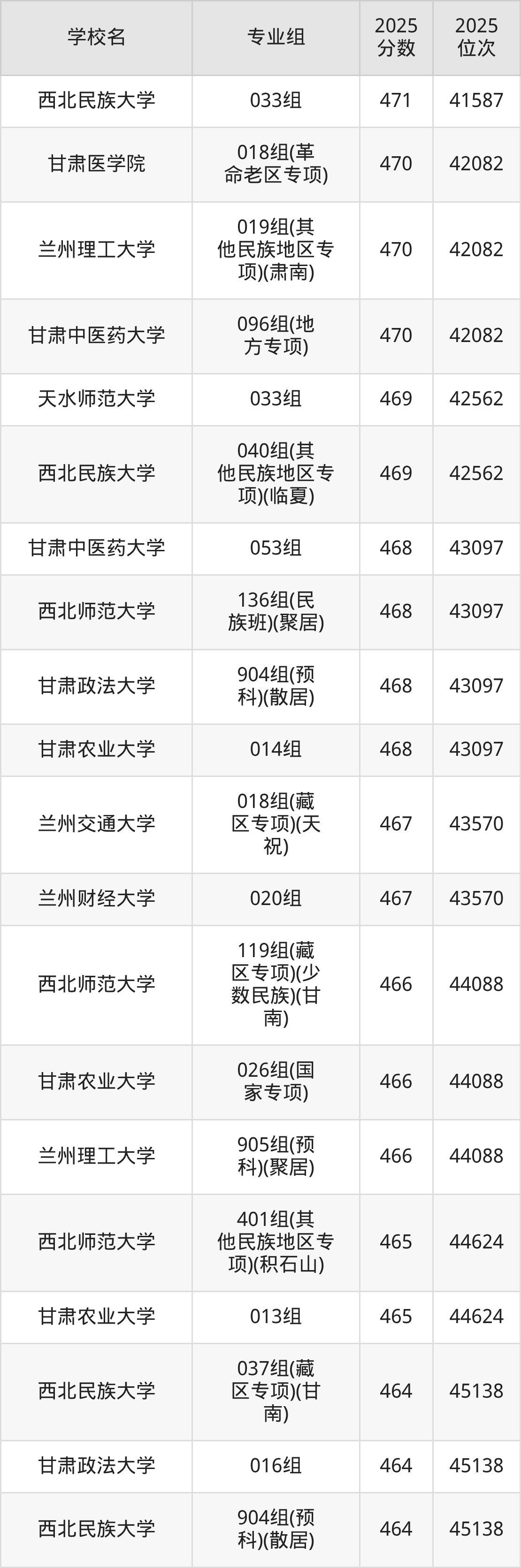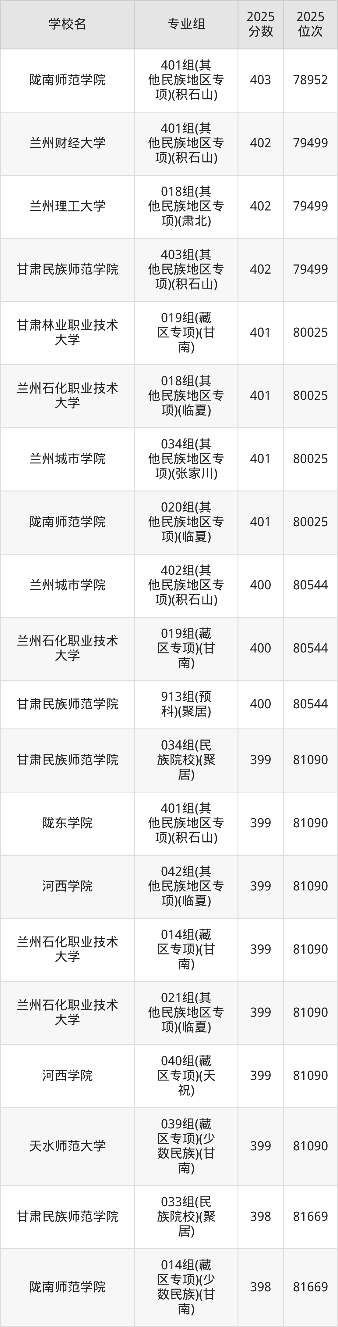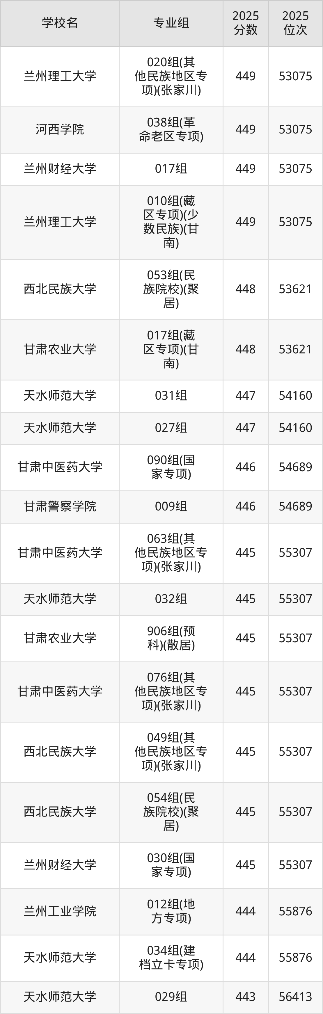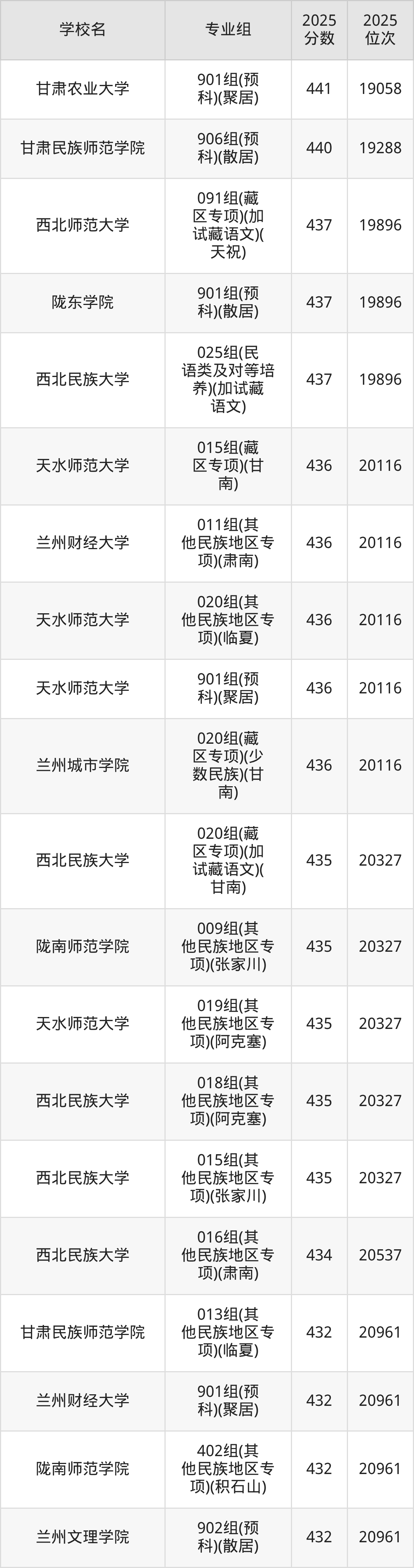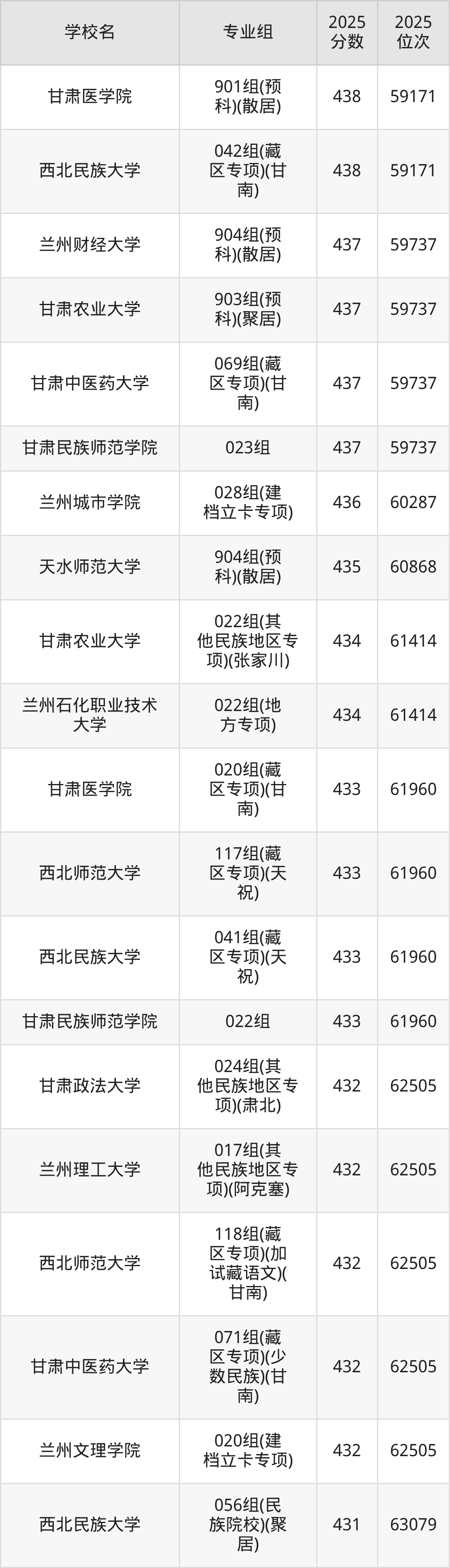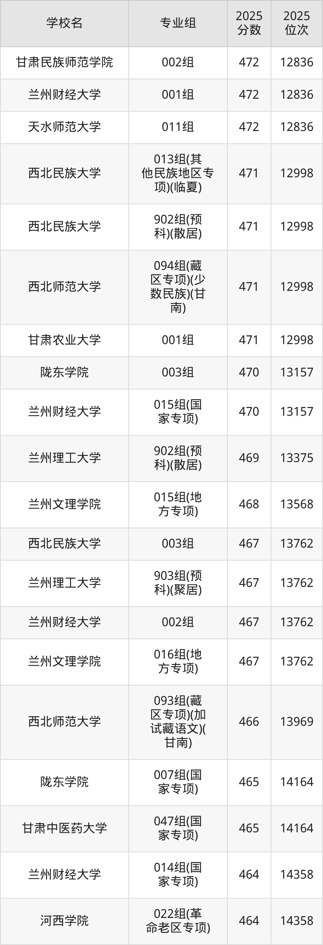 分数线排名最后的本科大学是西北民族大学026组(民语类及对等培养)(加试蒙语文)(301分),除此之外,收分较低的院校还有:甘肃民族师范学院020组(民语类及对等培养)(加试藏语文)332分、甘肃民族师范学院921组(预科)(聚居)332分、甘肃中医药大学046组(民语类及对等培养)(加试藏语文)344分、甘肃林业职业技术大学010组(藏区专项)(加试藏语文)(甘南)347分。