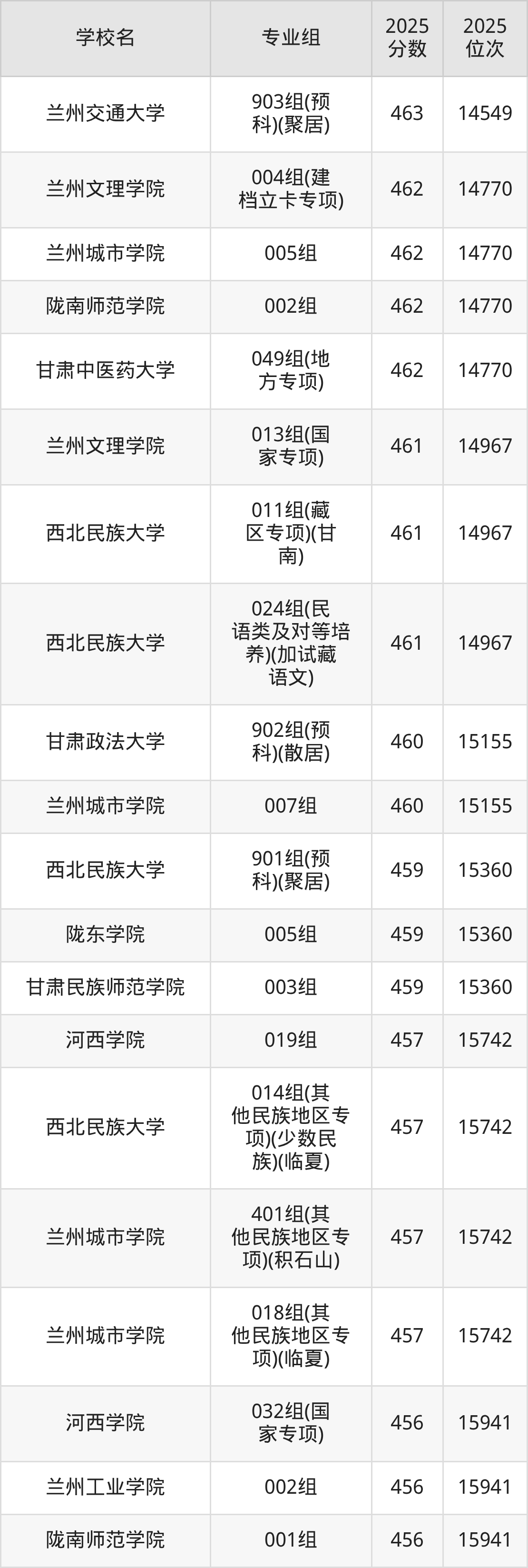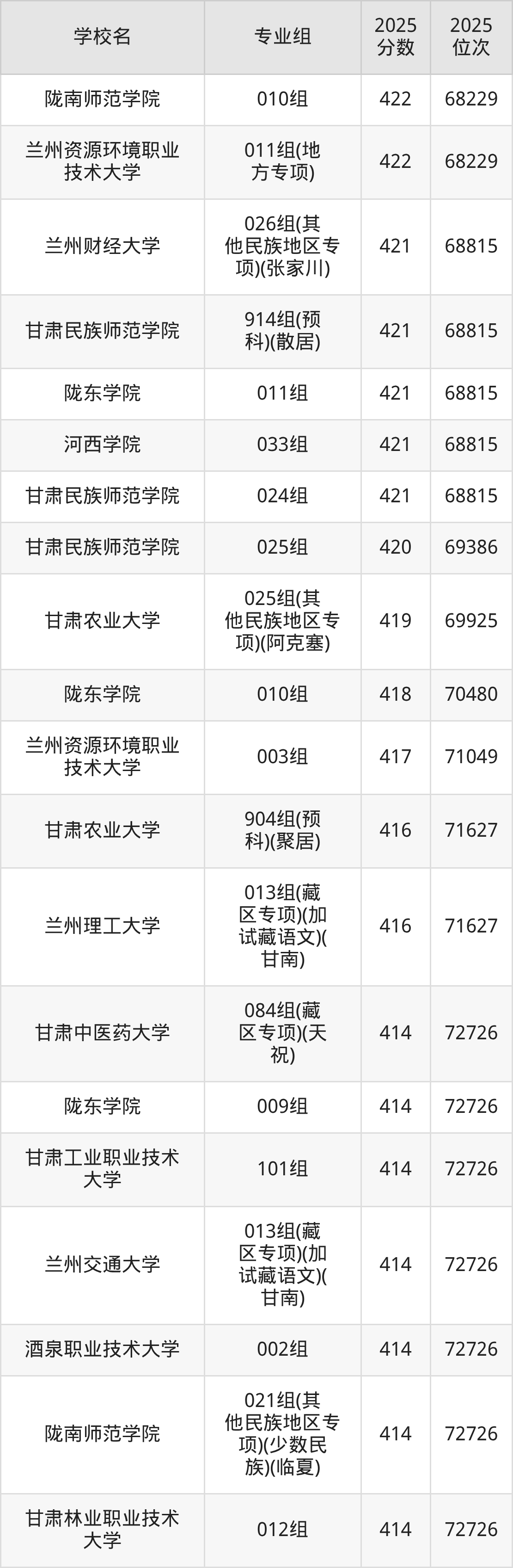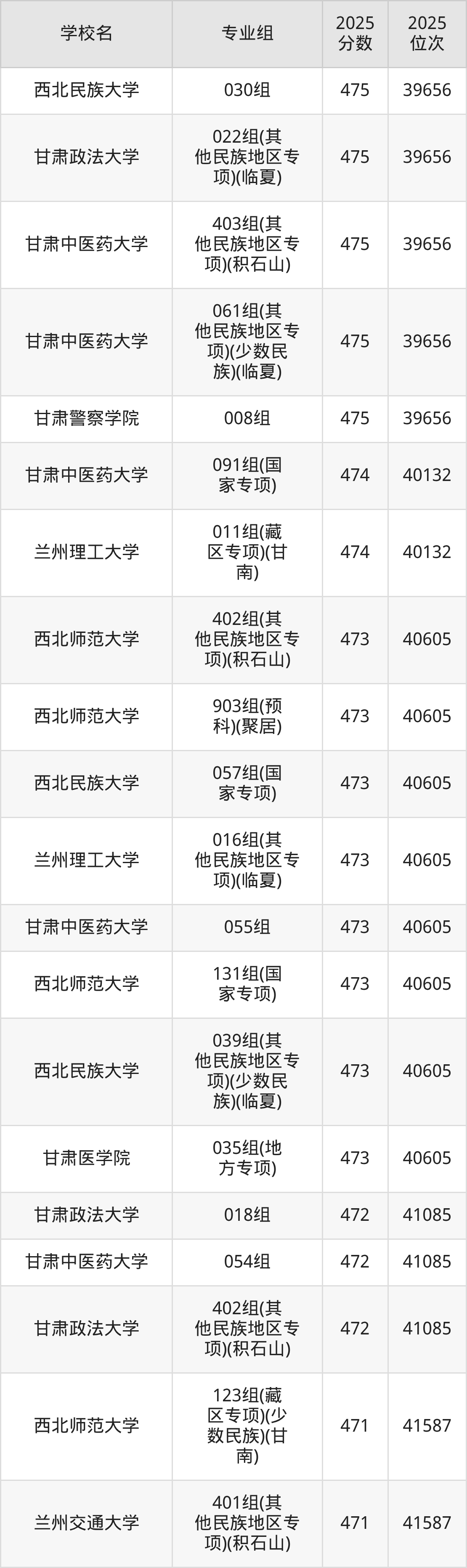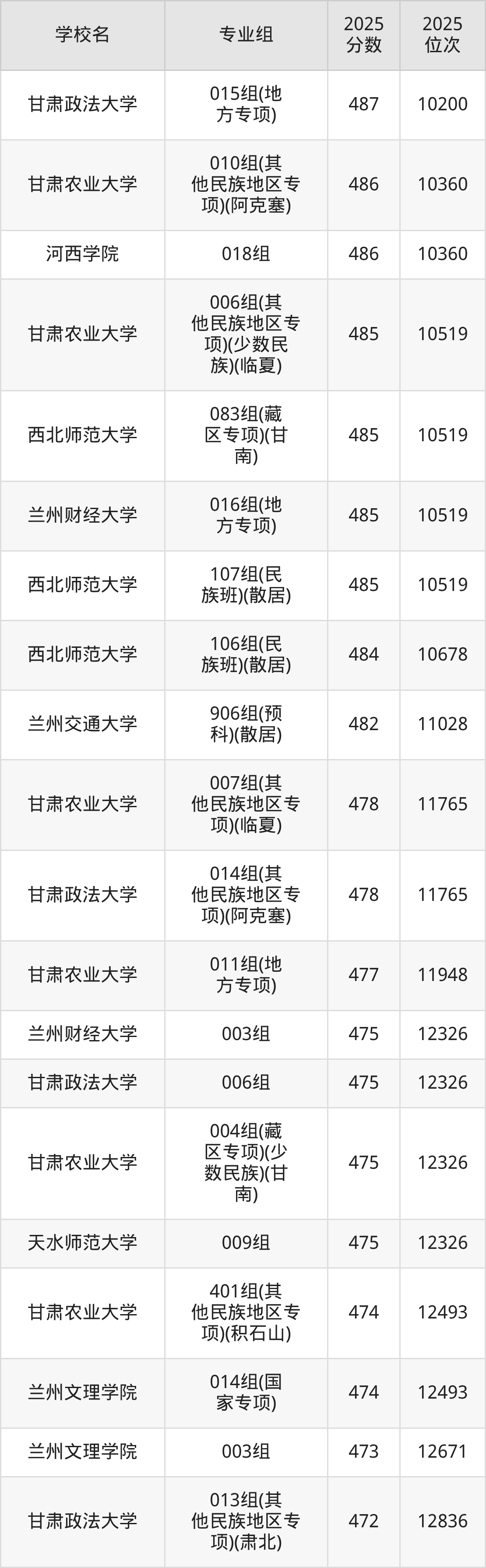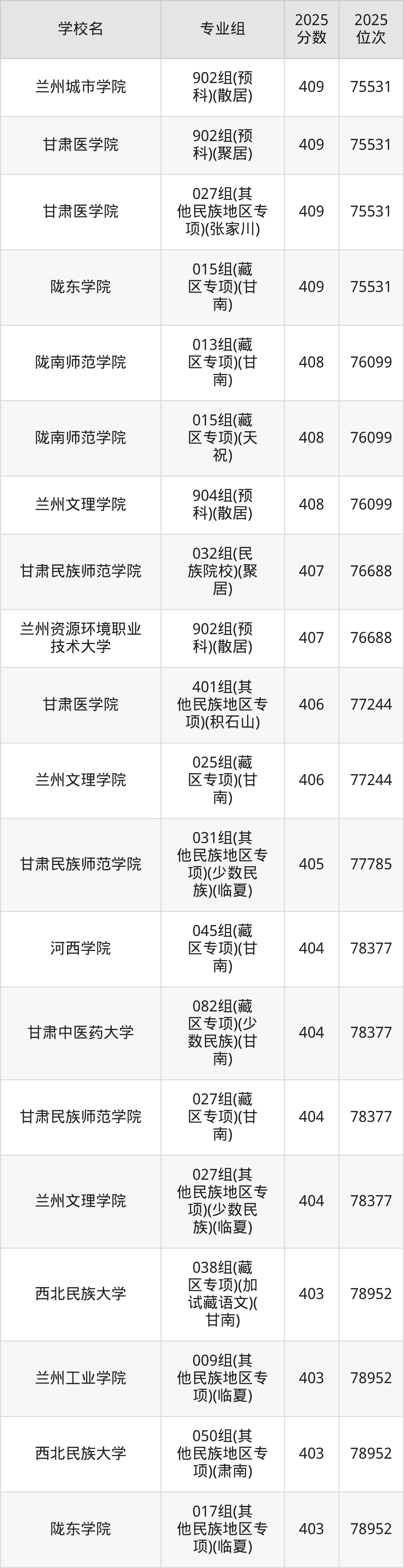 分数线排名最后的本科大学是西北民族大学026组(民语类及对等培养)(加试蒙语文)(301分),除此之外,收分较低的院校还有:甘肃民族师范学院020组(民语类及对等培养)(加试藏语文)332分、甘肃民族师范学院921组(预科)(聚居)332分、甘肃中医药大学046组(民语类及对等培养)(加试藏语文)344分、甘肃林业职业技术大学010组(藏区专项)(加试藏语文)(甘南)347分。