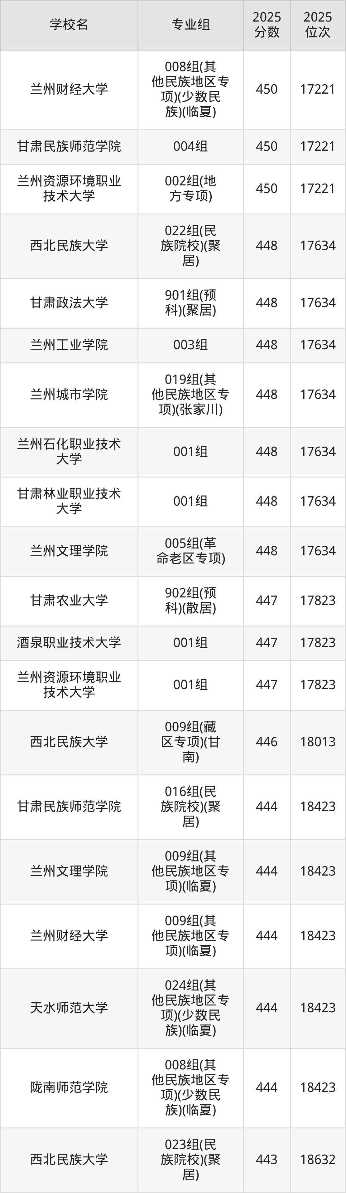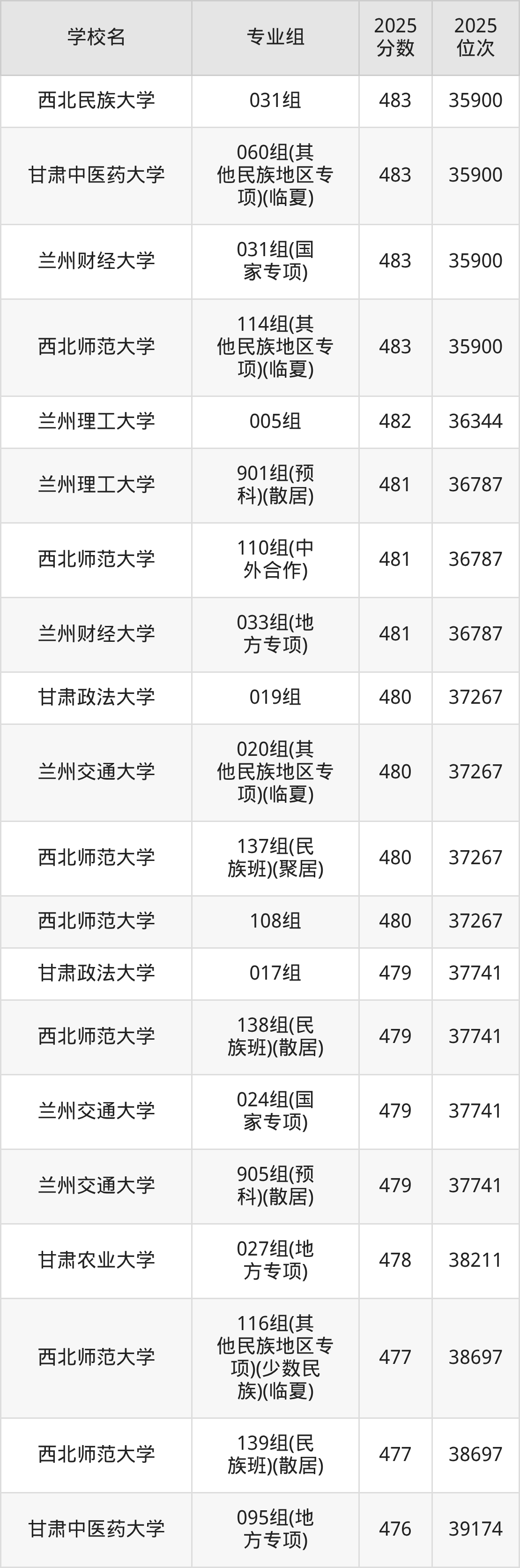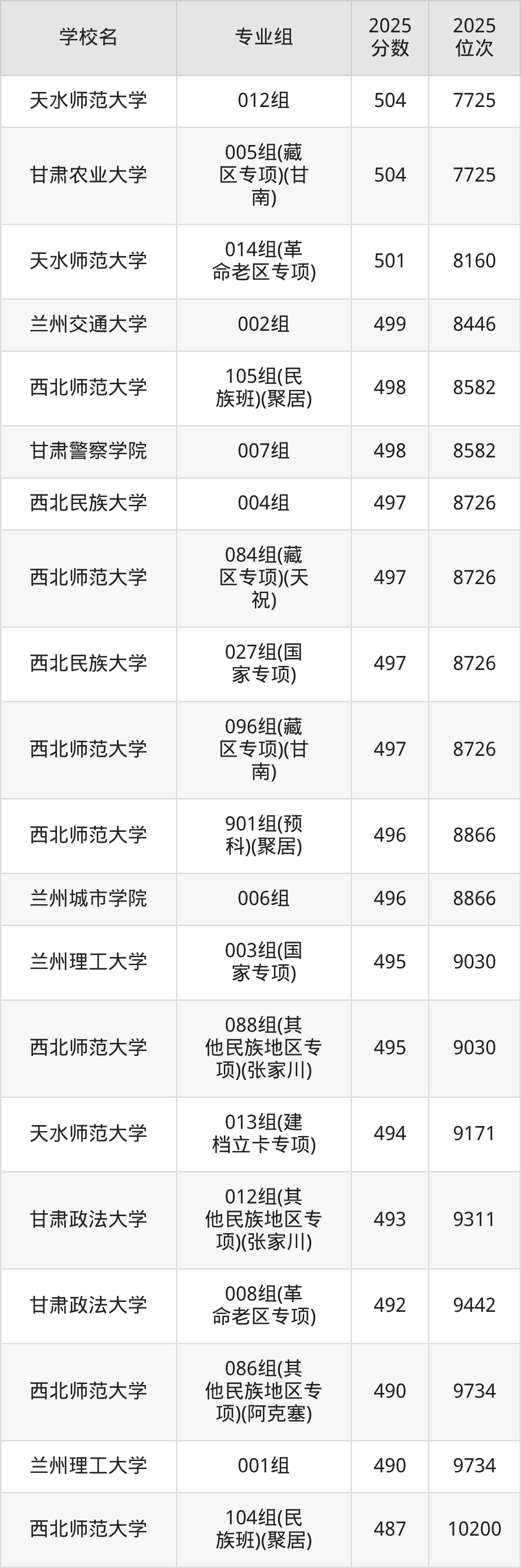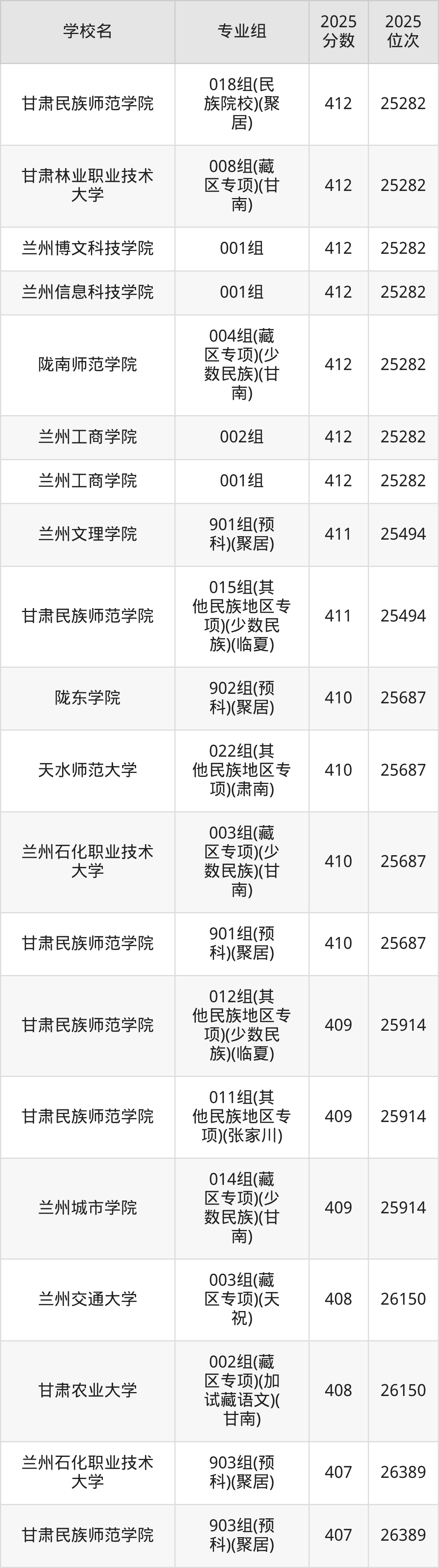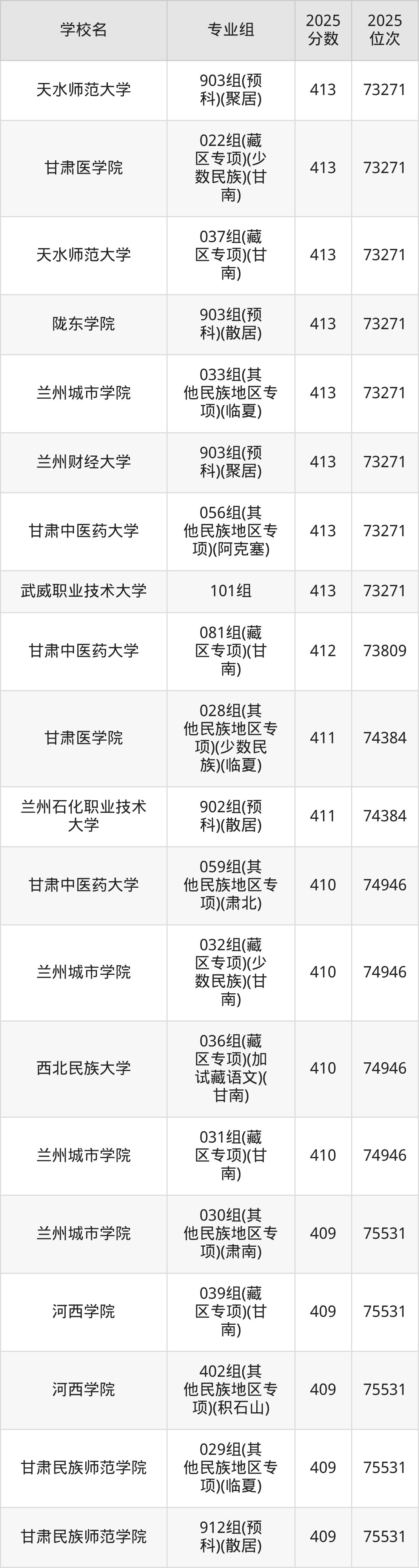 分数线排名最后的本科大学是西北民族大学026组(民语类及对等培养)(加试蒙语文)(301分),除此之外,收分较低的院校还有:甘肃民族师范学院020组(民语类及对等培养)(加试藏语文)332分、甘肃民族师范学院921组(预科)(聚居)332分、甘肃中医药大学046组(民语类及对等培养)(加试藏语文)344分、甘肃林业职业技术大学010组(藏区专项)(加试藏语文)(甘南)347分。