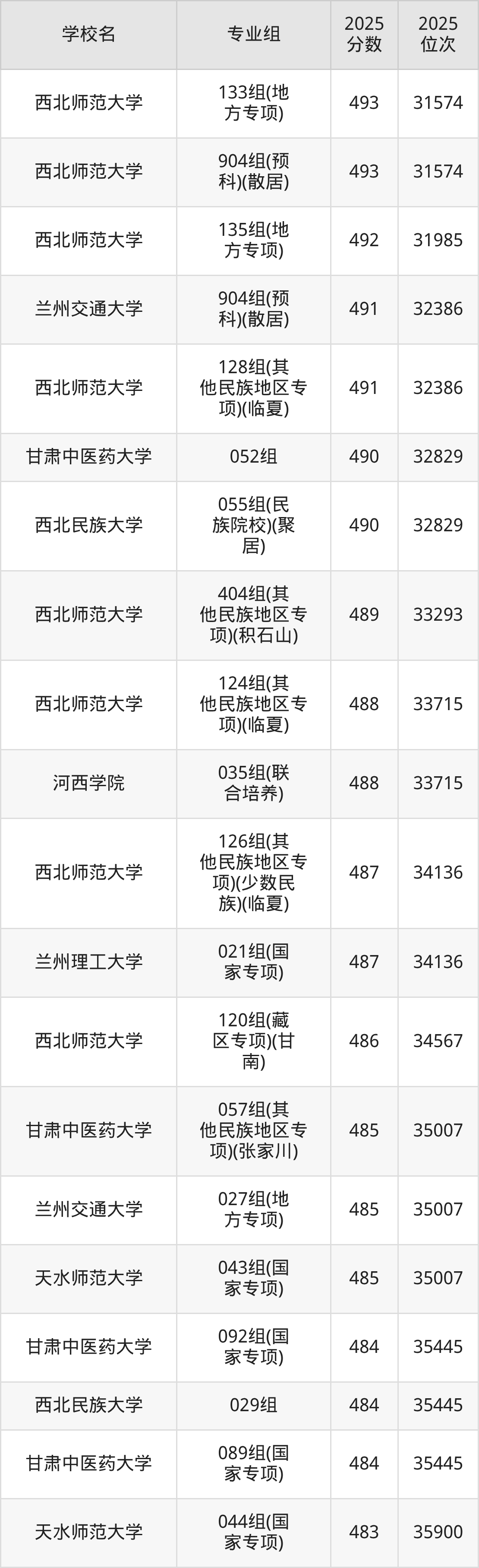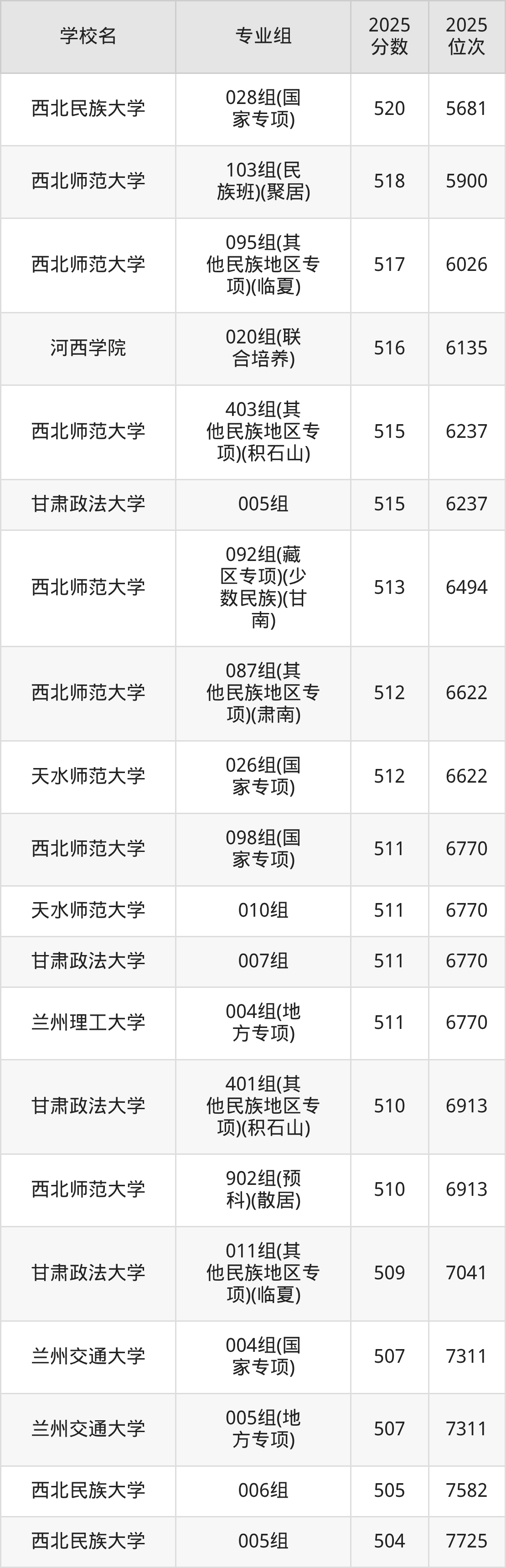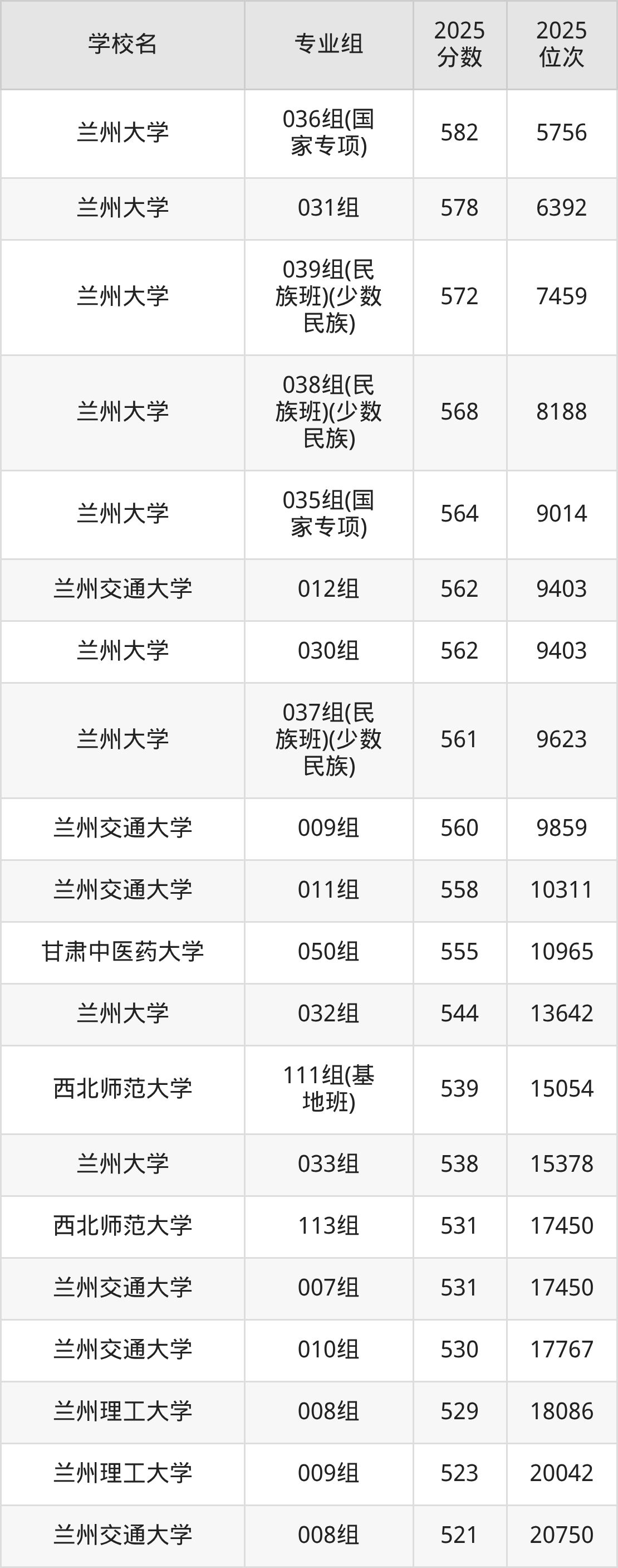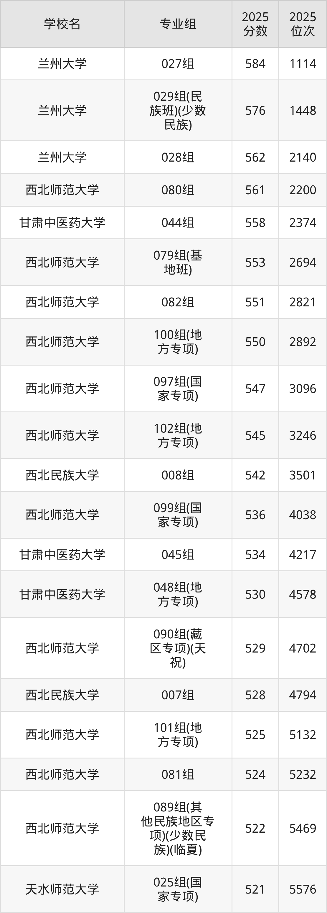 其中,分数线排名第一的本科大学是兰州大学027组,除此之外,收分较高的院校还有:兰州大学029组(民族班)(少数民族)576分、兰州大学028组562分、西北师范大学080组561分、甘肃中医药大学044组558分。
