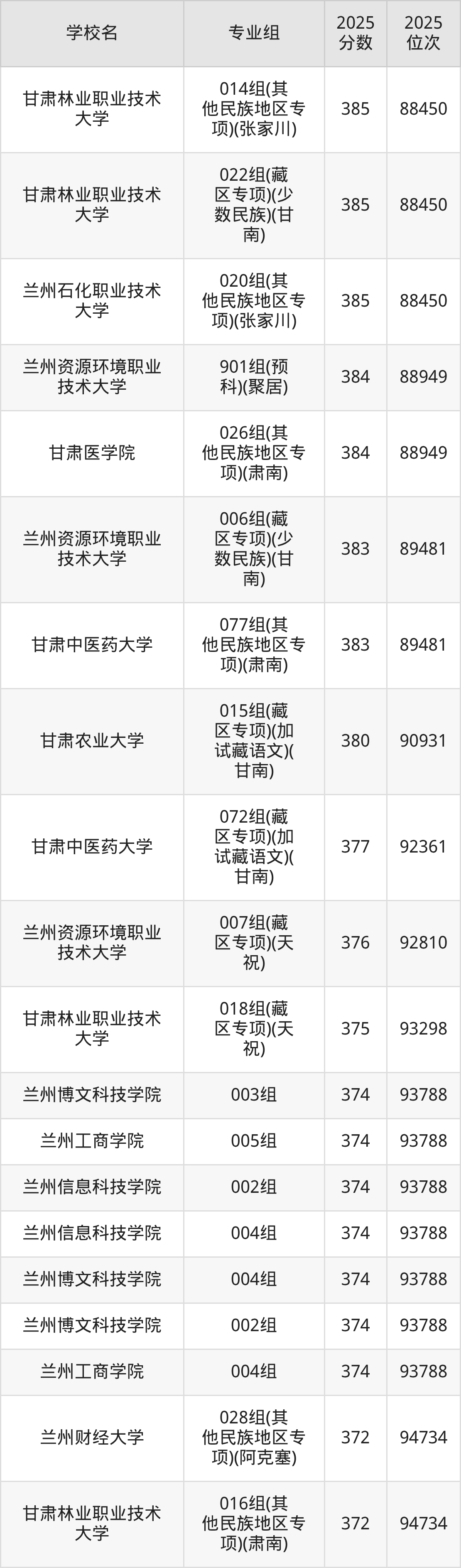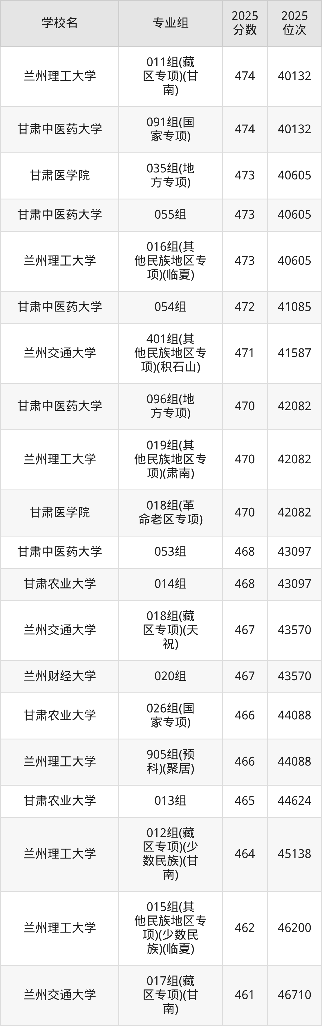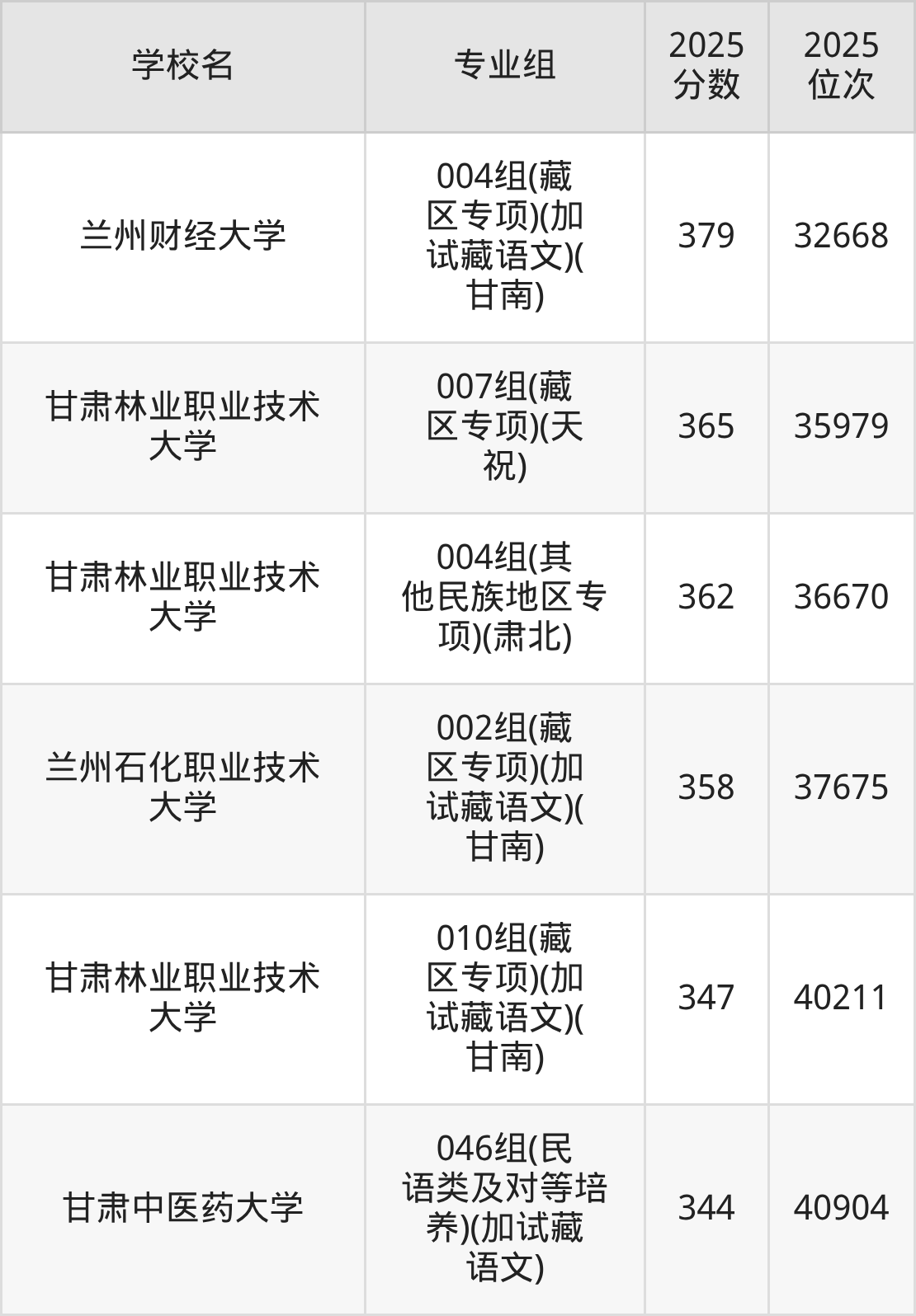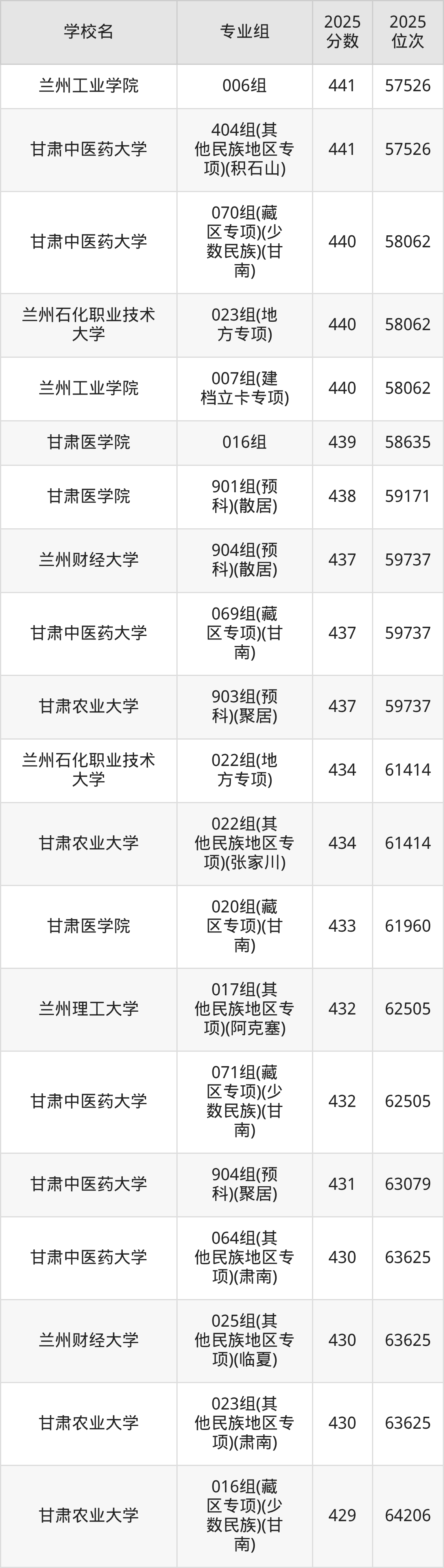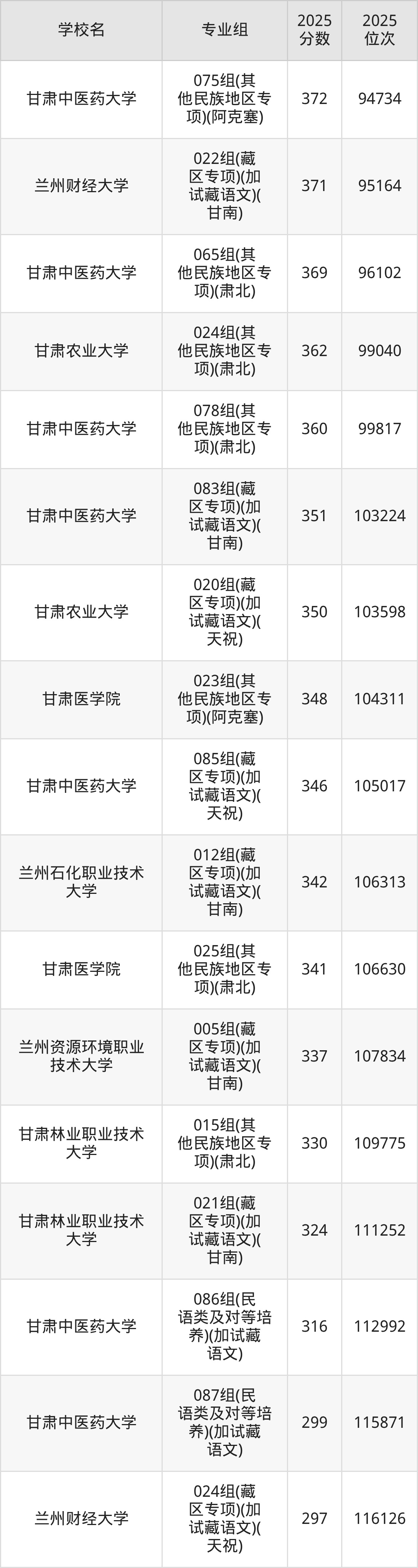 分数线排名最后的理科大学是甘肃中医药大学046组(民语类及对等培养)(加试藏语文)(344分),除此之外,收分较低的院校还有:甘肃林业职业技术大学010组(藏区专项)(加试藏语文)(甘南)347分、兰州石化职业技术大学002组(藏区专项)(加试藏语文)(甘南)358分、甘肃林业职业技术大学004组(其他民族地区专项)(肃北)362分、甘肃林业职业技术大学007组(藏区专项)(天祝)365分。