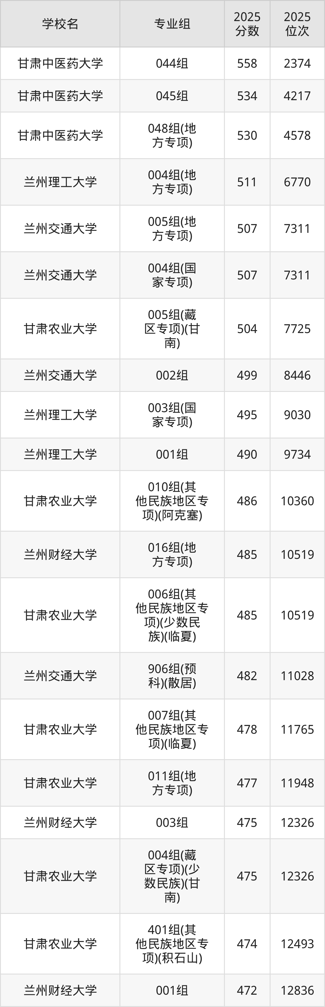 其中,分数线排名第一的理科大学是甘肃中医药大学044组,除此之外,收分较高的院校还有:甘肃中医药大学045组534分、甘肃中医药大学048组(地方专项)530分、兰州理工大学004组(地方专项)511分、兰州交通大学005组(地方专项)507分。