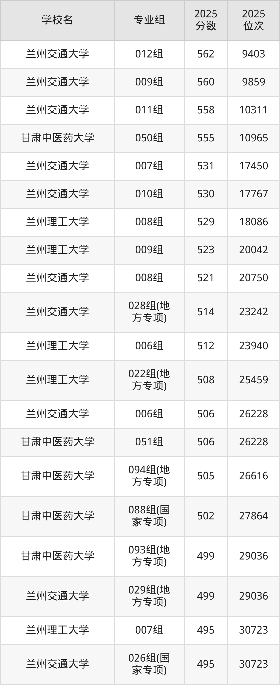 其中,分数线排名第一的理科大学是兰州交通大学012组,除此之外,收分较高的院校还有:兰州交通大学009组560分、兰州交通大学011组558分、甘肃中医药大学050组555分、兰州交通大学007组531分。
