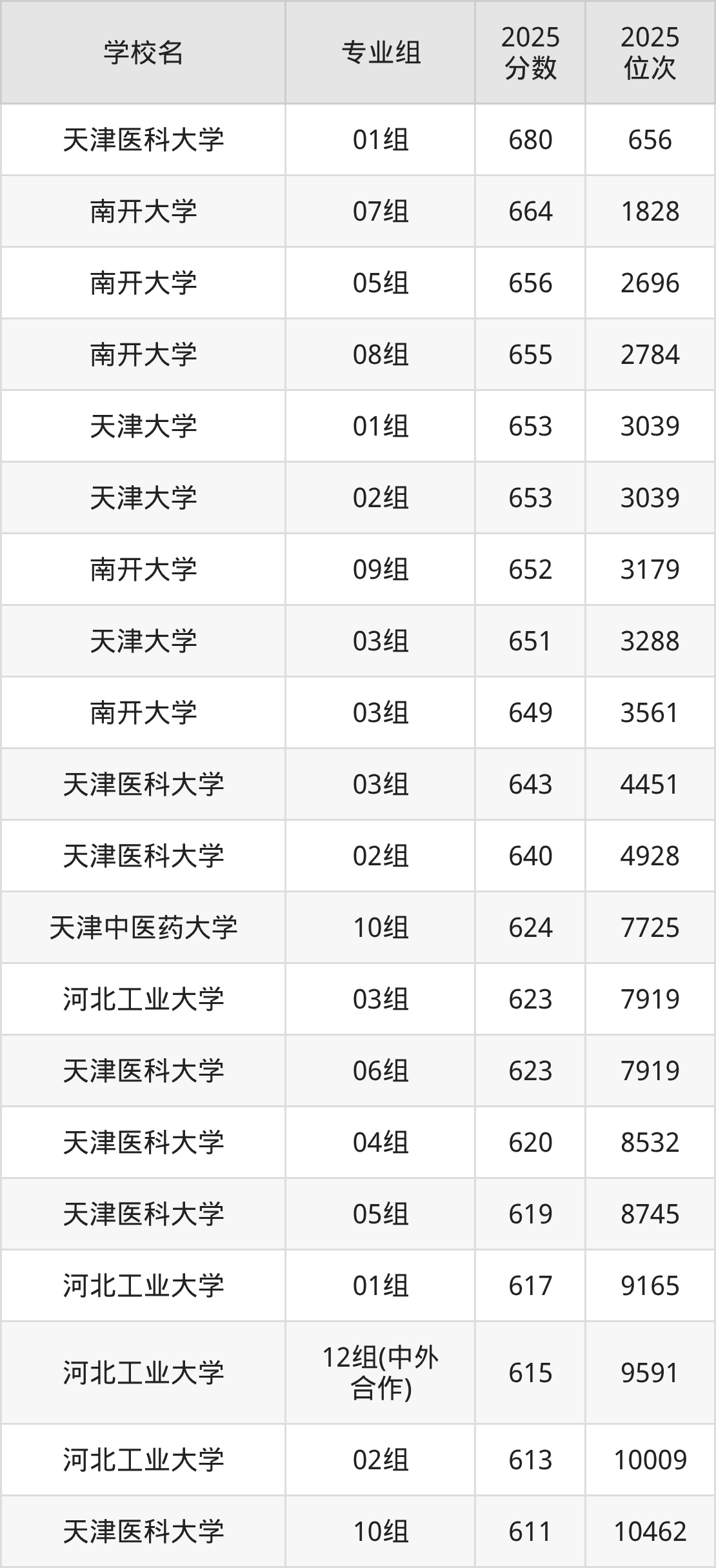 其中,分数线排名第一的重点大学是天津医科大学01组,除此之外,收分较高的院校还有:南开大学07组664分、南开大学05组656分、南开大学08组655分、天津大学01组653分。