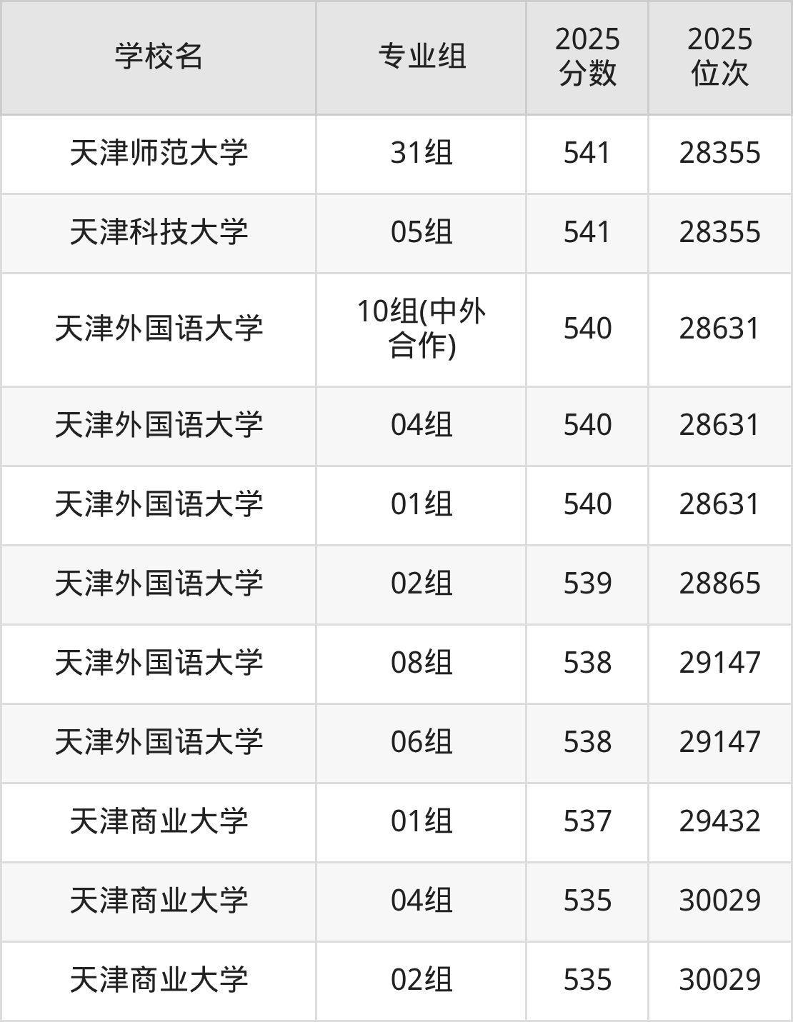 分数线排名最后的重点大学是天津商业大学04组(535分)、天津商业大学02组(535分),除此之外,收分较低的院校还有:天津商业大学01组537分、天津外国语大学06组538分、天津外国语大学08组538分、天津外国语大学02组539分。